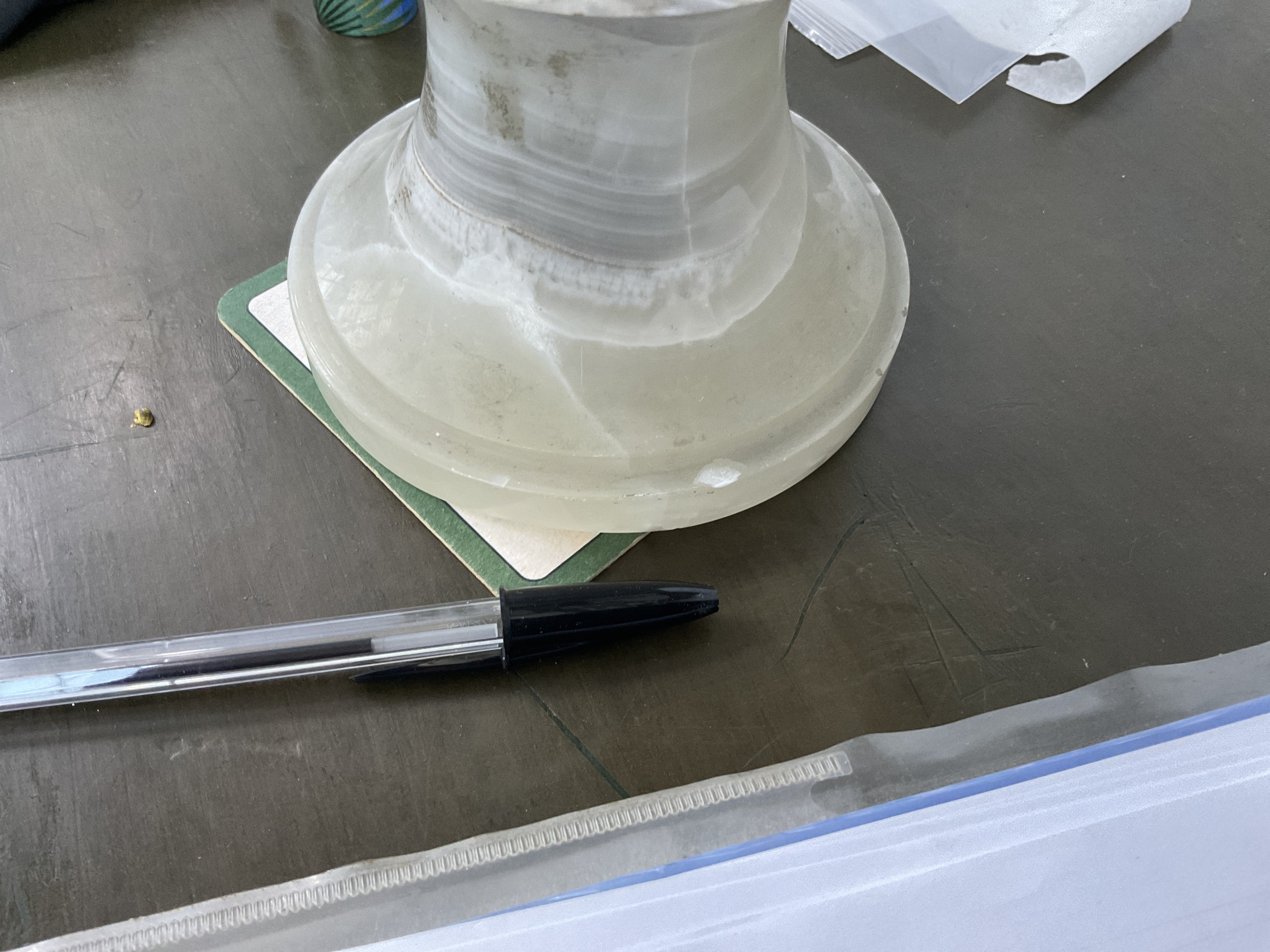 Generally in good condition with patination and marks consistent with age. Small knicks to the edge of the base, with one repair and one larger chip as photographed.