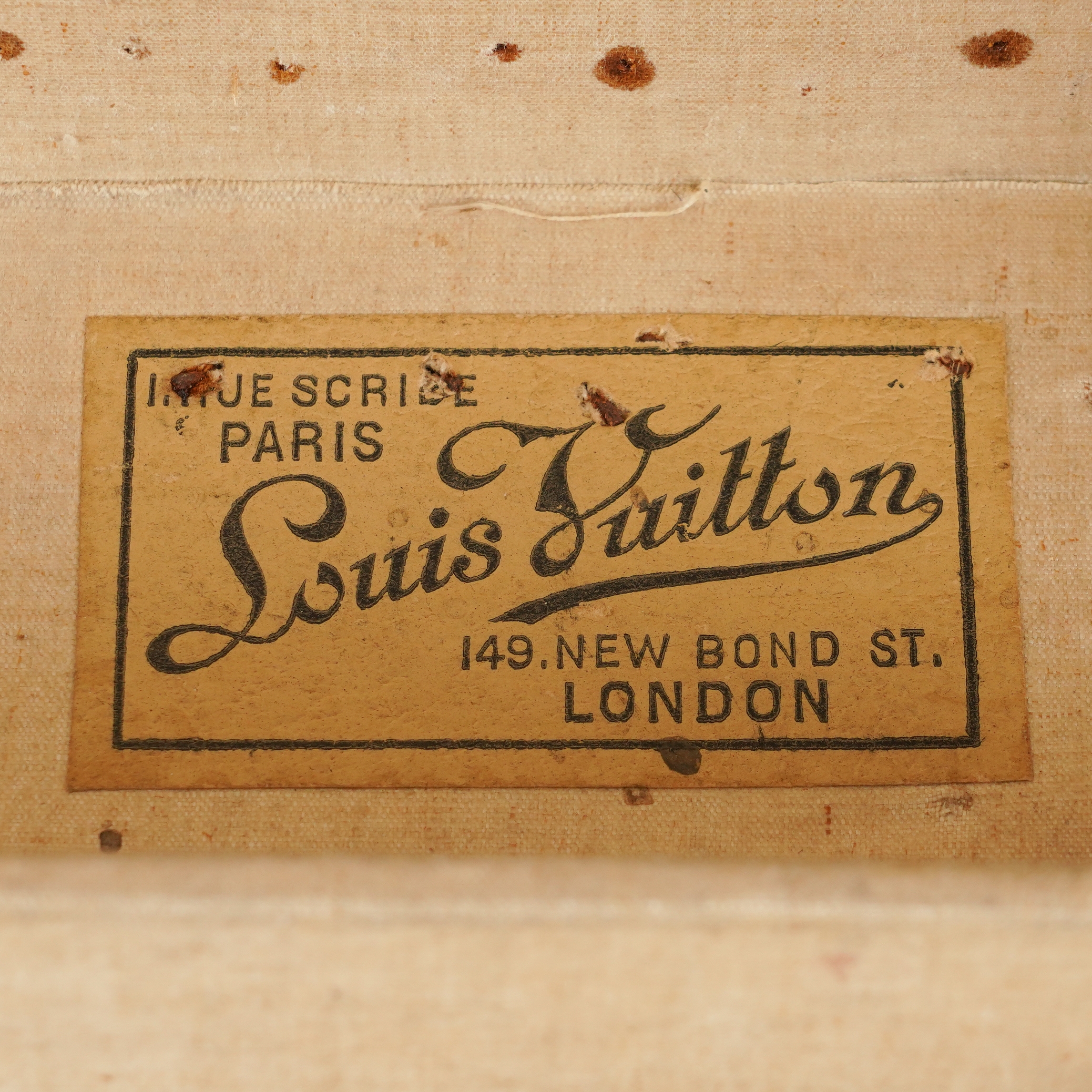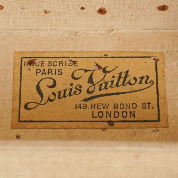 The oblong case with leather edging, later hardware, with cream interior liner and removable drawer, with Louis Vuitton label to the interior of the lid and serial number 142412, 101cm wide x 51cm deep x 26cm high