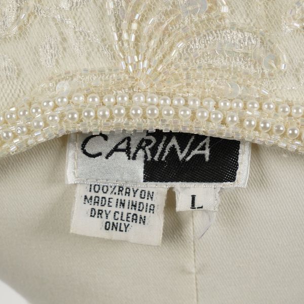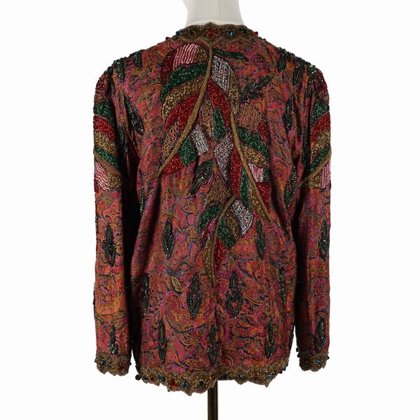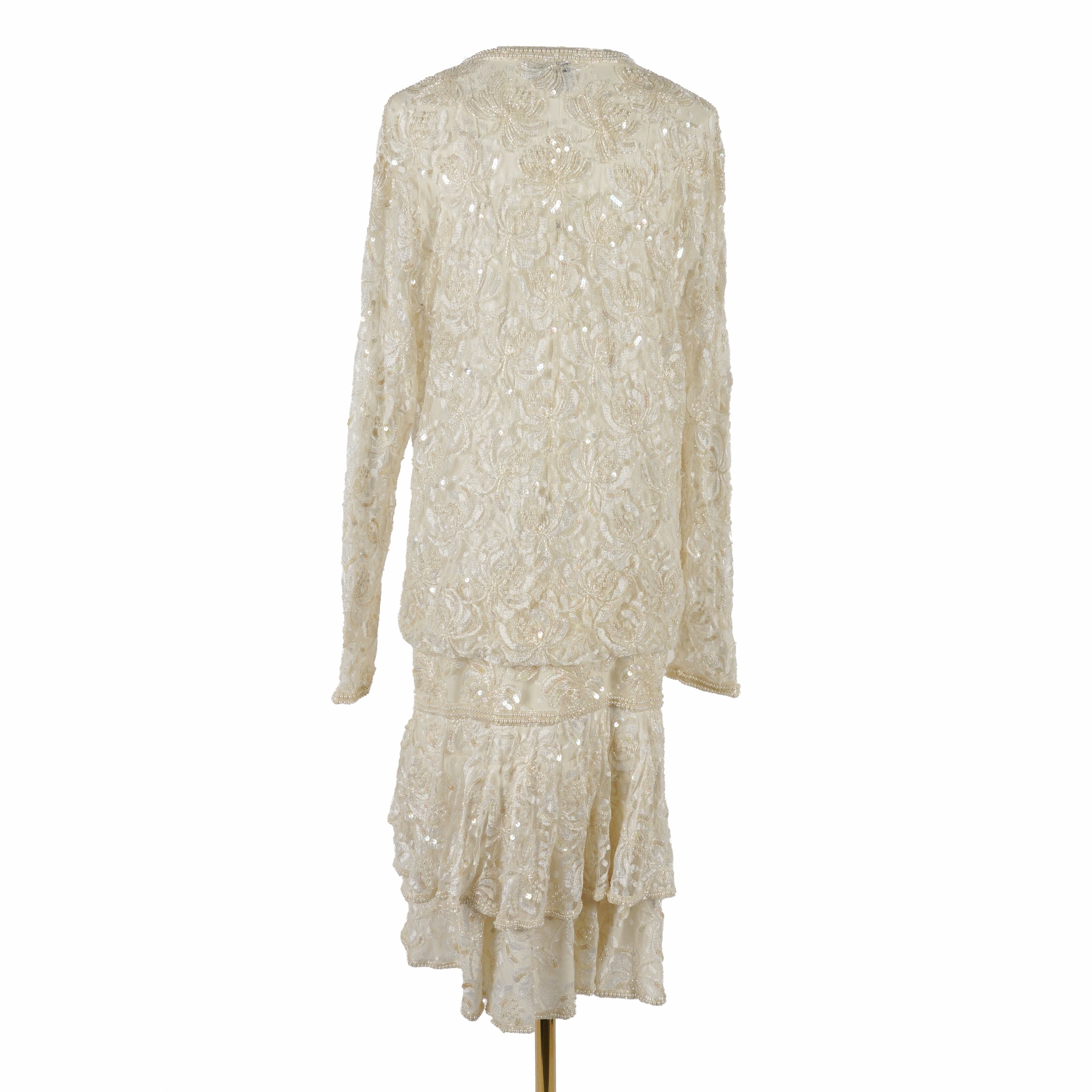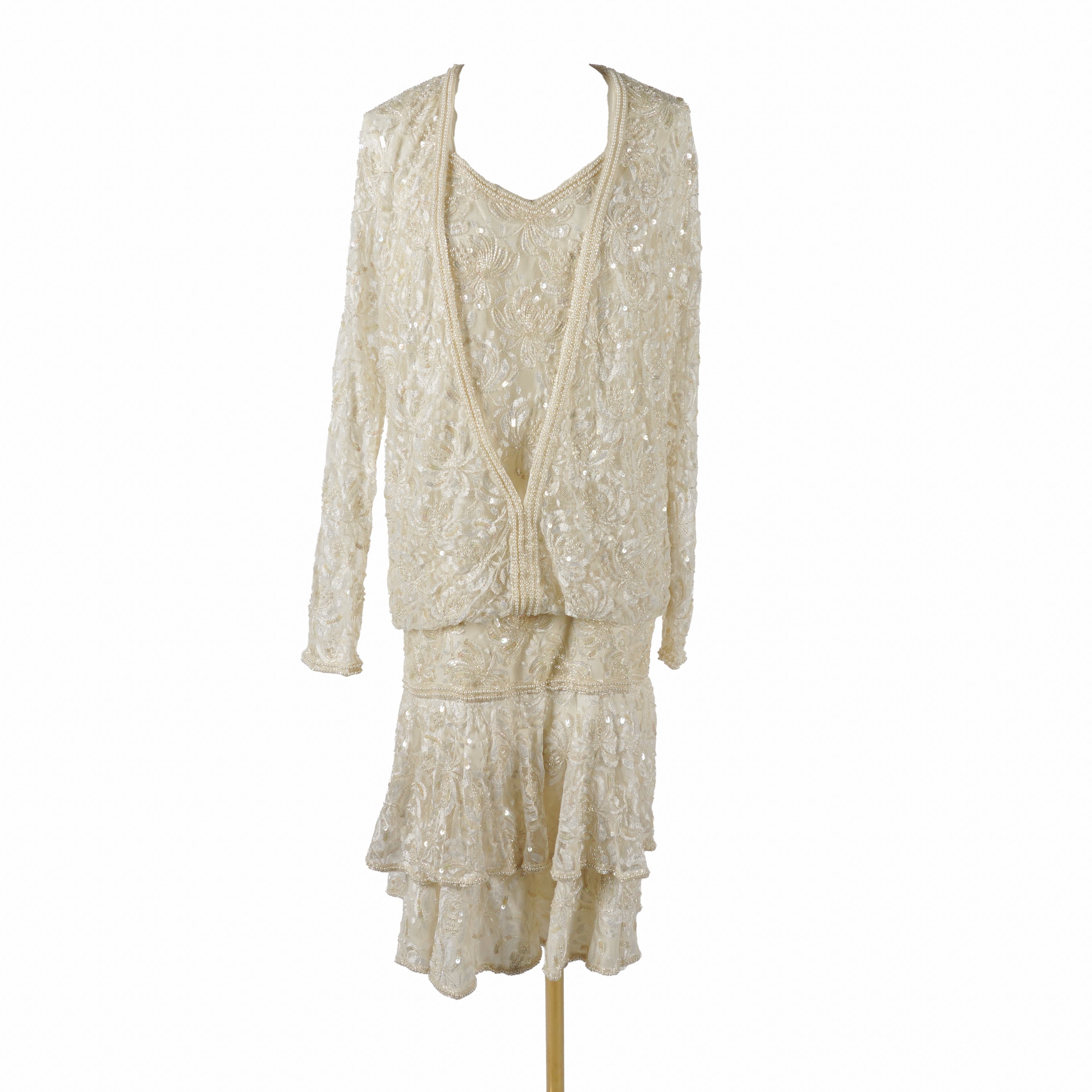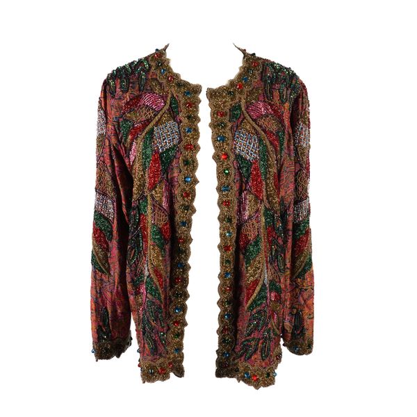 The Carina dress with attached long sleeve cardigan, size L; Together with a richly embellished silk jacket by Precious Moments, size M, and a mini dress by Frank Usher, size L