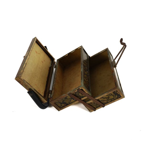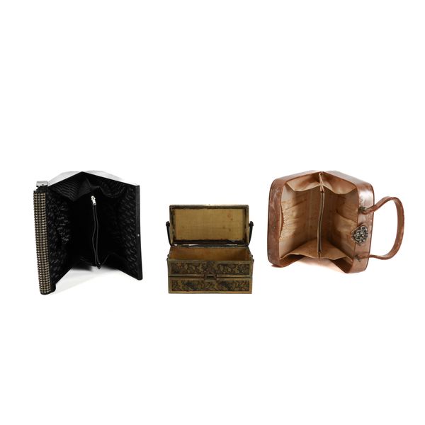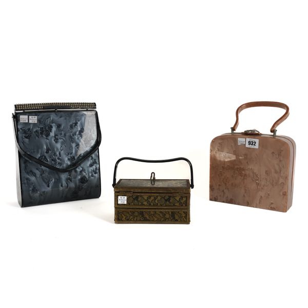 The grey lucite bag with paste set clasp top and swing handle, the lining stamped with ‘Vamos Laster’, 25cm high excluding handle; Together with a beige lucite bag with paste-set cartouche and clasp, with swing handle, 17.5cm high, and a two tiered lace effect box bag, 8cm high