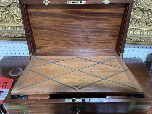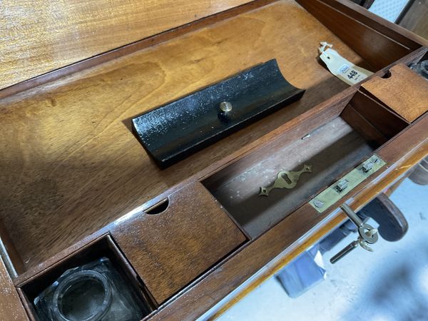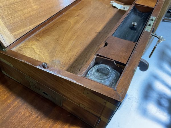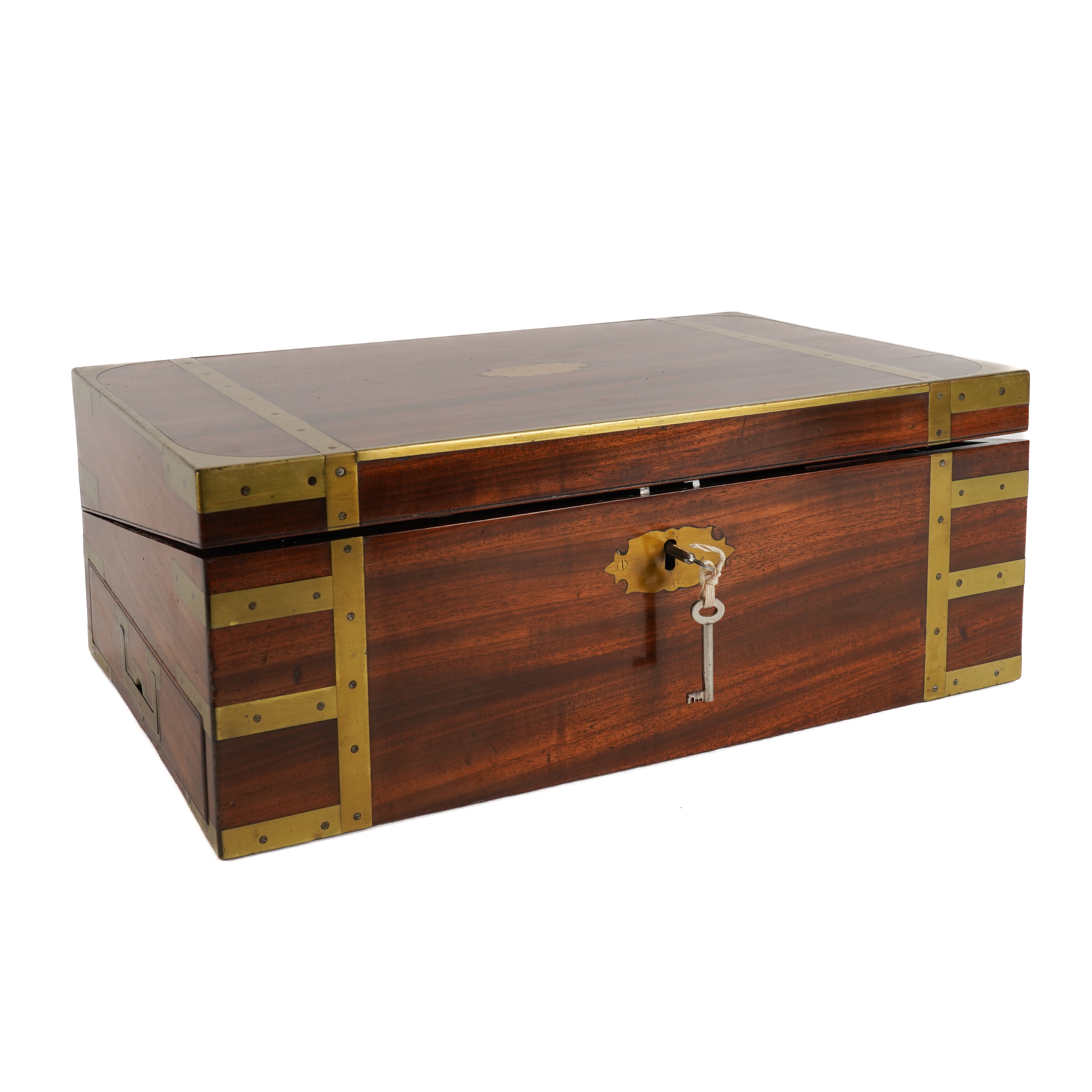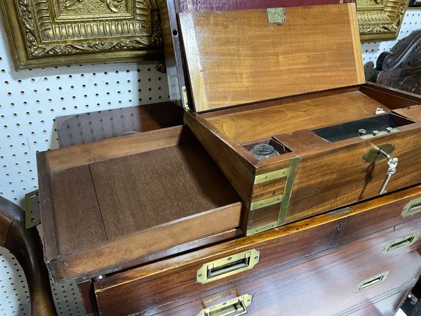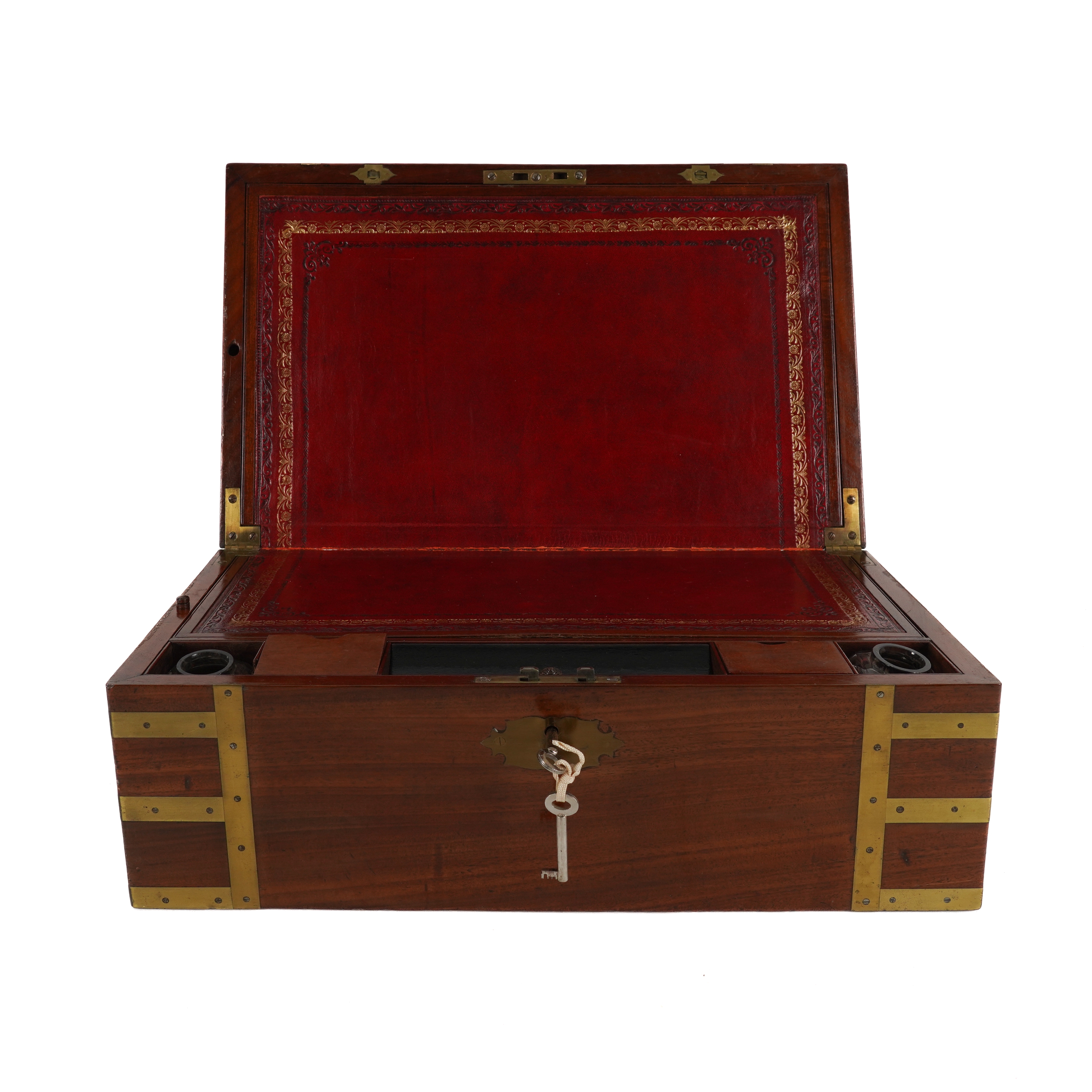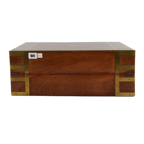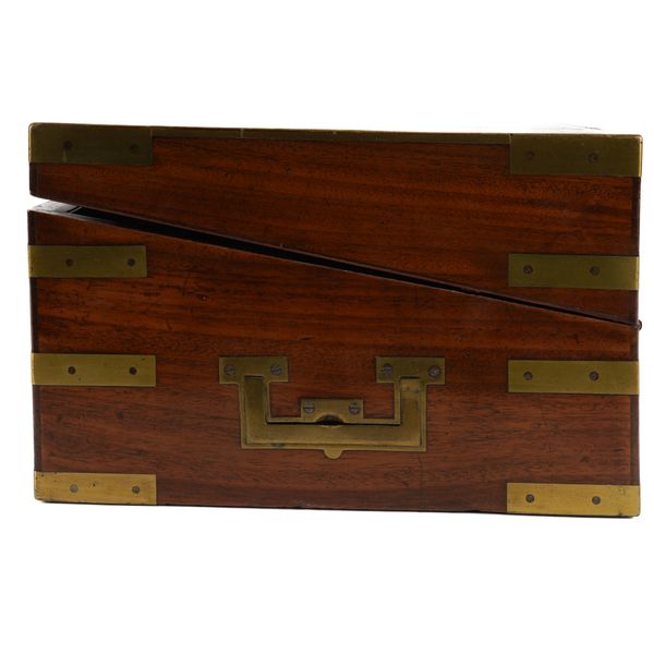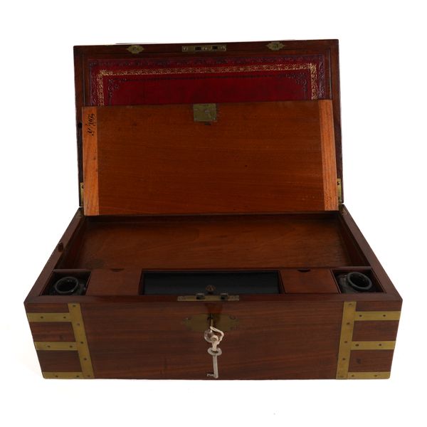 A CAMPAIGN BRASS BOUND MAHOGANY PORTABLE WRITING SLOPE