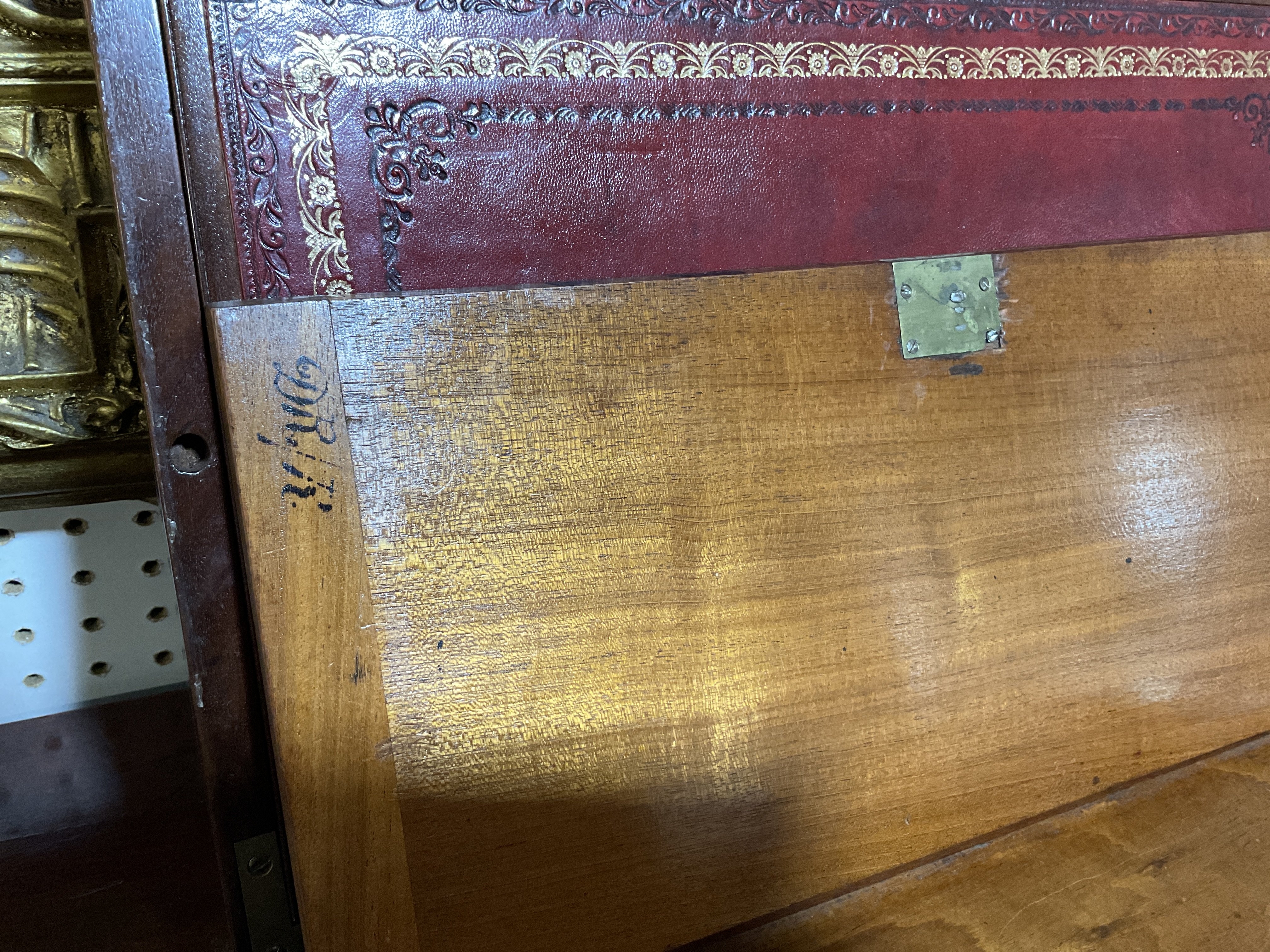 With two carrying handles, opening to a folding gilt tooled leather writing slope, storage compartment beneath both sides of the slope with one having a now redundant lock plate and ink initials to one side, also a secret drawer opening to the side, two glass ink pots and recess, 46cm wide; 17cm high