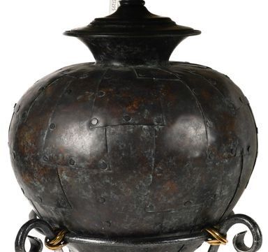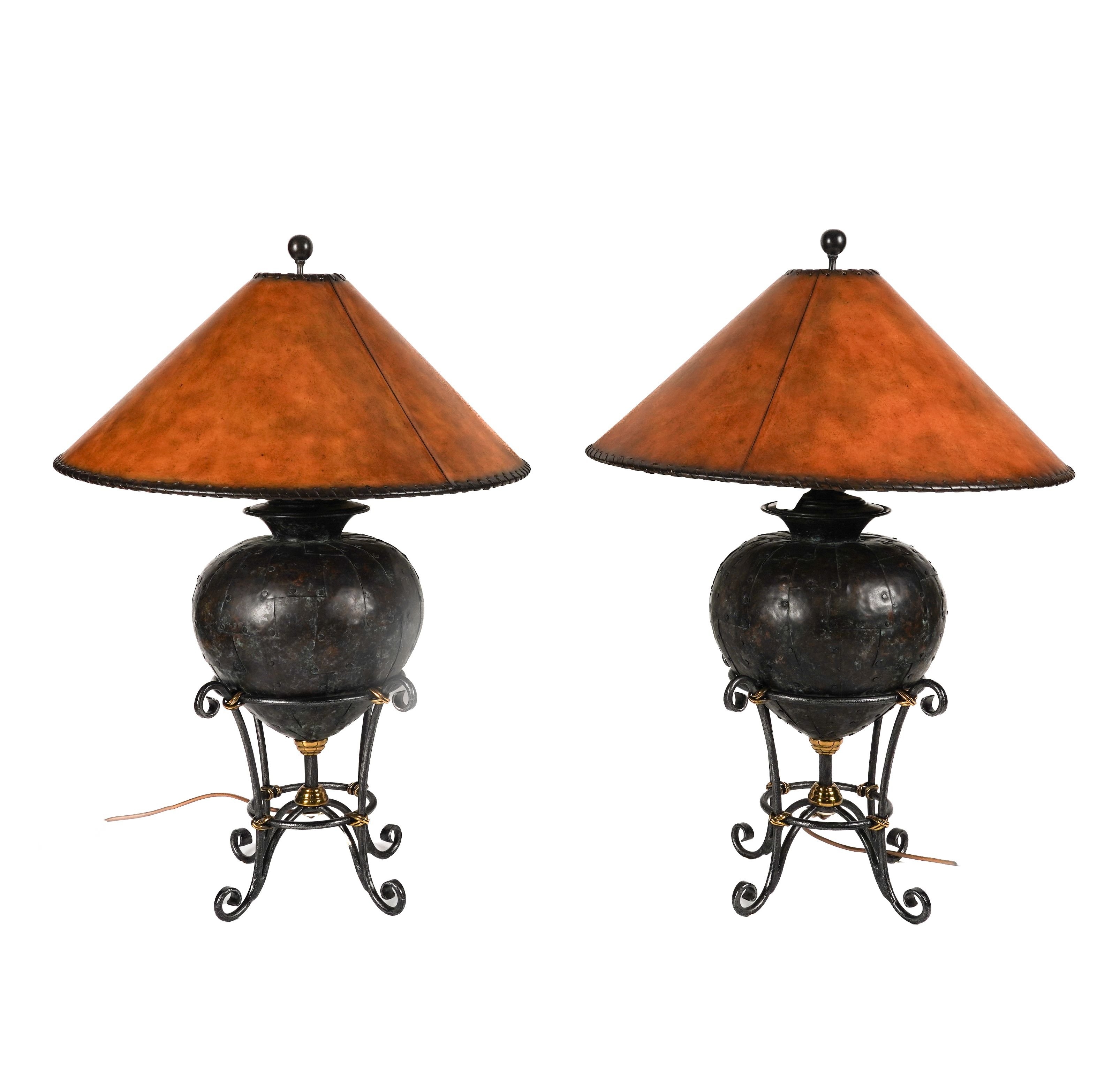 Of tapering ovoid form, beaten and riveted, on scroll stands with leatherette shades, maker's labels, 80cm high (including shades)