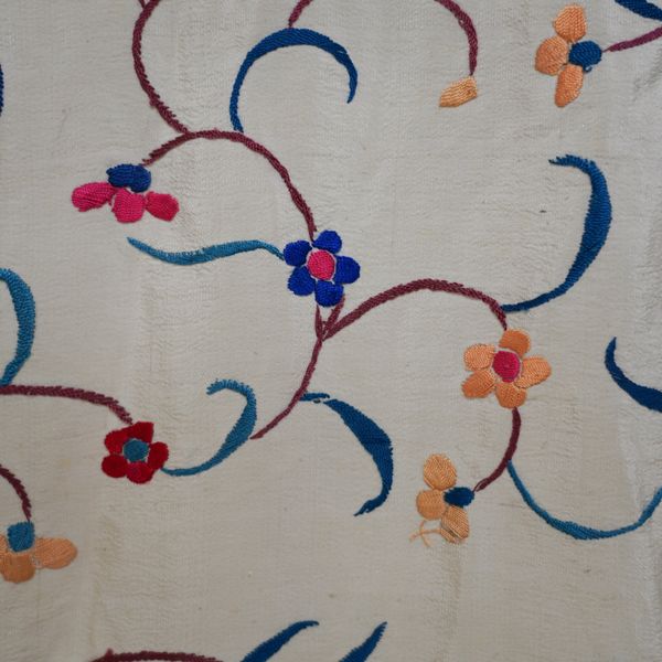 The larger square panel embroidered with brightly coloured flowers possibly peonies on an ivory ground, with knotted and long tassel border, 114cm x 114cm excluding fringe; the rectangular silk panel with tropical birds and flowers, 206cm x 73cm excluding fringe
