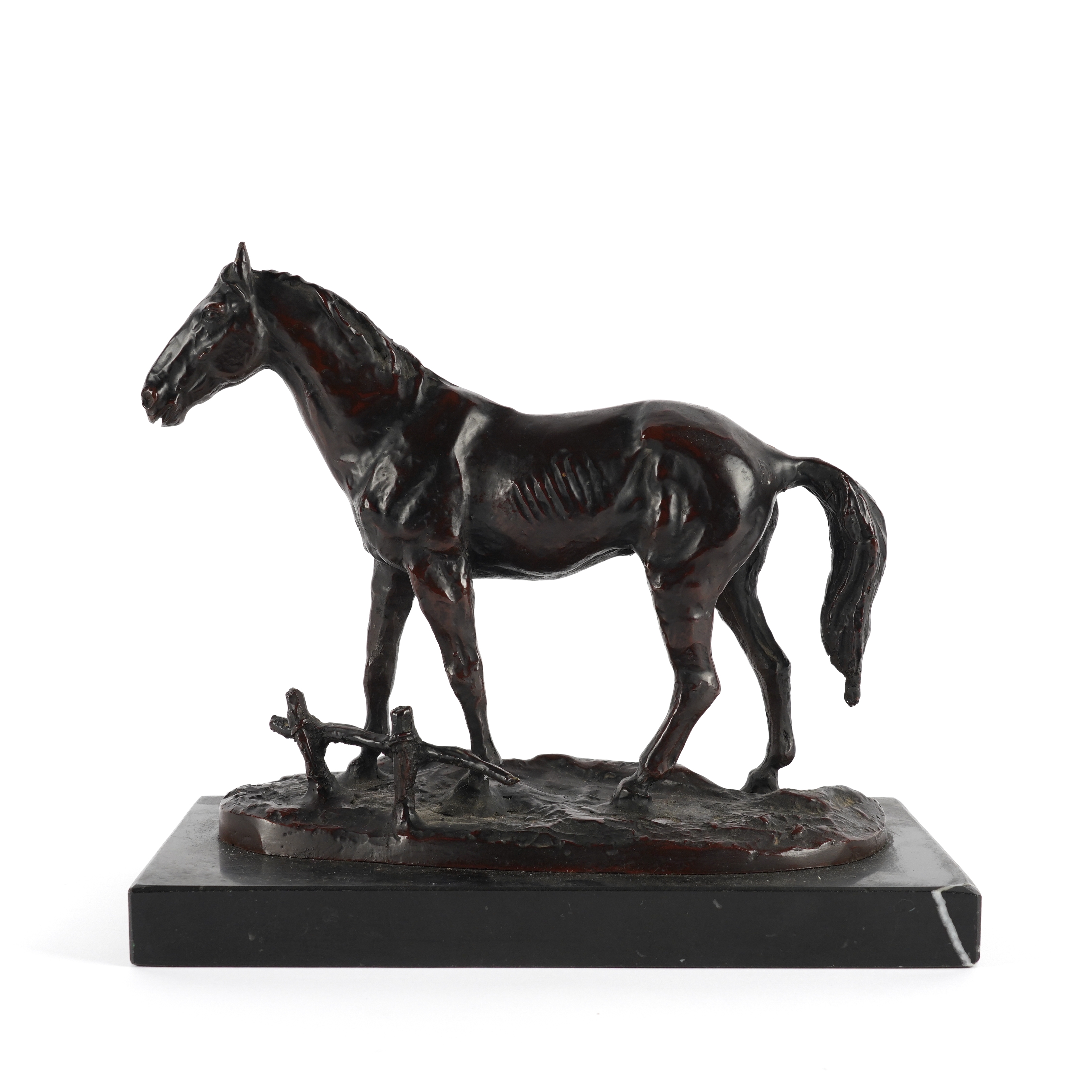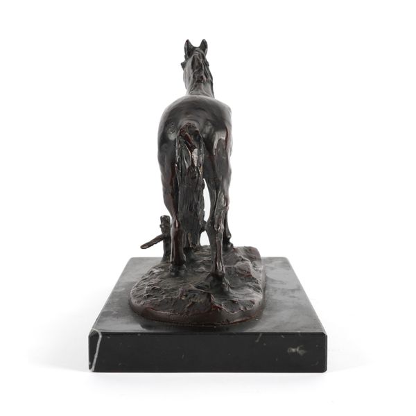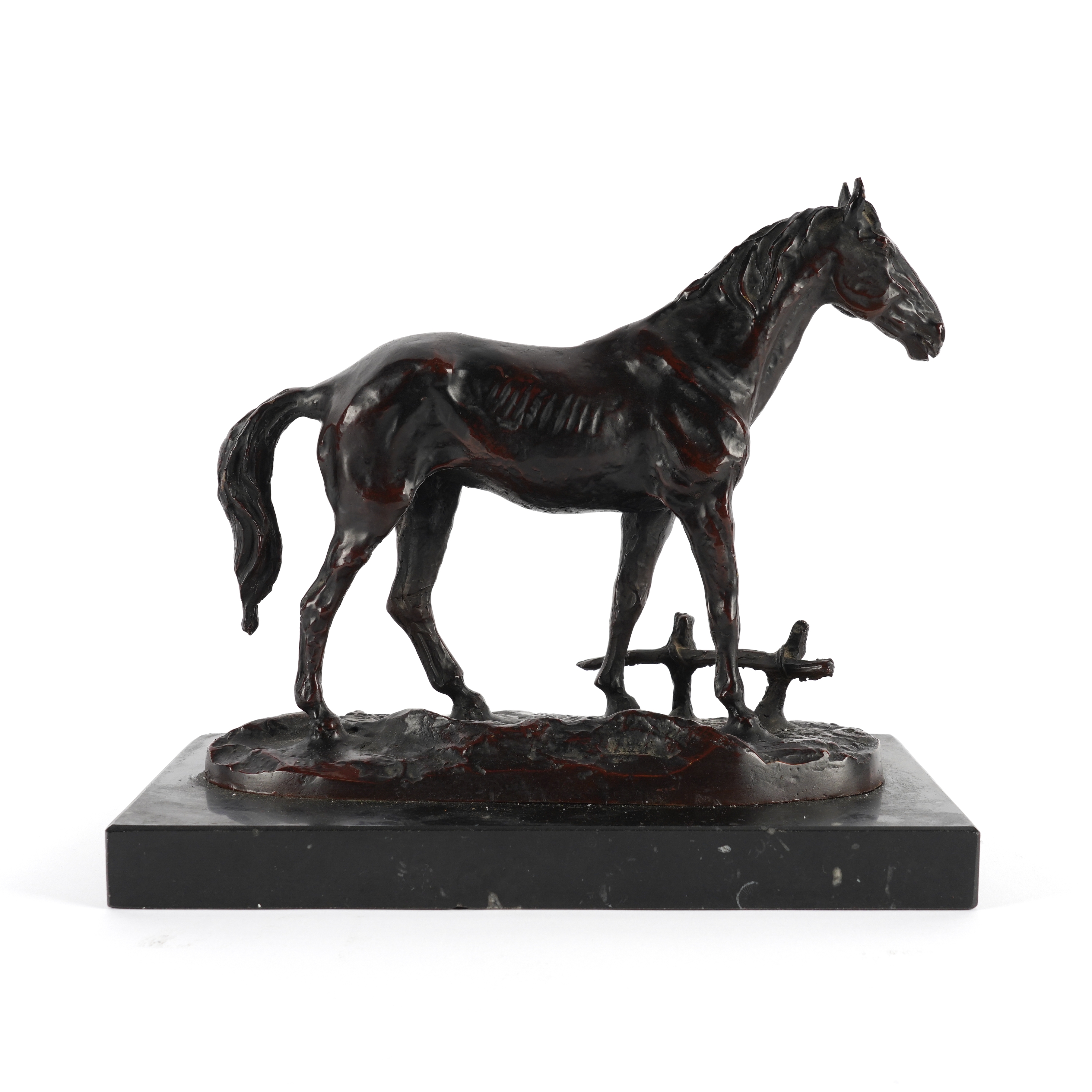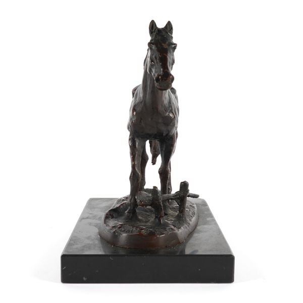 Modelled standing on a naturalistic ground with fence to the foreground, apparently unsigned, on a black marble base, 31cm wide