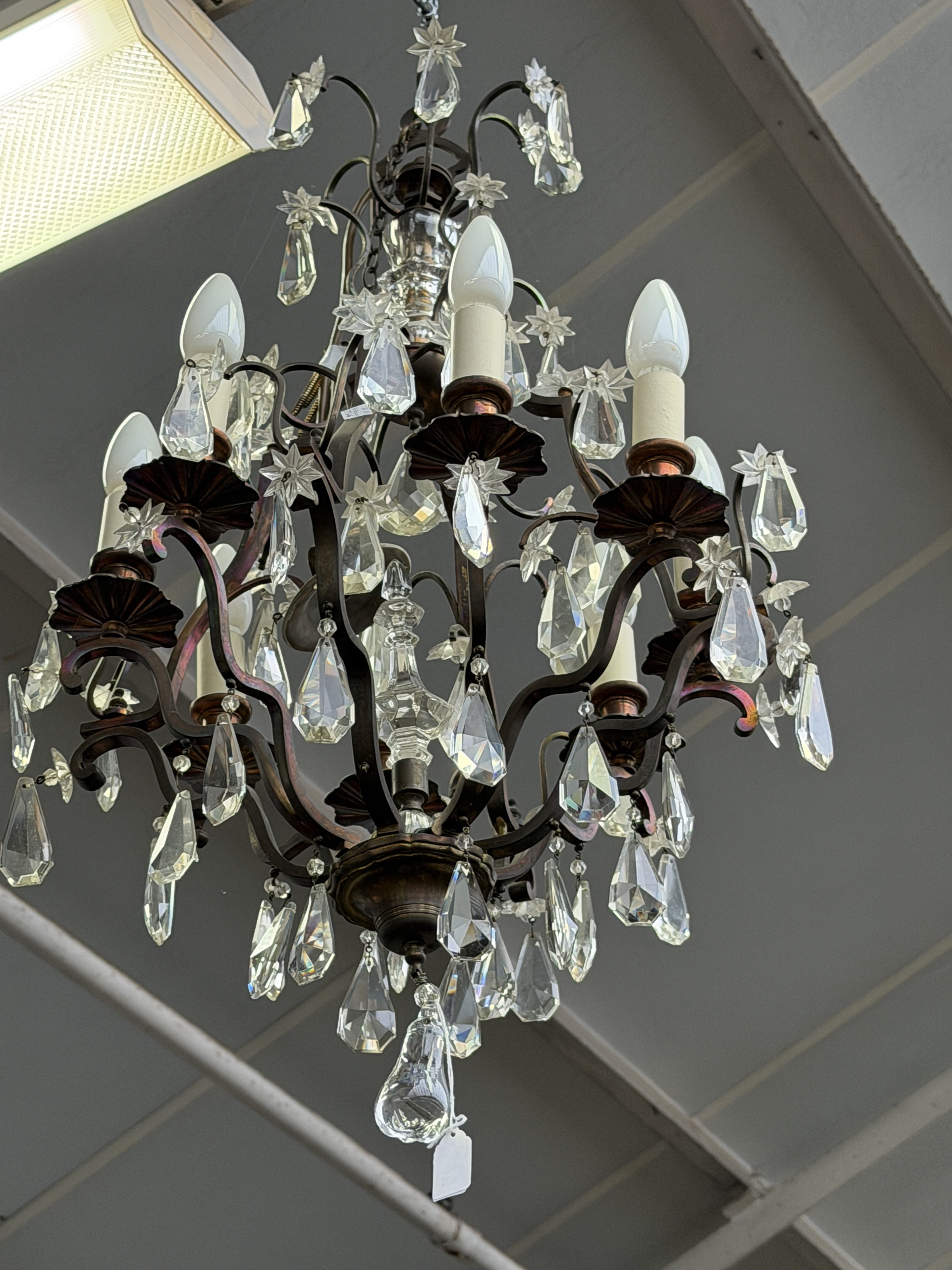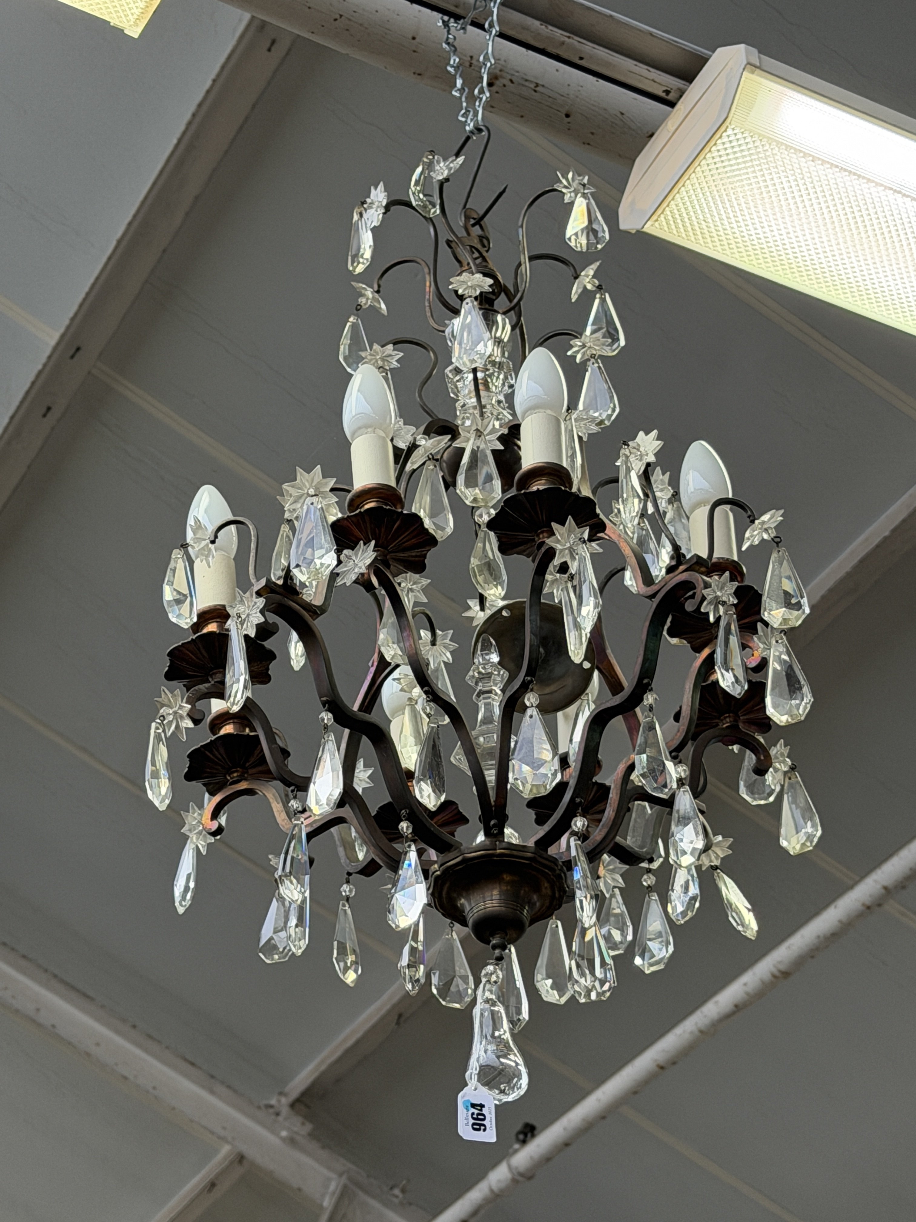 The glass encased central stem, with eight scroll branches terminating in frilled reflectors, decorated with cut glass drops and flowers, approx 68cm high