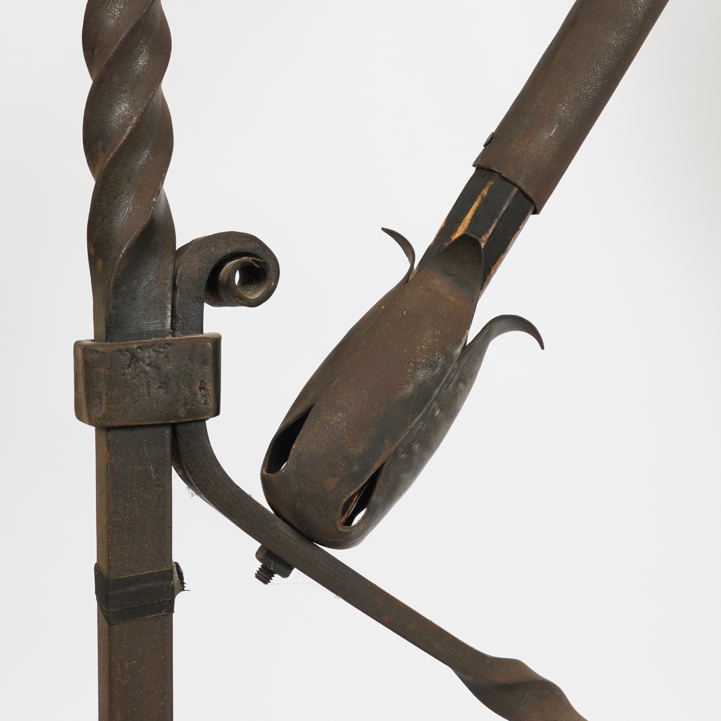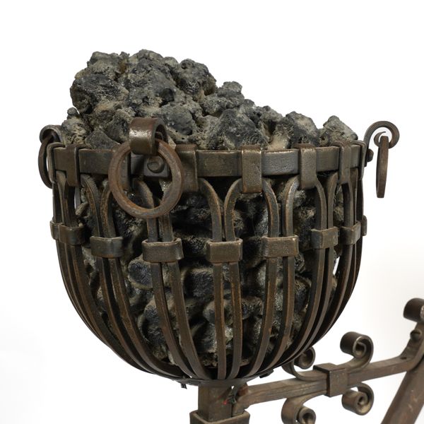 With part-writhen and scrolling uprights supporting baskets fitted with electrical coals, mounted with ebonised and iron mounted halberds, the andirons, 116cm high; overall 206cm high