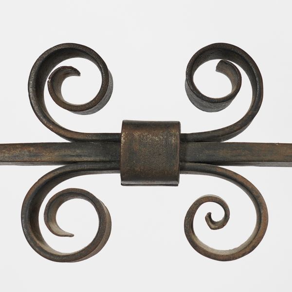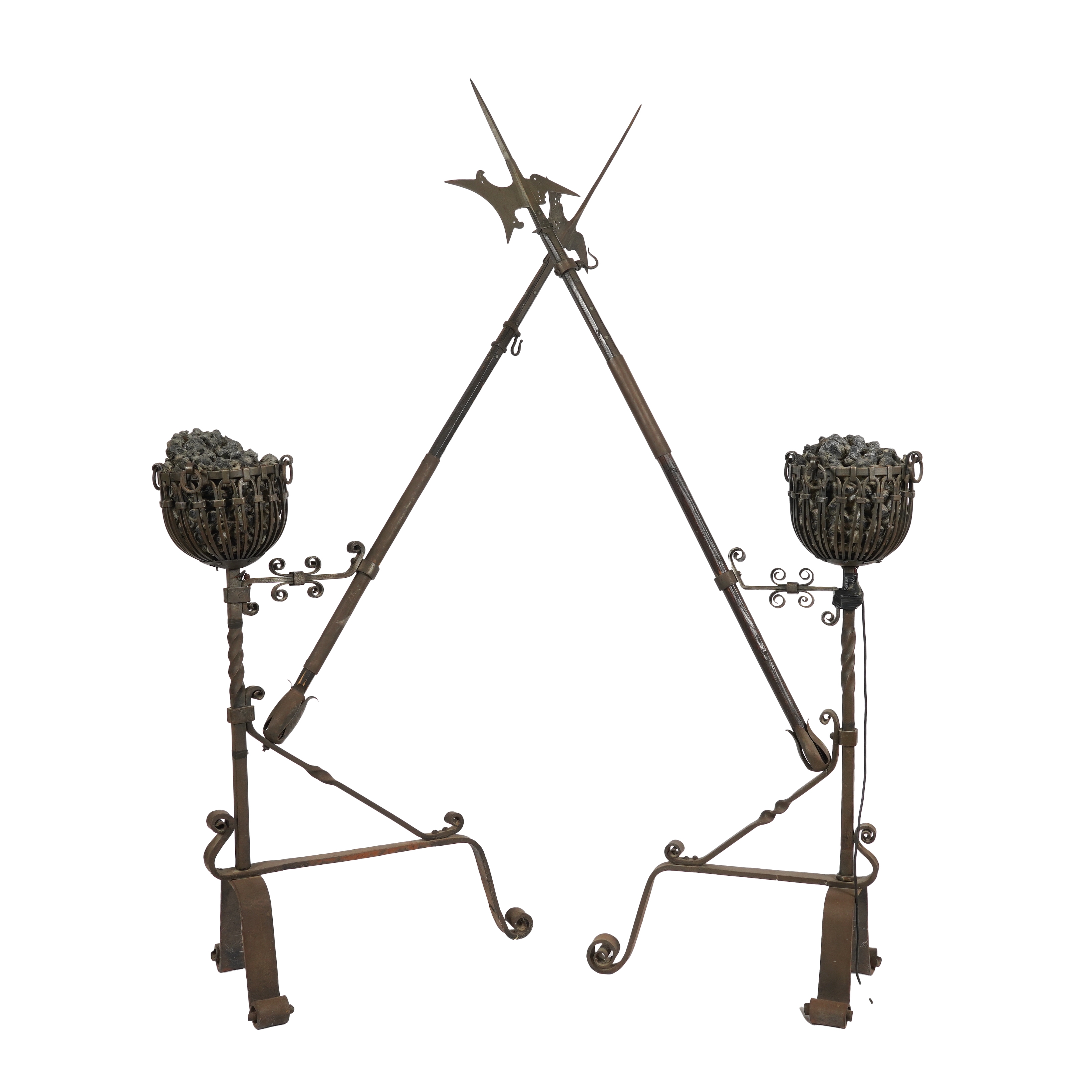 A PAIR OF FLOOR STANDING WROUGHT IRON ANDIRONS AND WOOD HALBERDS (2)