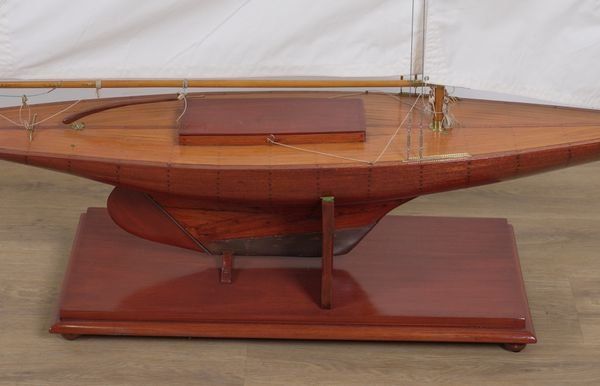 Planked with brass pins and details, lead weighted keel, single mast and replacement sail canvas (original present and made to scale by Bassett- Lowke), on presentation stand, 145cm long; 151cm high
