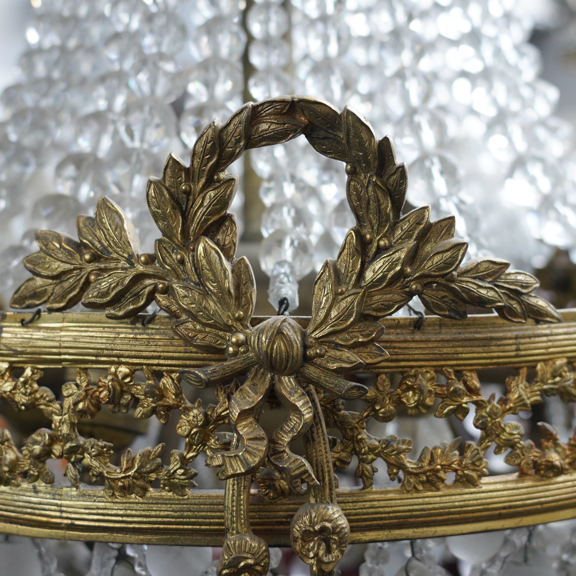 The crystal swags surmounted by an acanthus cast corona and waisted by a central band, issuing three three-branch arms from bows and floral swags, with six lights within basket issuing from the central stem, the swagged bottom with a pendant berry finial, 115cm high