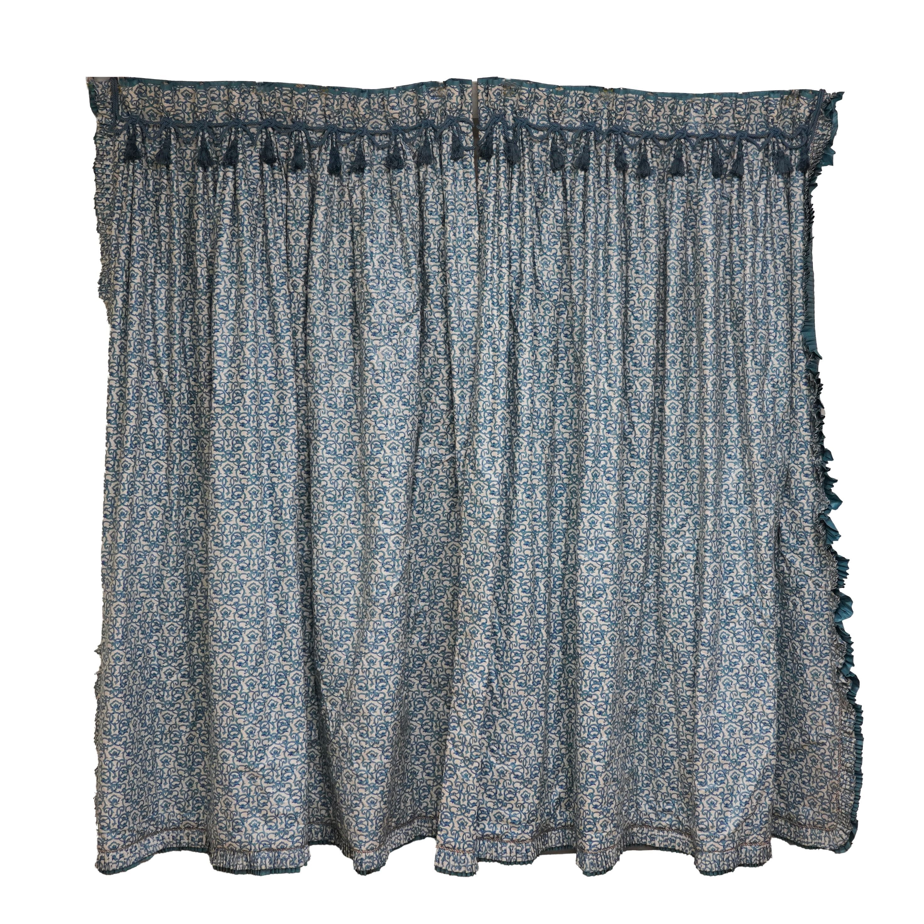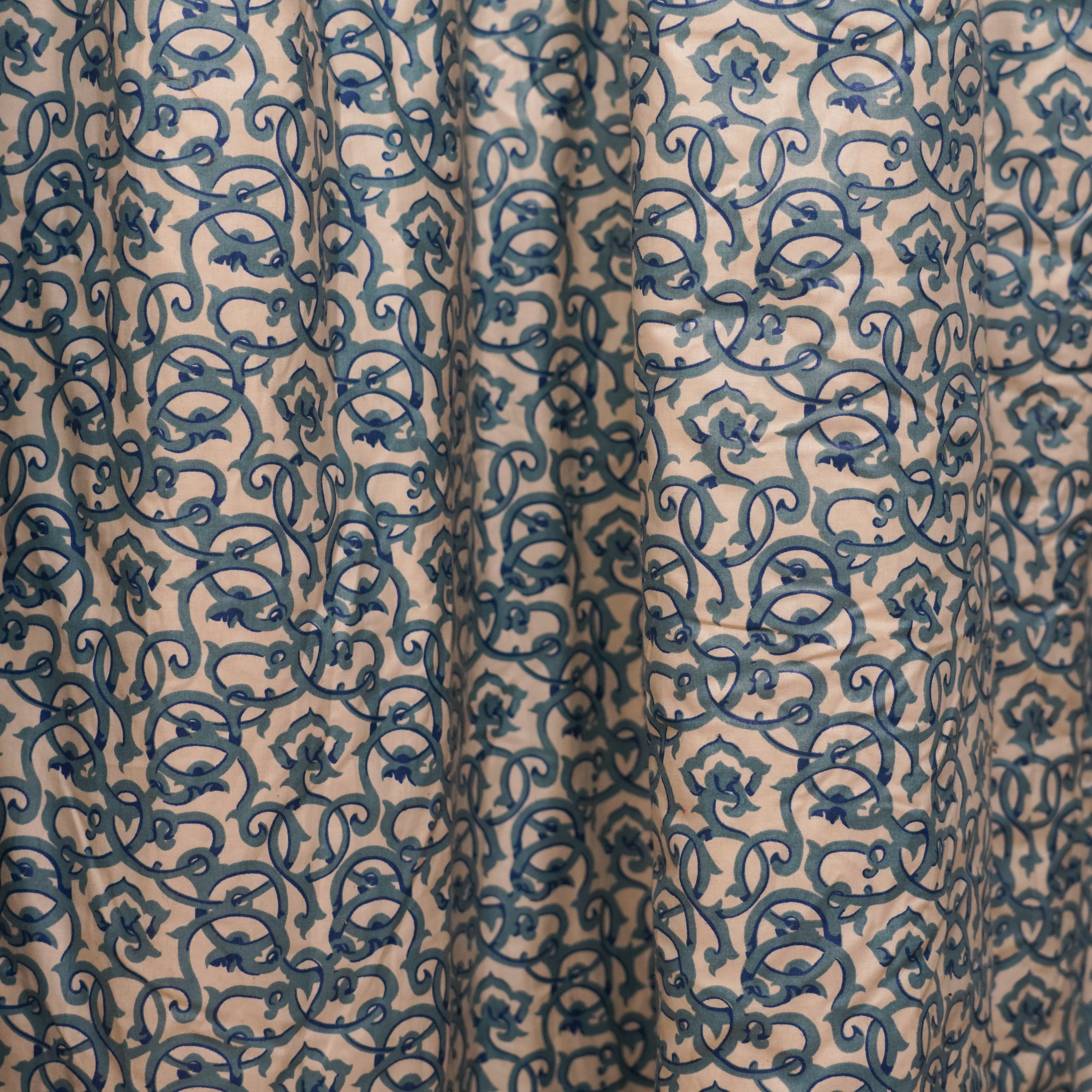 A PAIR OF GLAZED COTTON BLUE AND CREAM ENTWINED PATTERN CURTAINS (4)