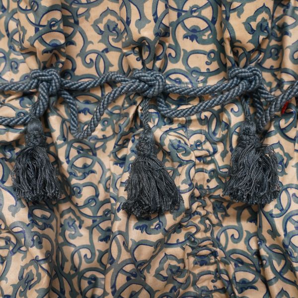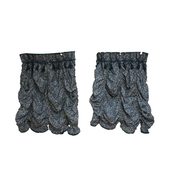With pleated edges and stiff single pleated top with braid and tassel swags, 104cm top edge; 230cm long bottom edge; 234cm high, approximately; together with a pair of matching side windows blinds