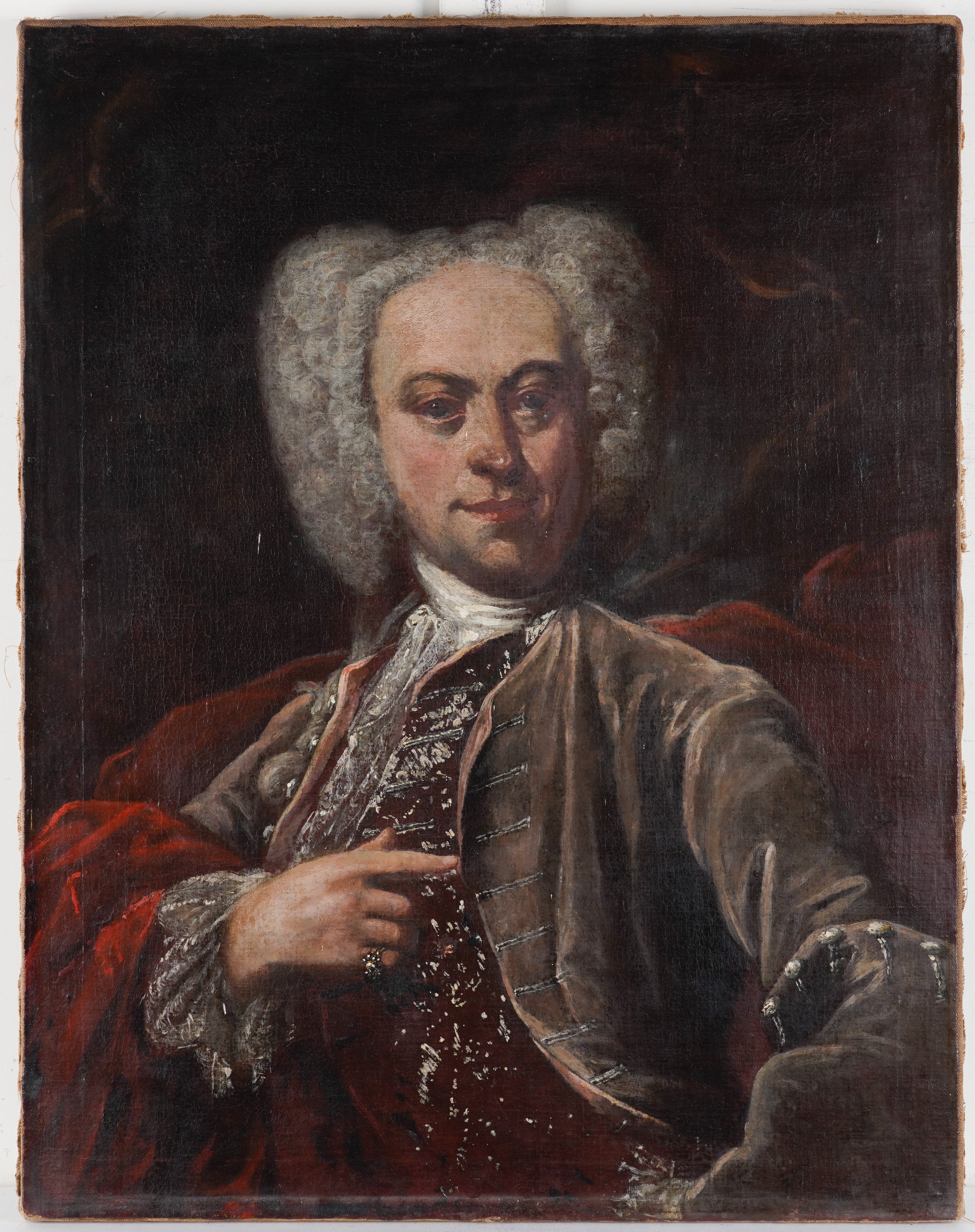 canvas relined; traces of craquelure throughout - stable; weave of relining is visible through the original canvas in some areas; surface media spot, upper left; small, scattered patches of retouching to sitter's face and wig, similar to sitter's coat; a few patches to background, some of which appears to have been applied prior to current varnish.
