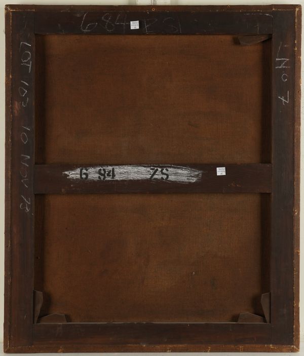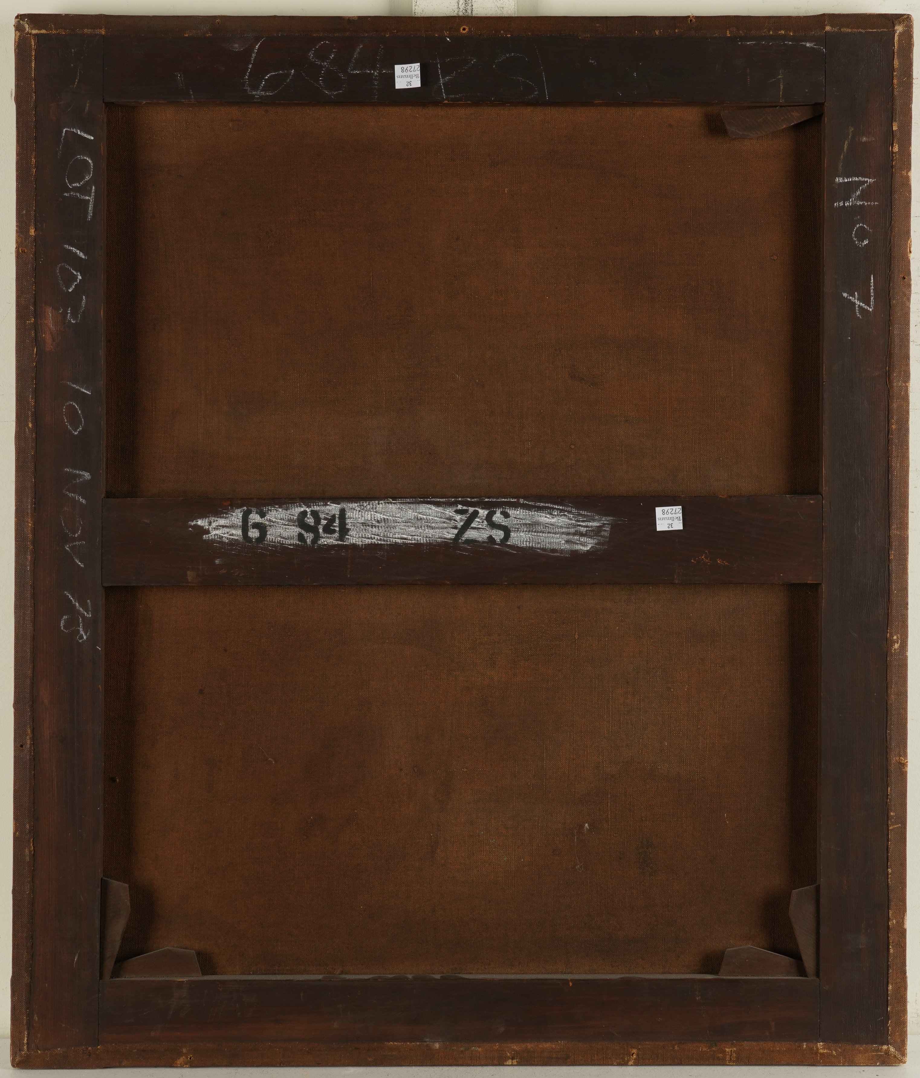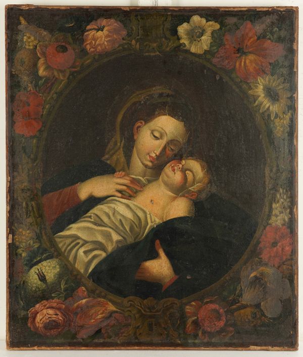 Canvas relined; craquelure pattern throughout; surface abrasions and paint loss, upper right within the painted oval, centre to child's chest, lower right near the Virgin's left hand, lower left, on the outline of the painted oval; paint surface is  thin in some areas; paint loss to frame abrasions on each border; ultraviolet reveals traces of old retouching to the background within the painted oval however a thick, uneven varnish prevents a conclusive reading.