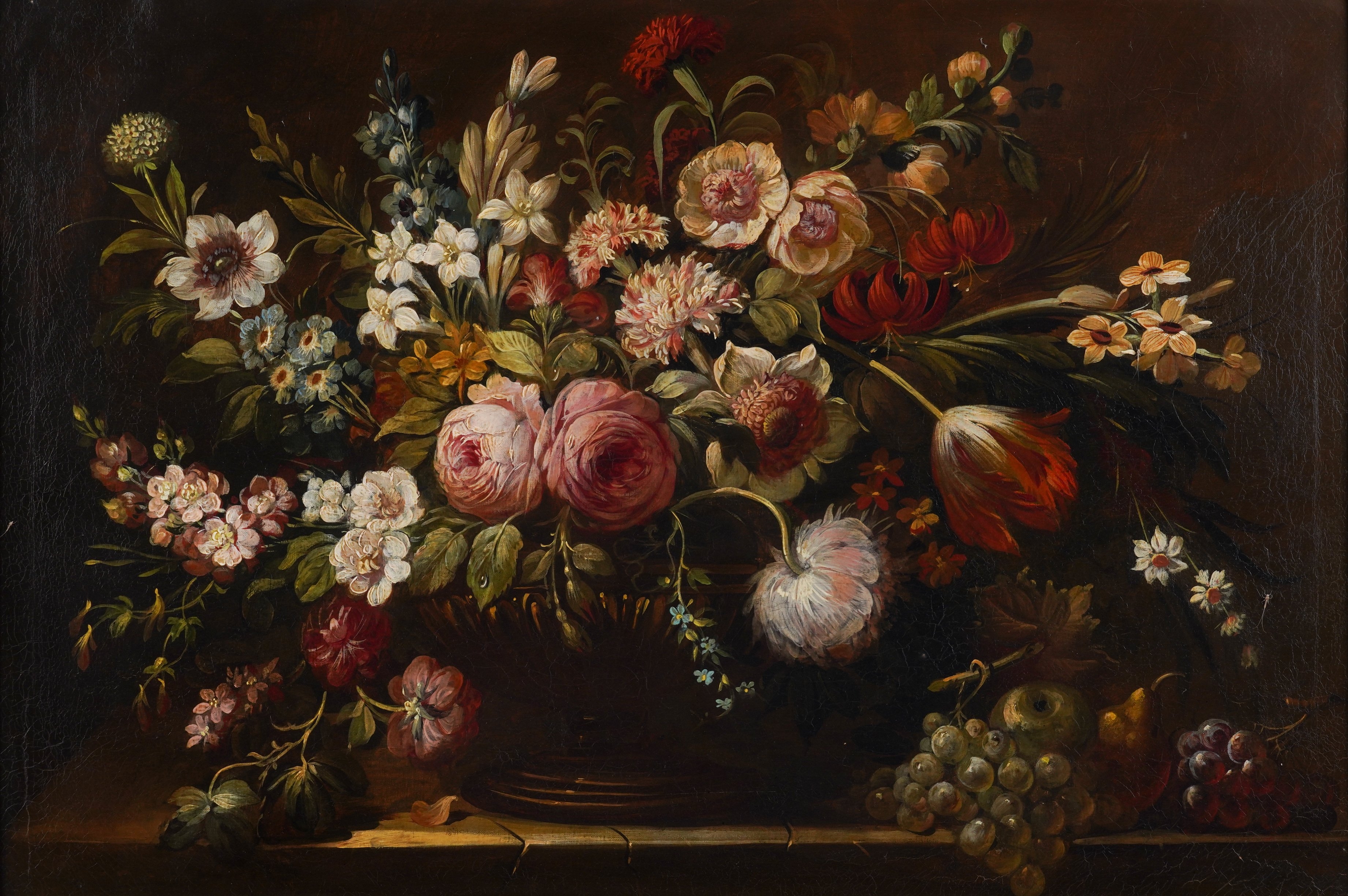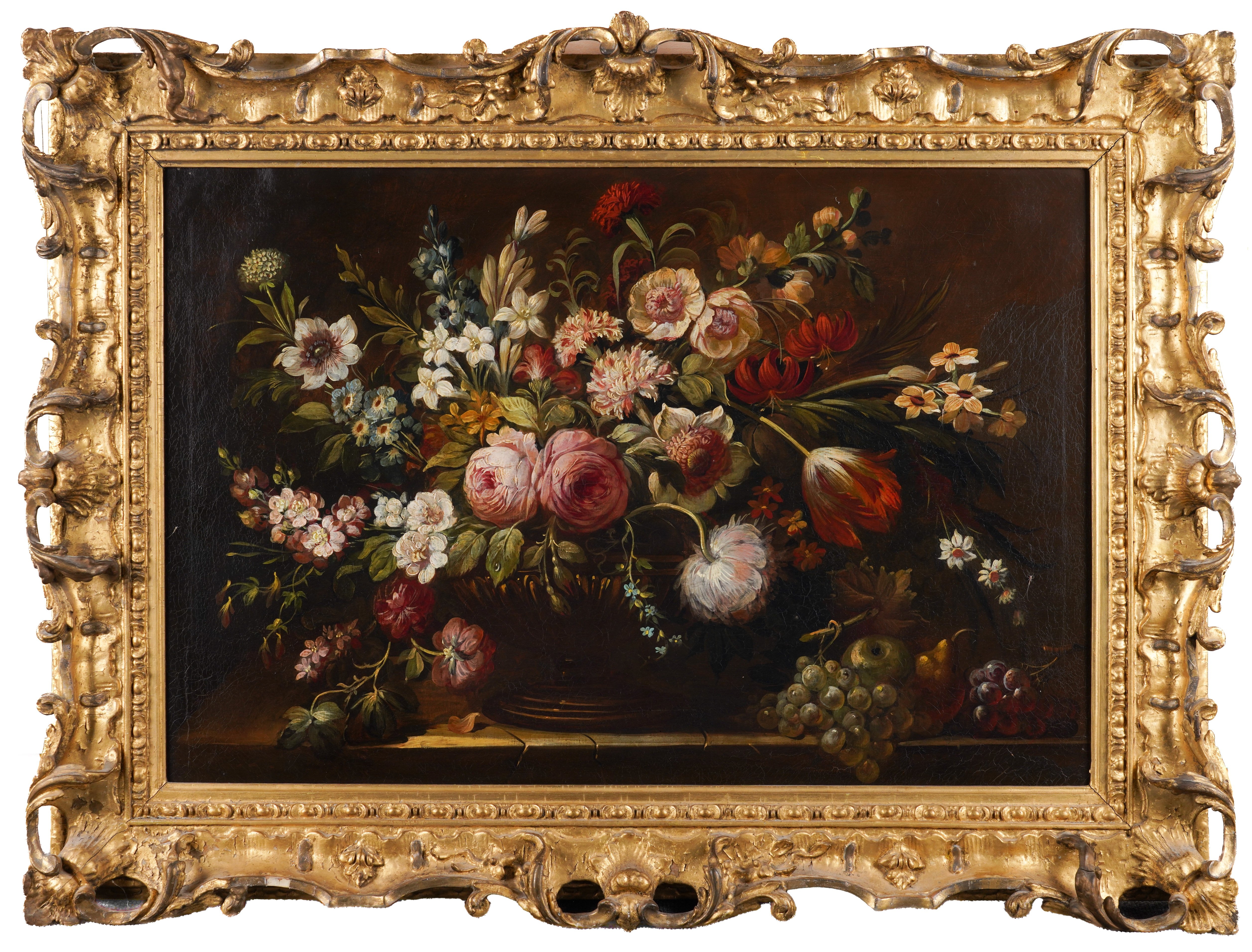 canvas has an old relining; traces of craquelure pattern throughout, otherwise paint surface is sound; ultraviolet reveals a few areas of infilling to background, and some minor patches to the flowers.
