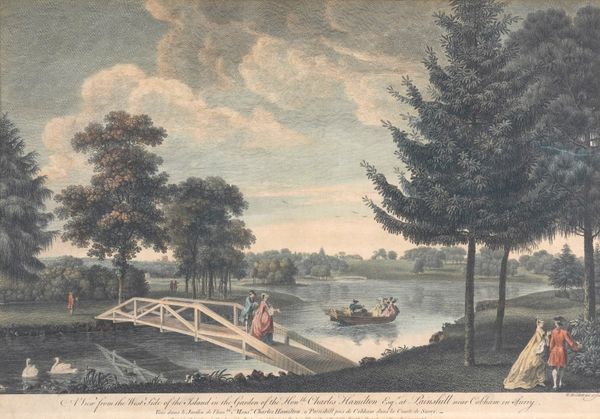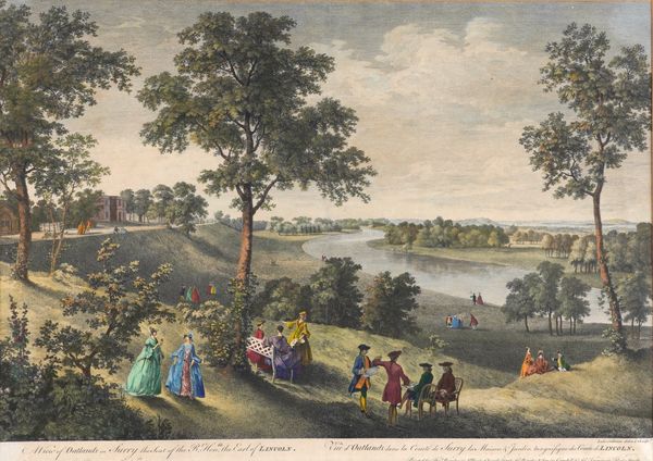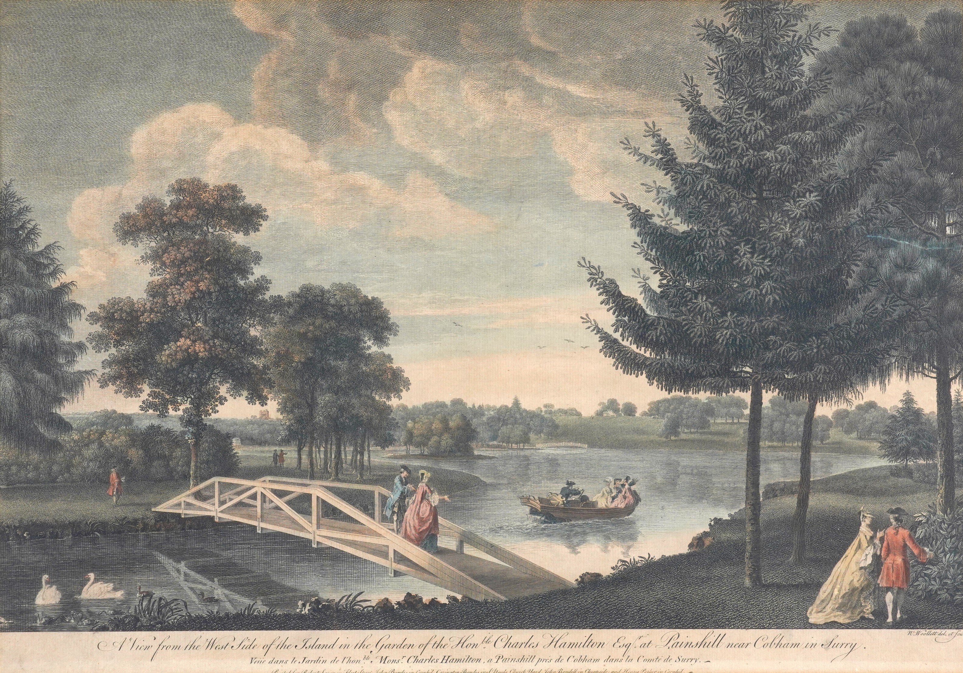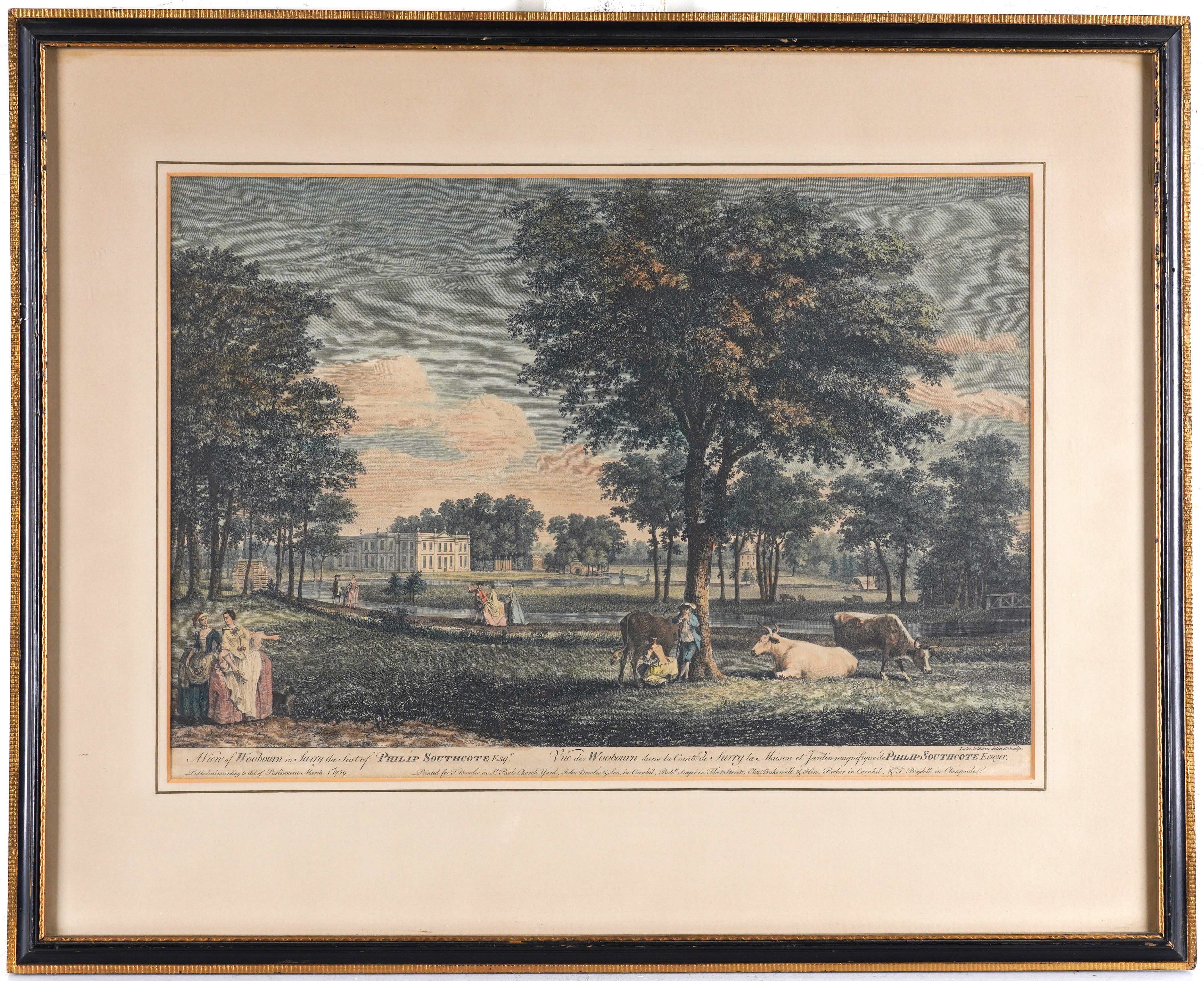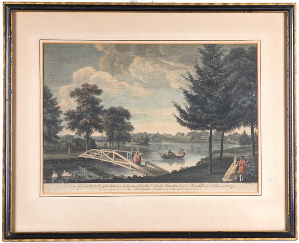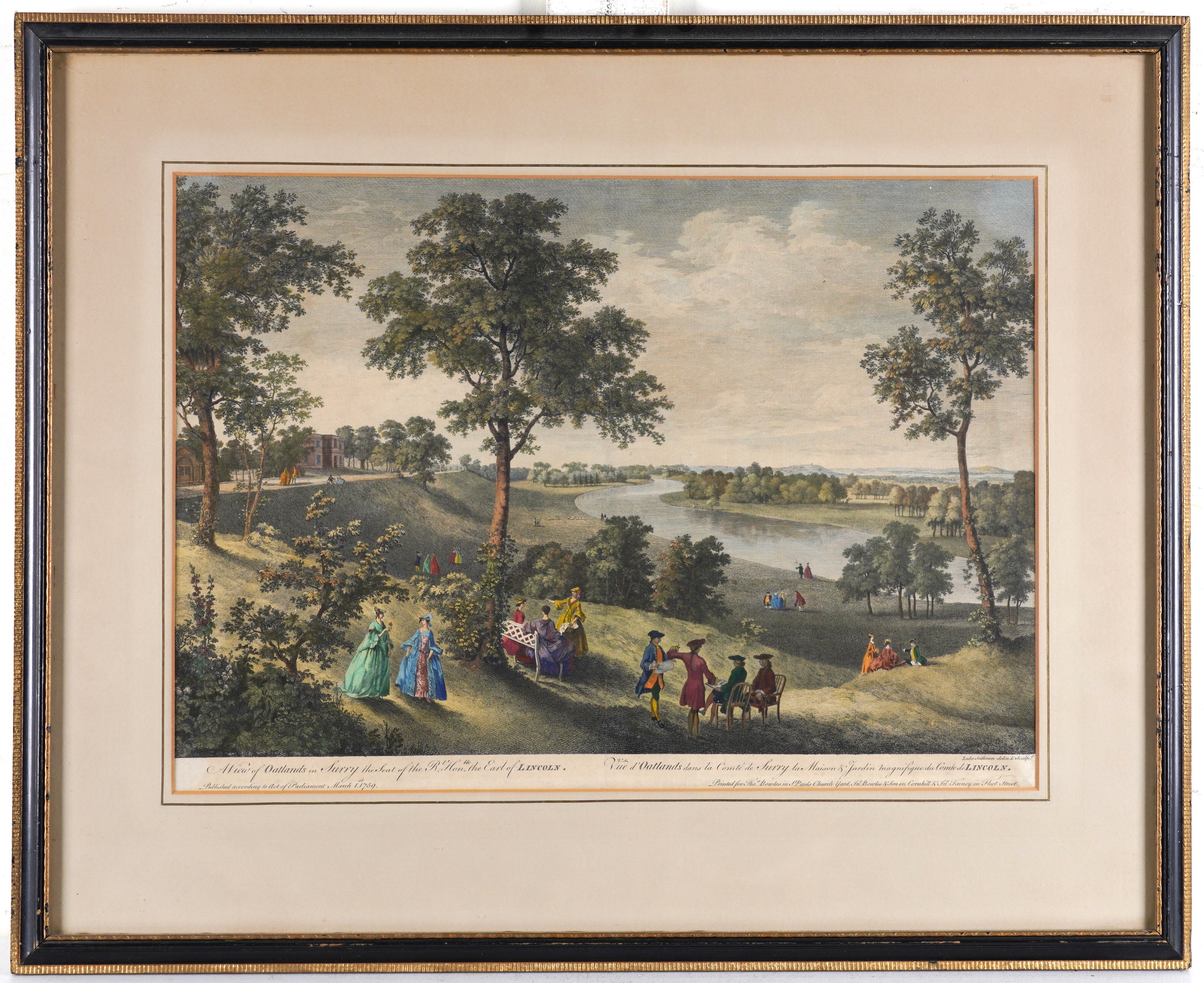 together with another engraving by Luke Sullivan , A view of Oatlands in Surrey, the seat of the Rt Honble the Earl of Lincoln, published 1759, 34 x 50.5cm; and an engraving by William Woollett, A view from the west side of the island in the garden of the Honble Charles Hamilton Esq. at Painshill near Cobham in Surrey, 33 x 50cm