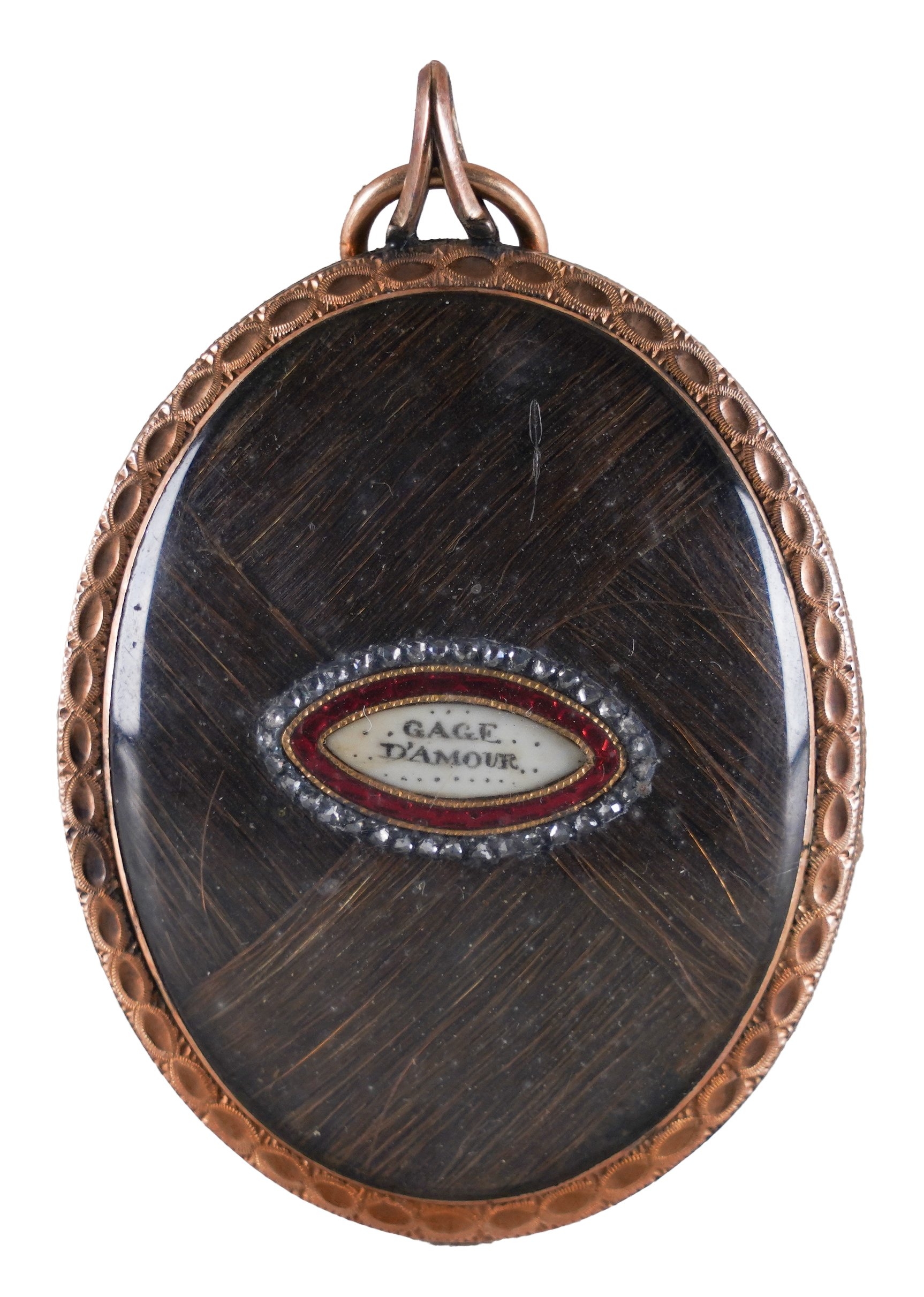 with a lock of hair and inscribed 'GAGE D'ARMOUR' (to back of frame)