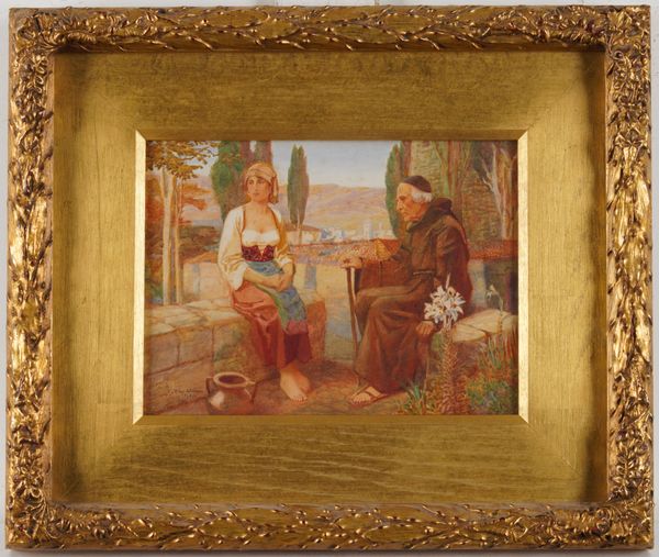 Some pale spots of foxing, most noticeable to sky, tree on left and pale brown area between the two figures.