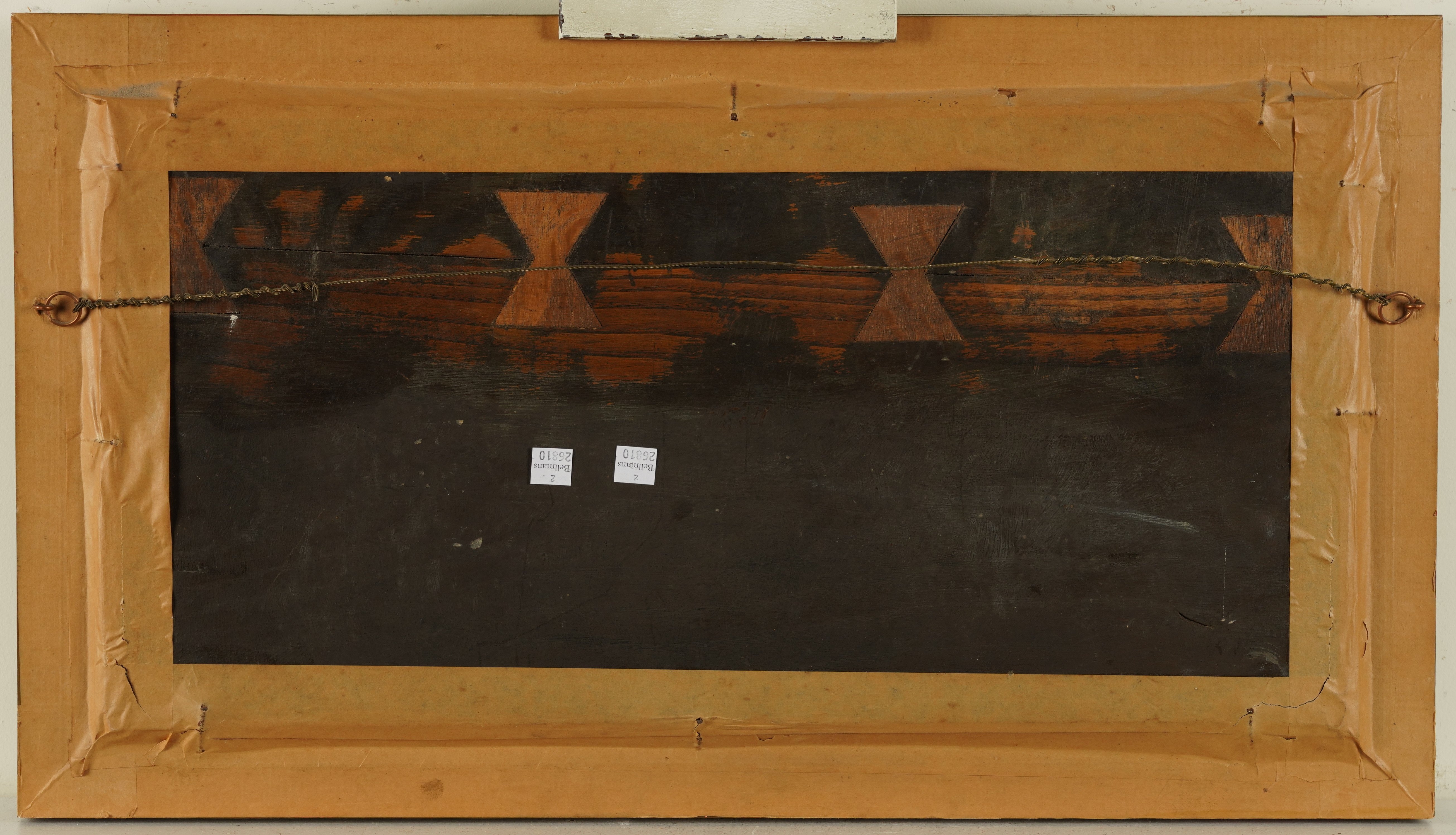 Horizontal split running width of panel; paint surface is generally sound; no sign of retouching under ultraviolet.