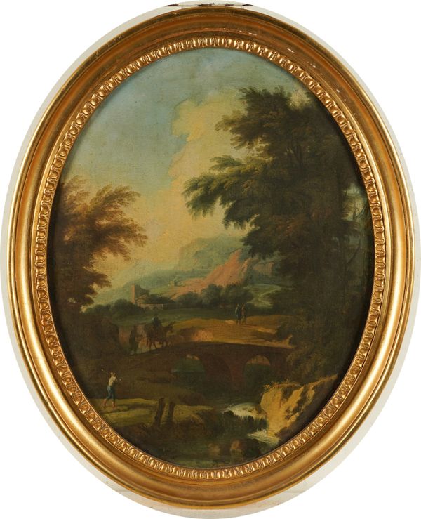 Figures and a mule in a landscape oil on canvas 49 x 38cm, oval Provenance Private collection, UK