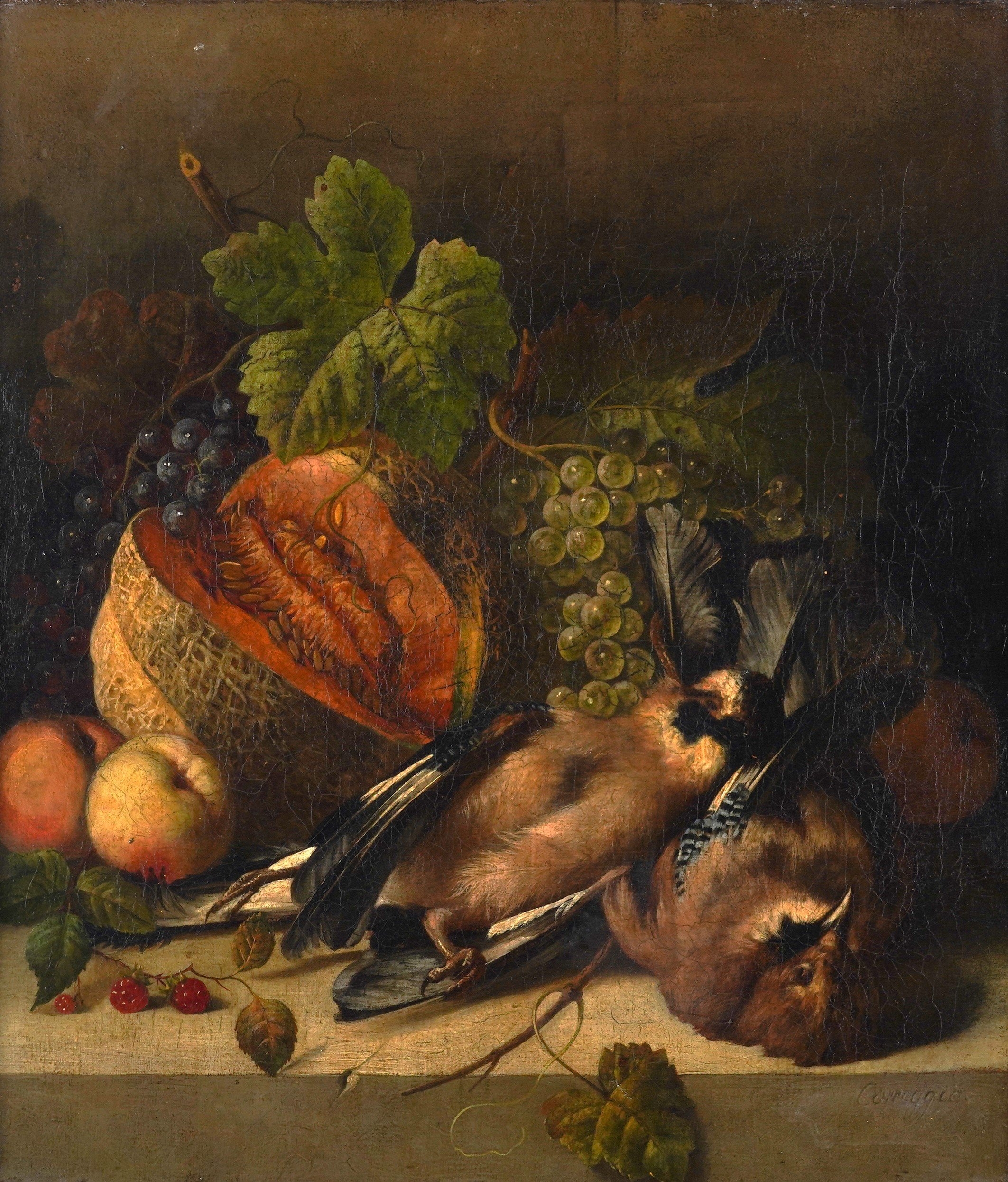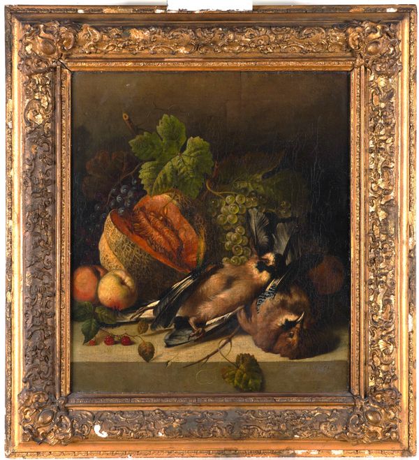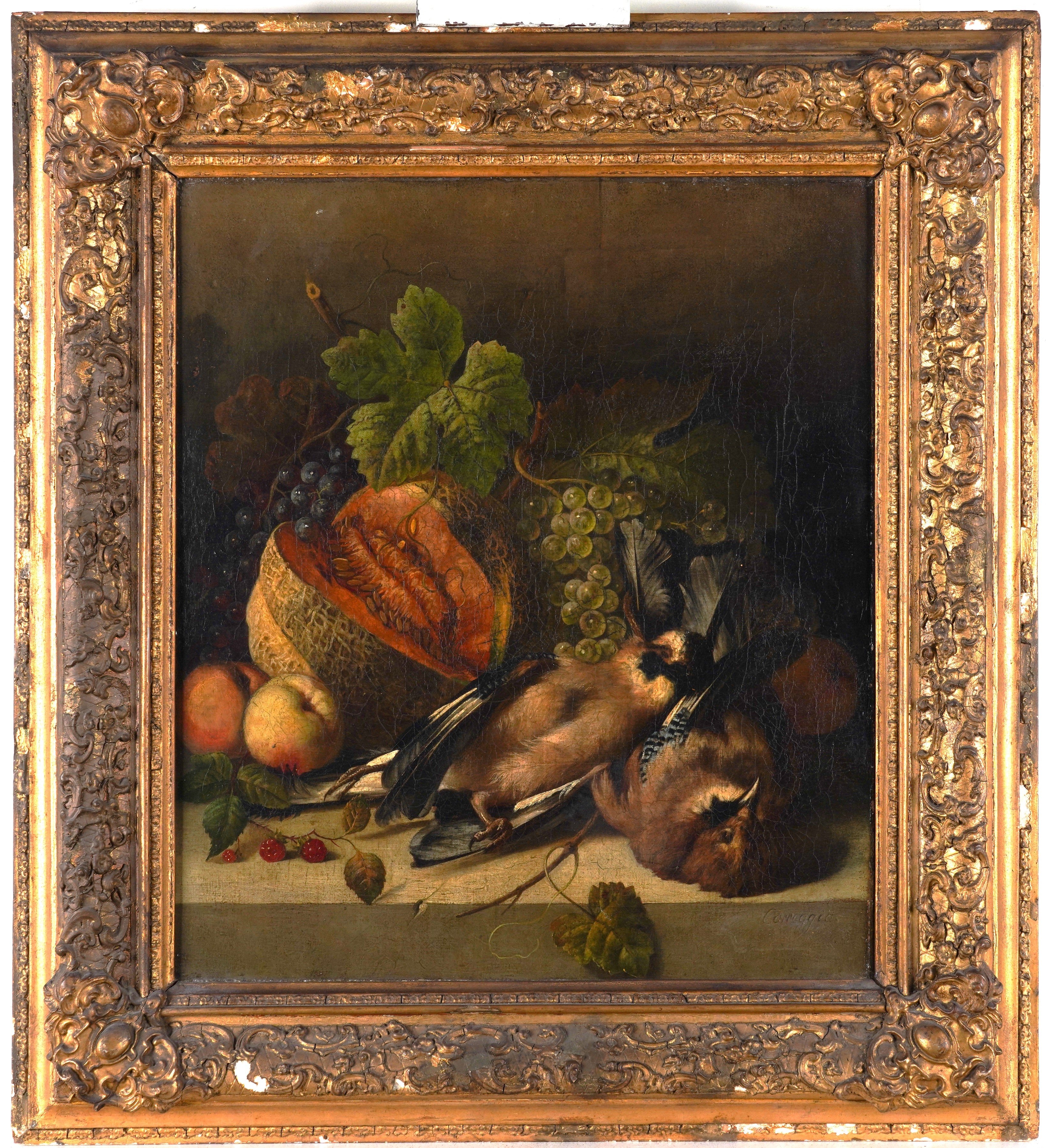 Still life with a pumpkin, apples, grapes and a pair of dead jays