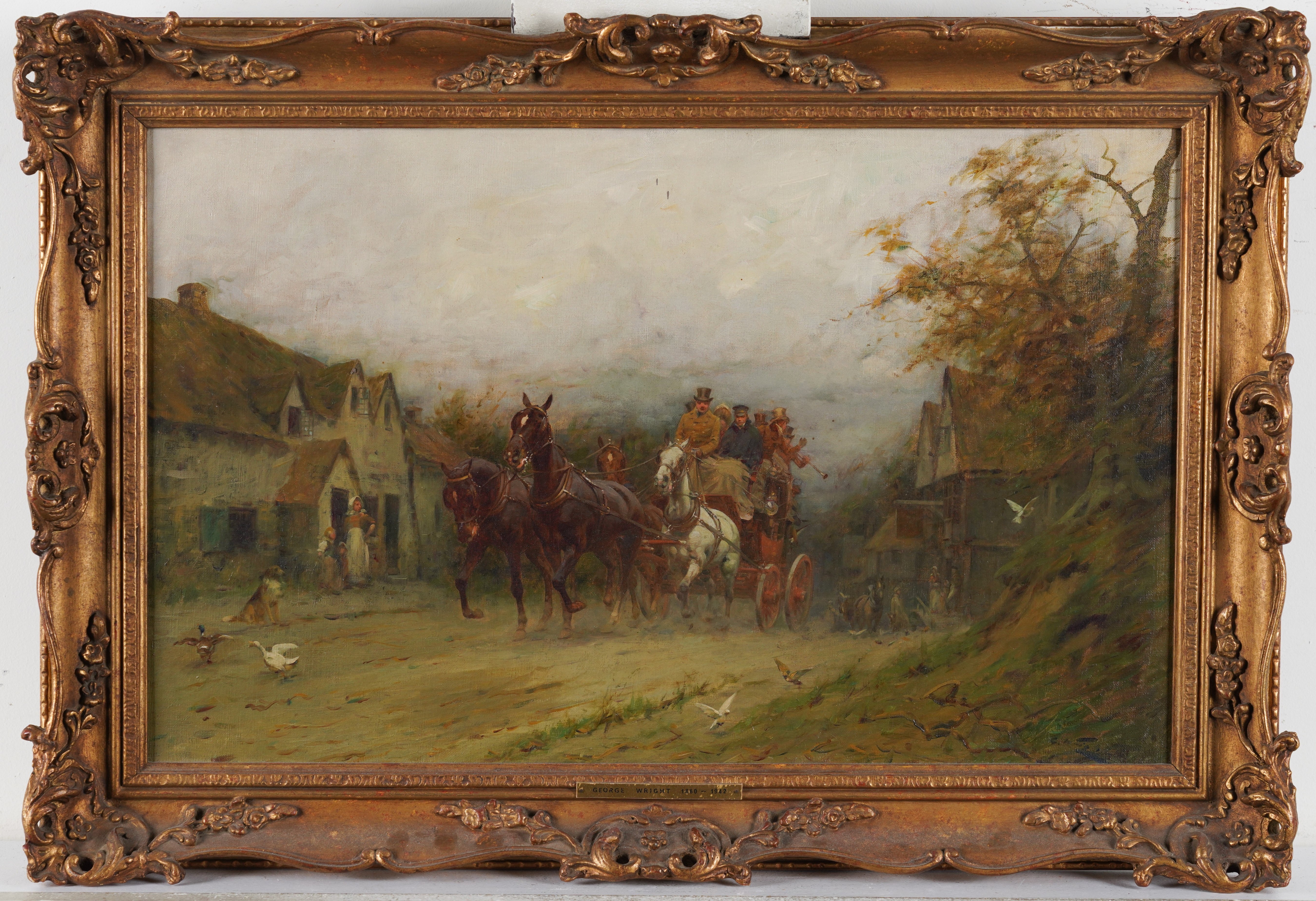 A coach passing through a village signed 'G Wright' (lower right) oil on canvas 33.5 x 53cm Provenance Private collection, UK