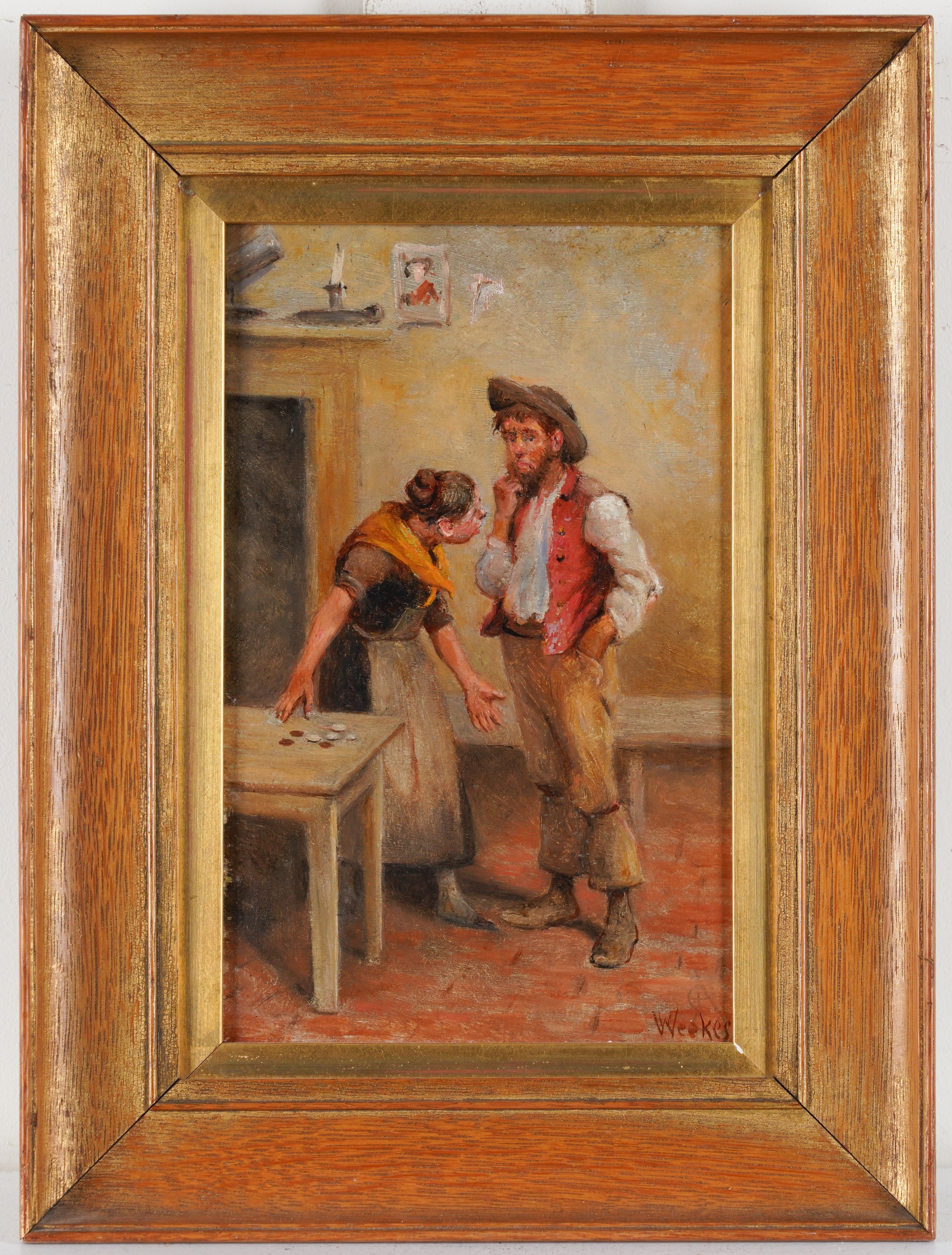 Did I Marry You for This? signed 'WWeekes' (lower right) oil on board 25.5 x 16cm Provenance Private collection, UK