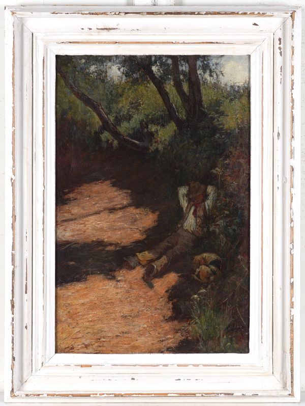 A Rest in the Wayside signed and dated 'Jo White 16' (lower right) oil on canvas 54 x 36cm