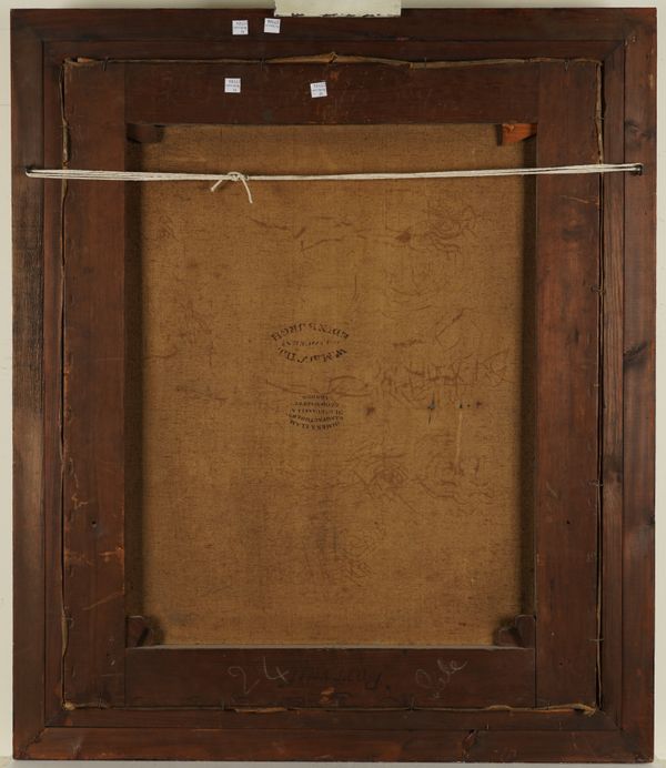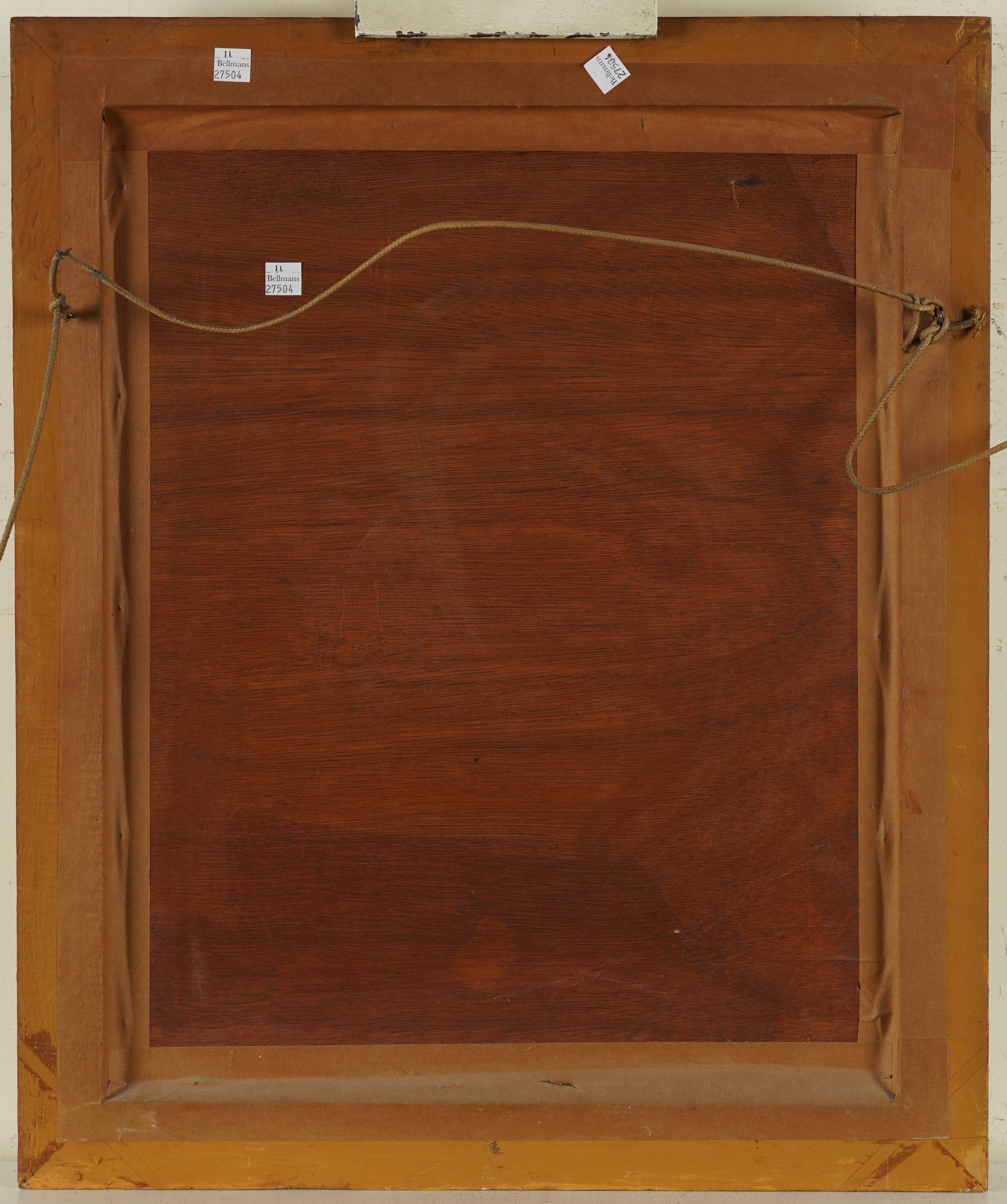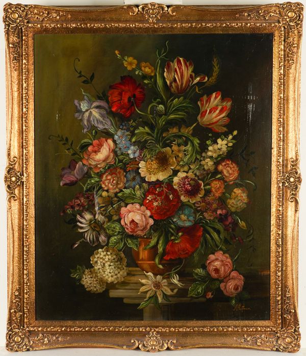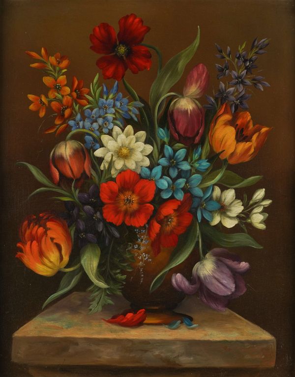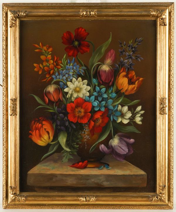 together with a 20th century oil on board of flowers in a vase by another hand, 48 x 38cm