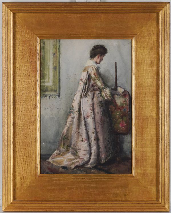 Known for his intimate studies of masculinity, the present work displays Tuke's ability to render femininity with equal skill and sensitivity. In a charmingly unselfconscious pose, his only sister, Maria is shown adjusting a firescreen, built to shield a woman's makeup from excess heat. The treatment of the silk gown, with its myriad shades and adornments, is particularly accomplished. The garment belonged to Mary Mara Scott (1748-1815) who married Maria's great grandfather, Henry Tuke (1755-1814) in 1781. Marrying into a quaker family meant Mary relinquished the majority of her luxurious clothes but this gown was retained and is now thought to be in the collection at the V&A.