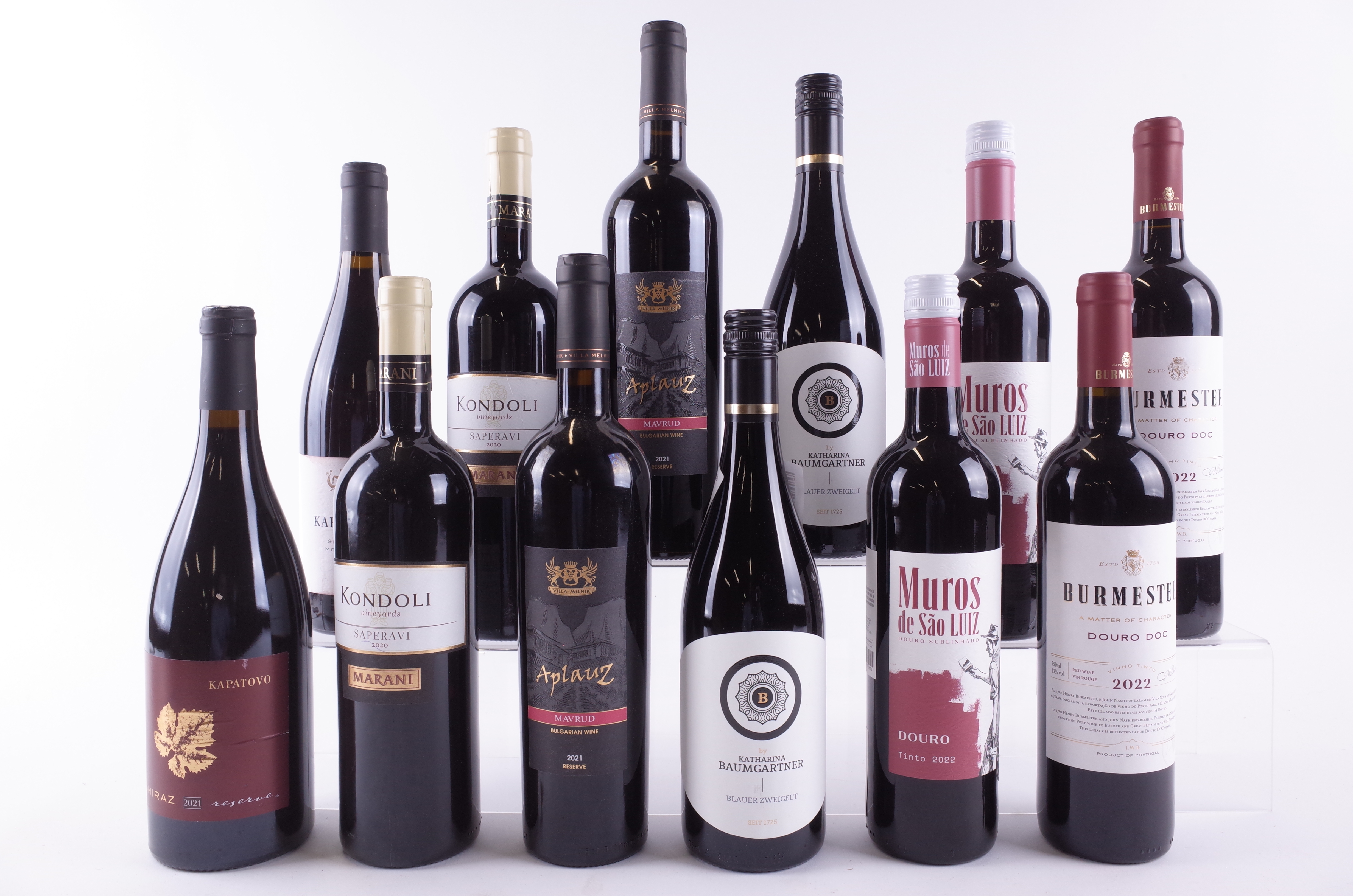 Kapatovo Shiraz Reserve 2021 and Grenache-Mourvèdre-Shiraz 2021; Telavi 2 x Marani Saperavi 2020; Wine Cellar Villar Melnik 2 x Aplauz Mavrud 2021; Domaine Baumgartner 2 x Katharina Blauer Zweigelt 2023; Sogevinus Fine Wines 2 x Muros De São Luiz 2022 and 2 x Burmester Douro 2022