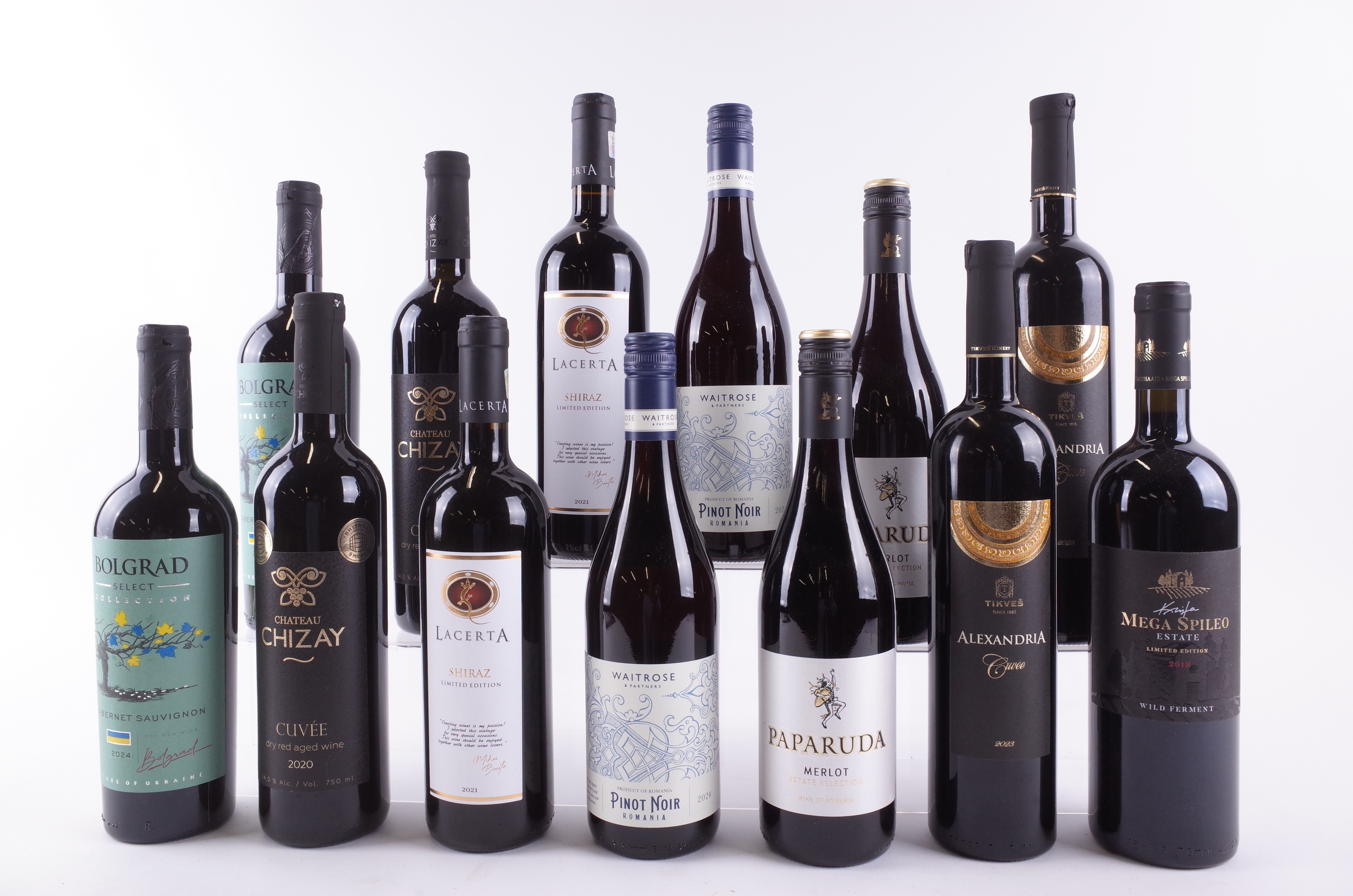 Bolgrad Winery 2 x Select Collection Cabernet Sauvignon 2024; Château Chizay 2 x Cuvée 2020; Lacerta 2 x Shiraz 2021; Waitrose + Partners Pinot Noir 2024; Cramele Recas 2 x Paparuda Merlot 2024; Tikves Winery 2 x Alexandria Cuvée 2023; Mega Spileo Estate Wild Ferment Limited Edition 2018