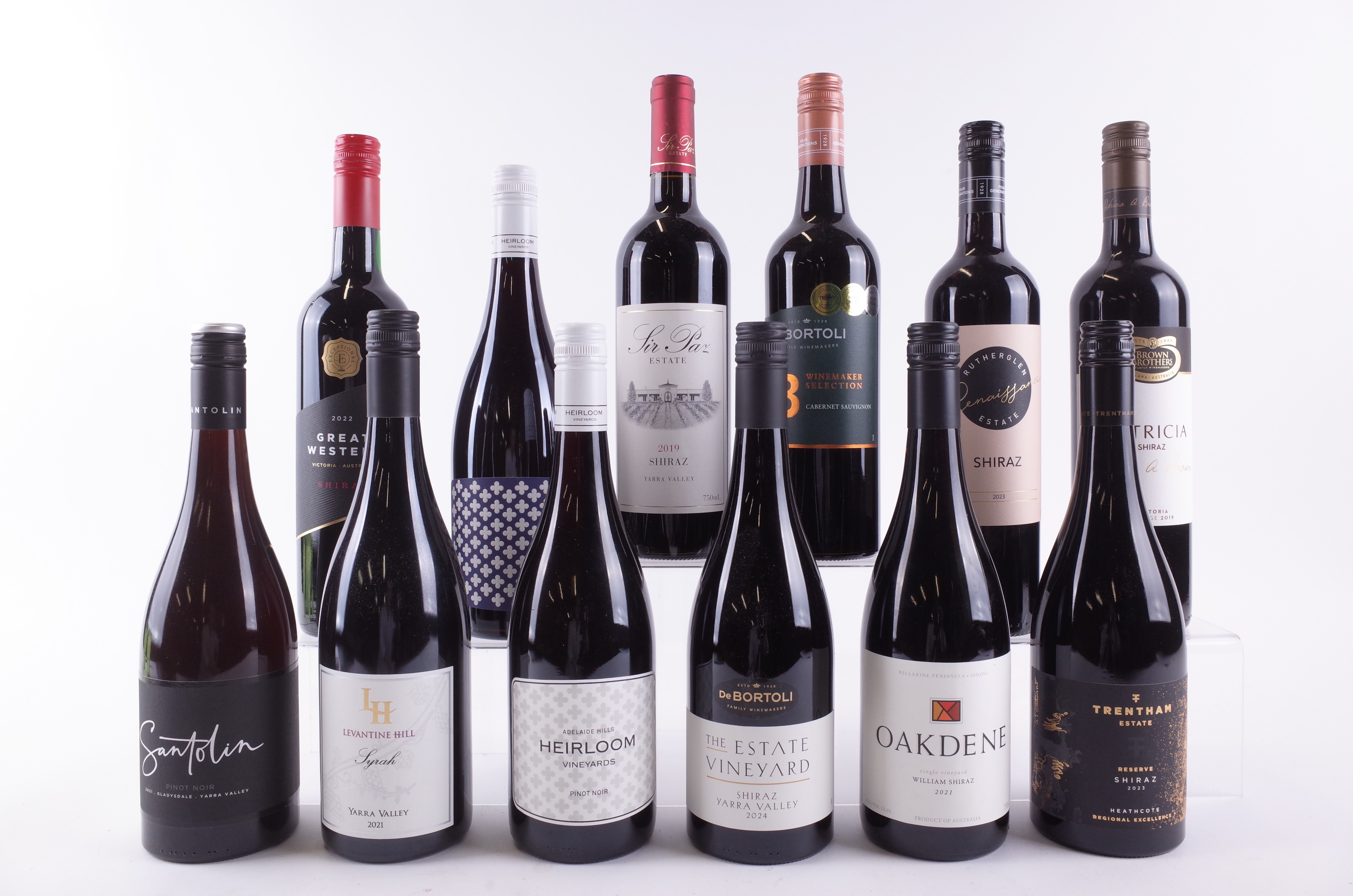 Santolin Pinot Noir 2021; Levantine Hill Syrah 2021; Heirloom Vineyards Pinot Noir 2024 and Alcazar Castle Pinot Noir 2024; De Bertoli The Estate Vineyard Shiraz 2024 and Winemaker Selection Cabernet Sauvignon 2023; Oakdene William Shiraz 2021; Trentham Estate Reserve Shiraz 2023; Brown Brothers Patricia Shiraz 2019; Rutherglen Estate Rennaissance Shiraz 2023; Sir Paz Estate Shiraz 2019; Asda Exceptional Great Western Shiraz 2022