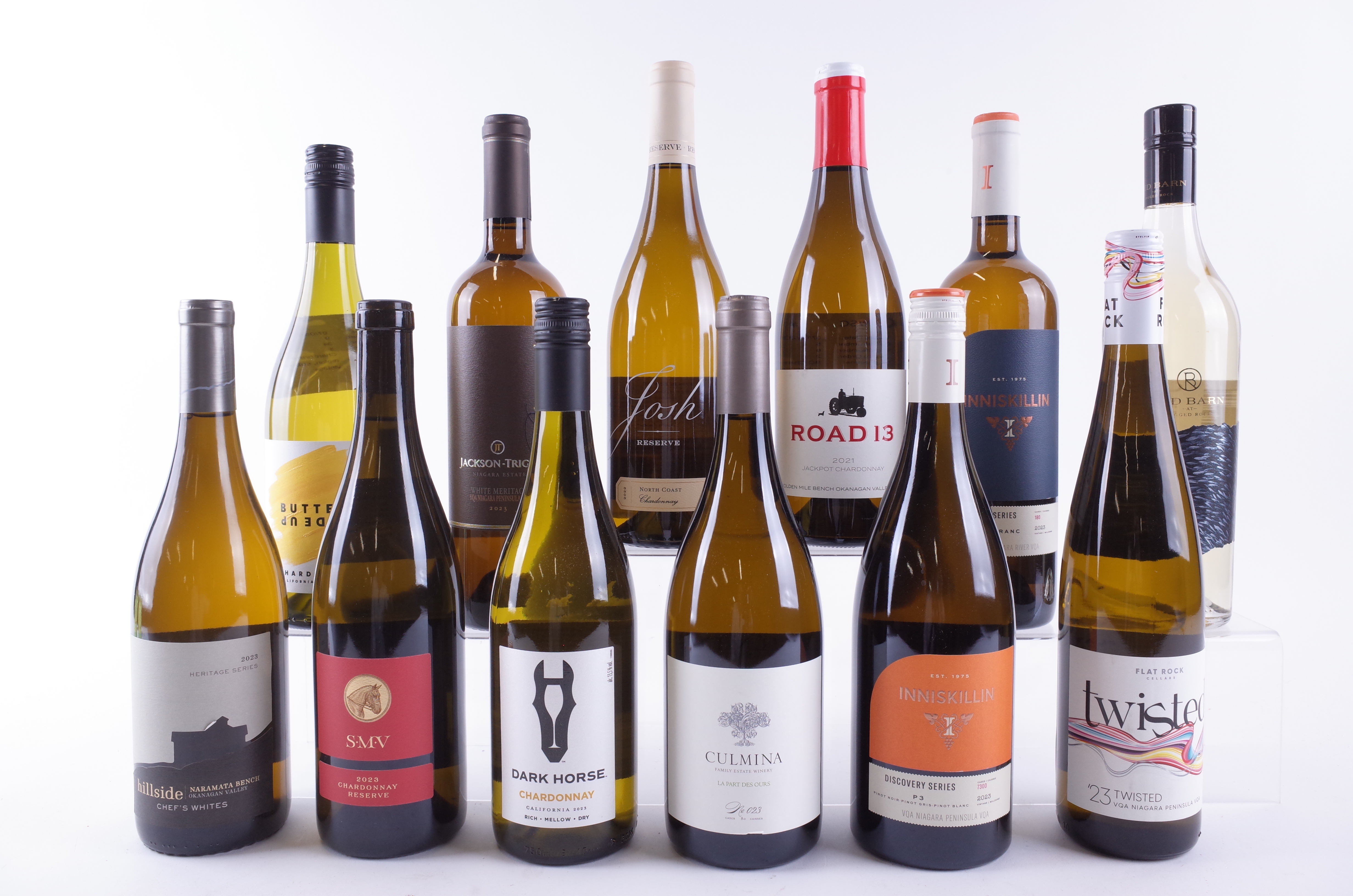 Hillside Chef's Whites Heritage Series 2023; Southwest Mountains Vineyards 'Gold Star' Reserve Chardonnay 2023; Dark Horse Chardonnay 2023; Culmina La Pat des Ours 2023; Inniskillin Discovery Series P3 2023 and Discover Blend Blanc de Franc 2023; Flat Rock Cellars Twisted 2023; Red Barn White Blend 2023; Road 13 Jockpot Chardonnay 2021; Josh Chardonnay 2022; Jackson-Triggs White Meritage 2023; Asda Butter Side Up Chardonnay 2022