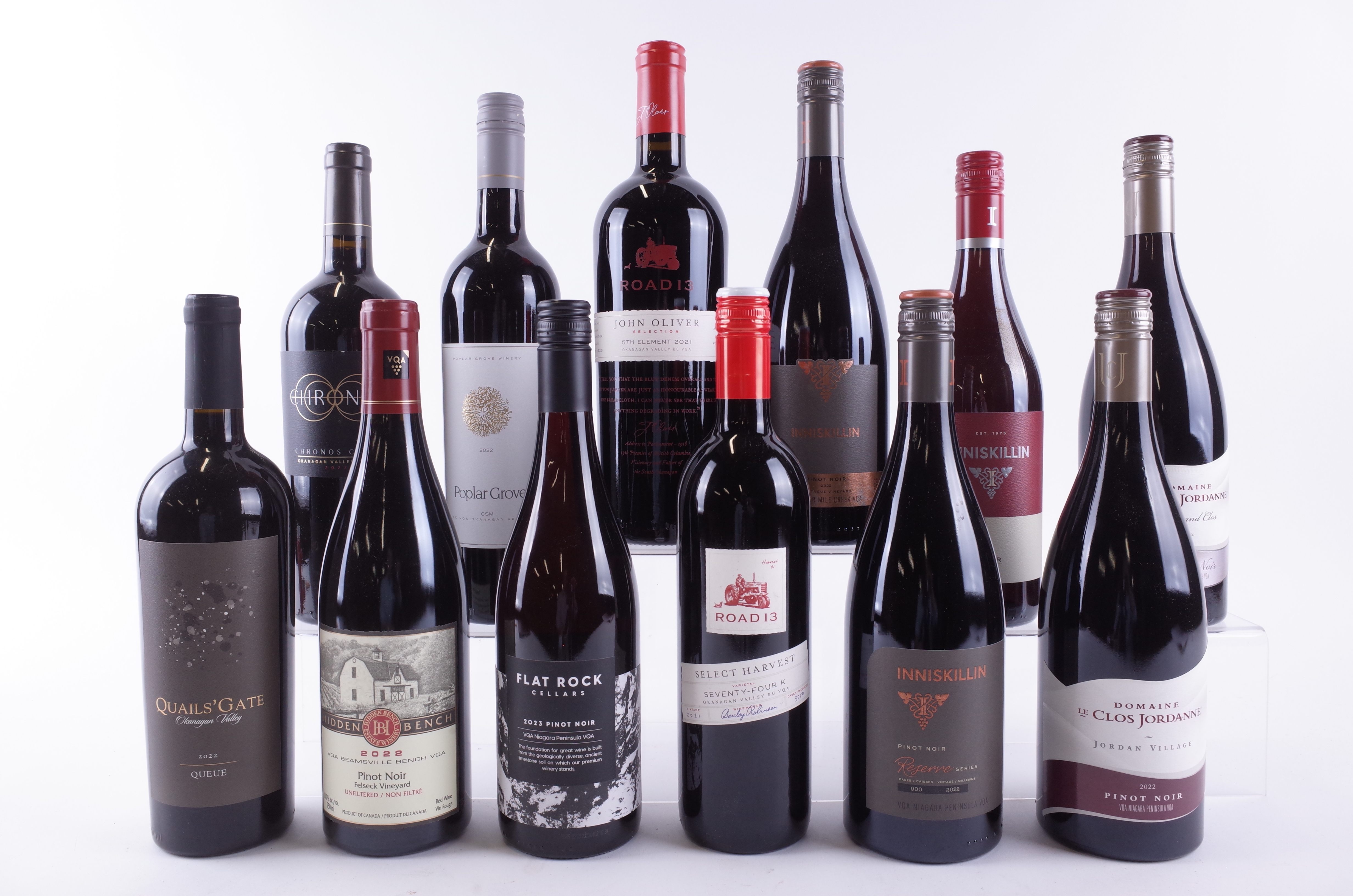 Quails' Gate Queue 2022; Hidden Bench Pinot Noir 2022; Flat Rock Cellars Pinot Noir 2023; Road 13 Select Harvest Seventy-Four K 2021 and John Oliver Selection 5th Element 2021; Inniskillin Estate Series Pinot Noir, Reserve Series Pinot Noir 2022 and Montague Vineyard Pinot Noir 2022; Domaine Le Clos Jordanne Jordan Village Pinot Noir 2022 and Le Grand Clos Pinot Noir 2022; Poplar Grove CSM 2022; Chronos Winery Chronos Carpo 2022
