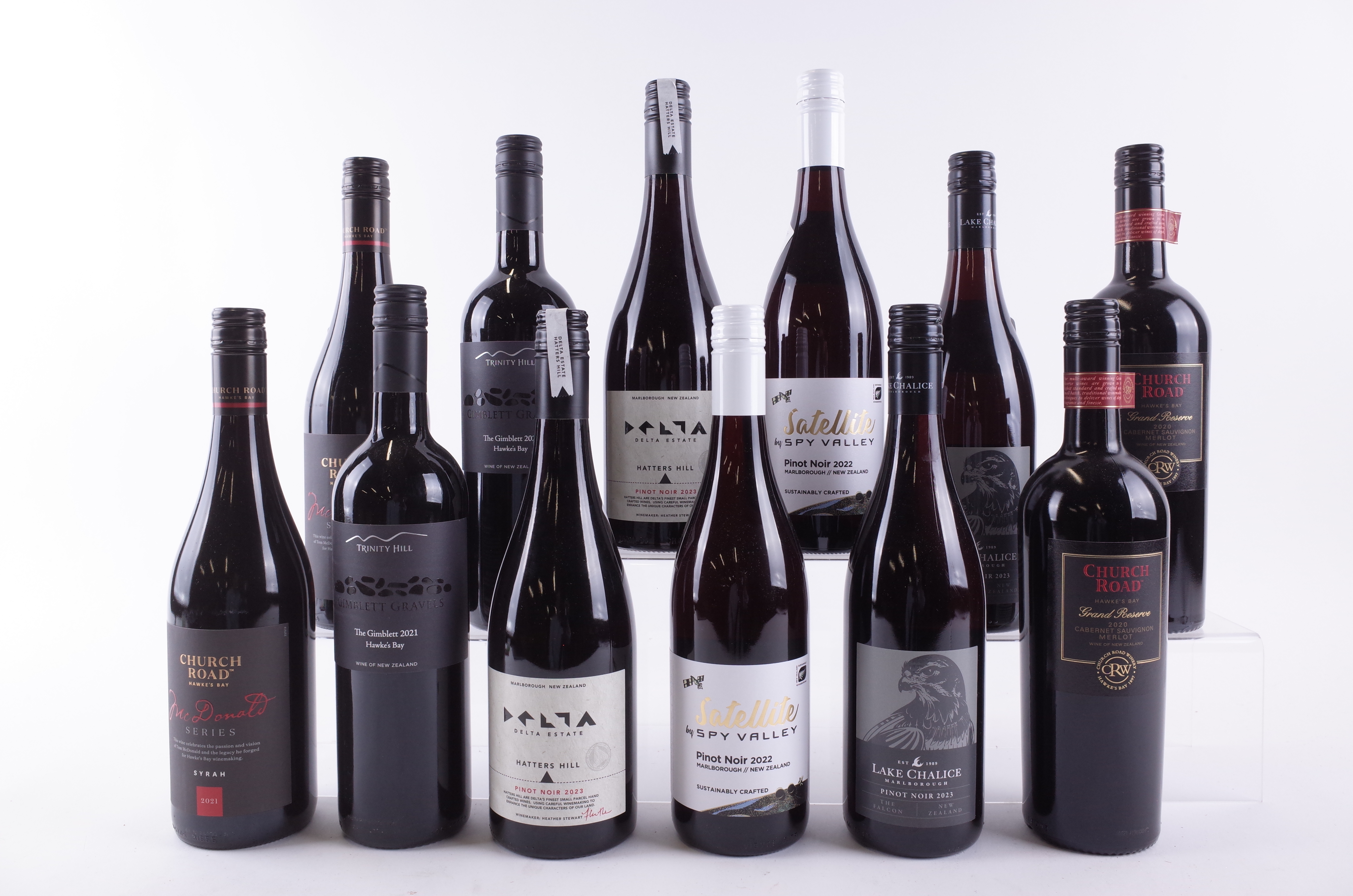 Church Road 2 x McDonald Series Syrah 2021 and 2 x Grand Reserve Cabernet Sauvignon Merlot 2020; Trinity Hill 2 x The Gimblett 2021; Delta Estate Wines 2 x Hatters Hill Pinot Noir 2023; Spy Valley 2 x Satellite Pinot Noir 2022; Lake Chalice 2 x The Falcon Pinot Noir 2023
