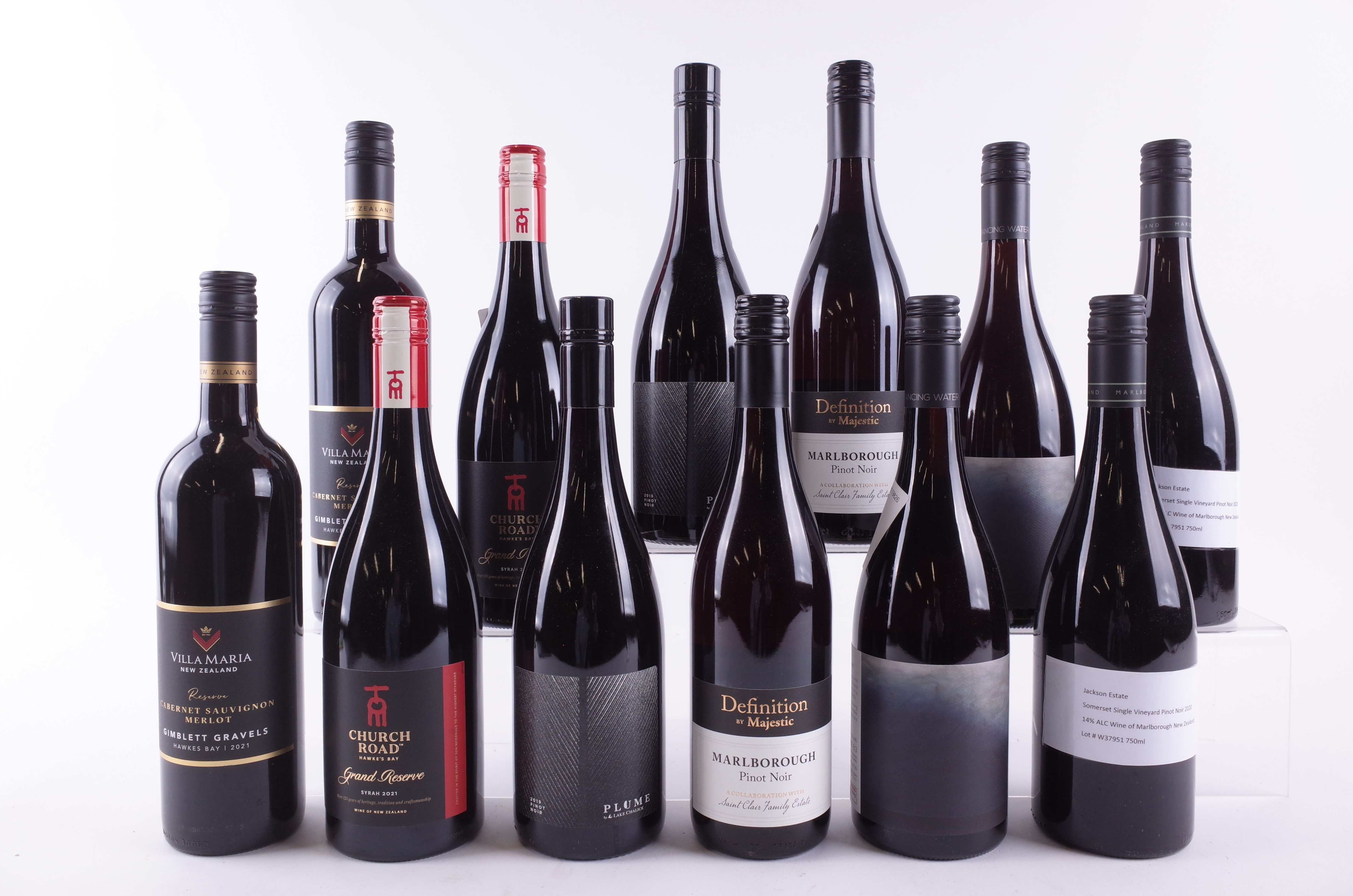 Villa Maria 2 x Reserve Cabernet Sauvignon-Merlot 2021; Church Road 2 x Grand Reserve Syrah 2021; Lake Chalice 2 x Plume Pinot Noir 2019; Saint Clair Family Estate 2 x Definition Pinot Noir 2023; Dancing Water Winery 2 x Artist Series Pinot Noir 2023; Jackson Estate 2 x Somerset Single Vineyard Pinot Noir 2020