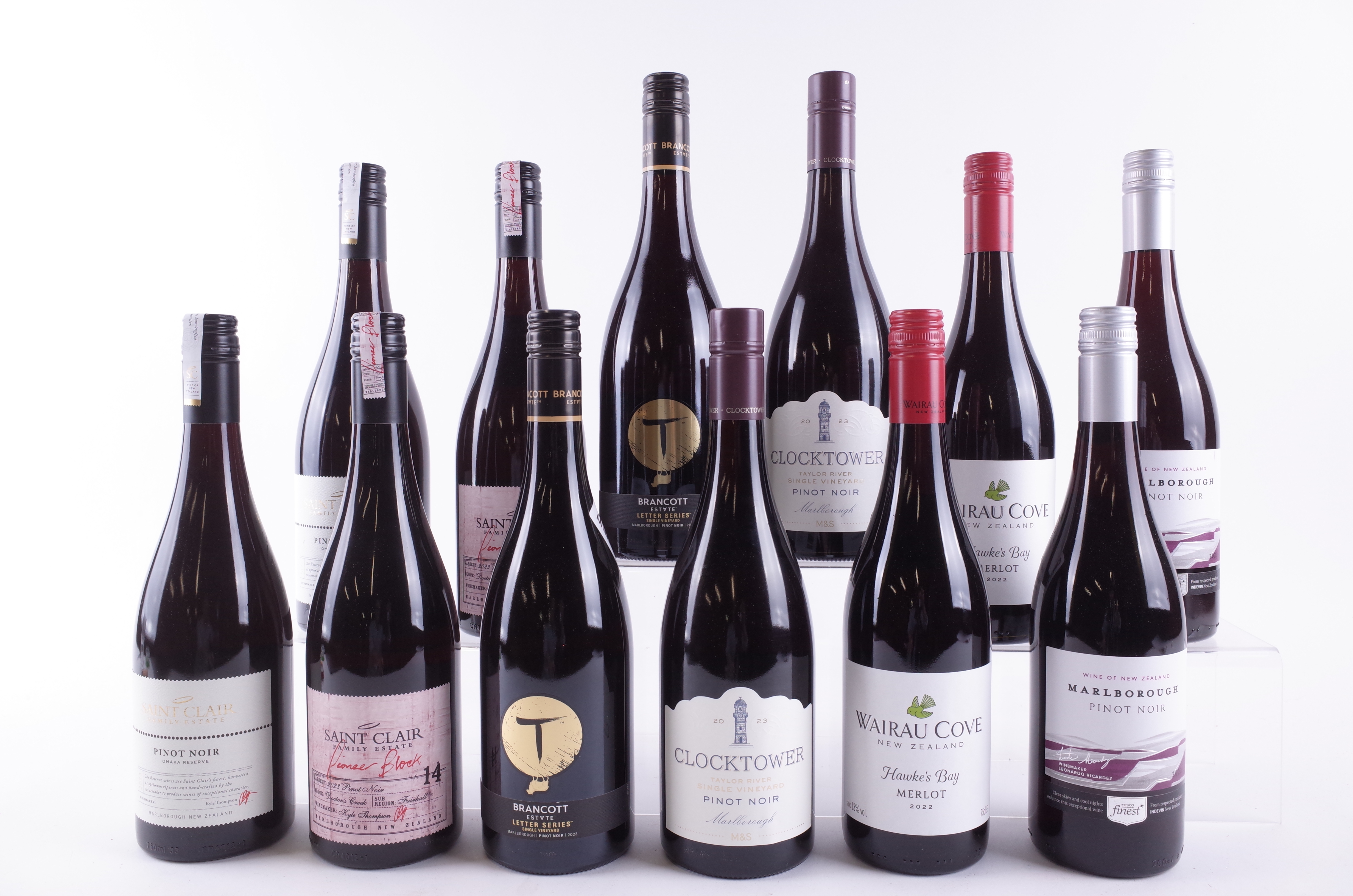 Saint Clair Family Estate 2 x Omaka Reserve Pinot Noir 2023 and 2 x Pioneer Block 14 Doctor's Creek Pinot Noir 2023; Brancott Estate 2 x Letter Series T Pinot Noir 2023; Marks + Spencer 2 x Clocktower Pinot Noir 2023; Indevin 2 x Wairau Cove Merlot 2022 and 2 x Tesco Finest Pinot Noir 2023