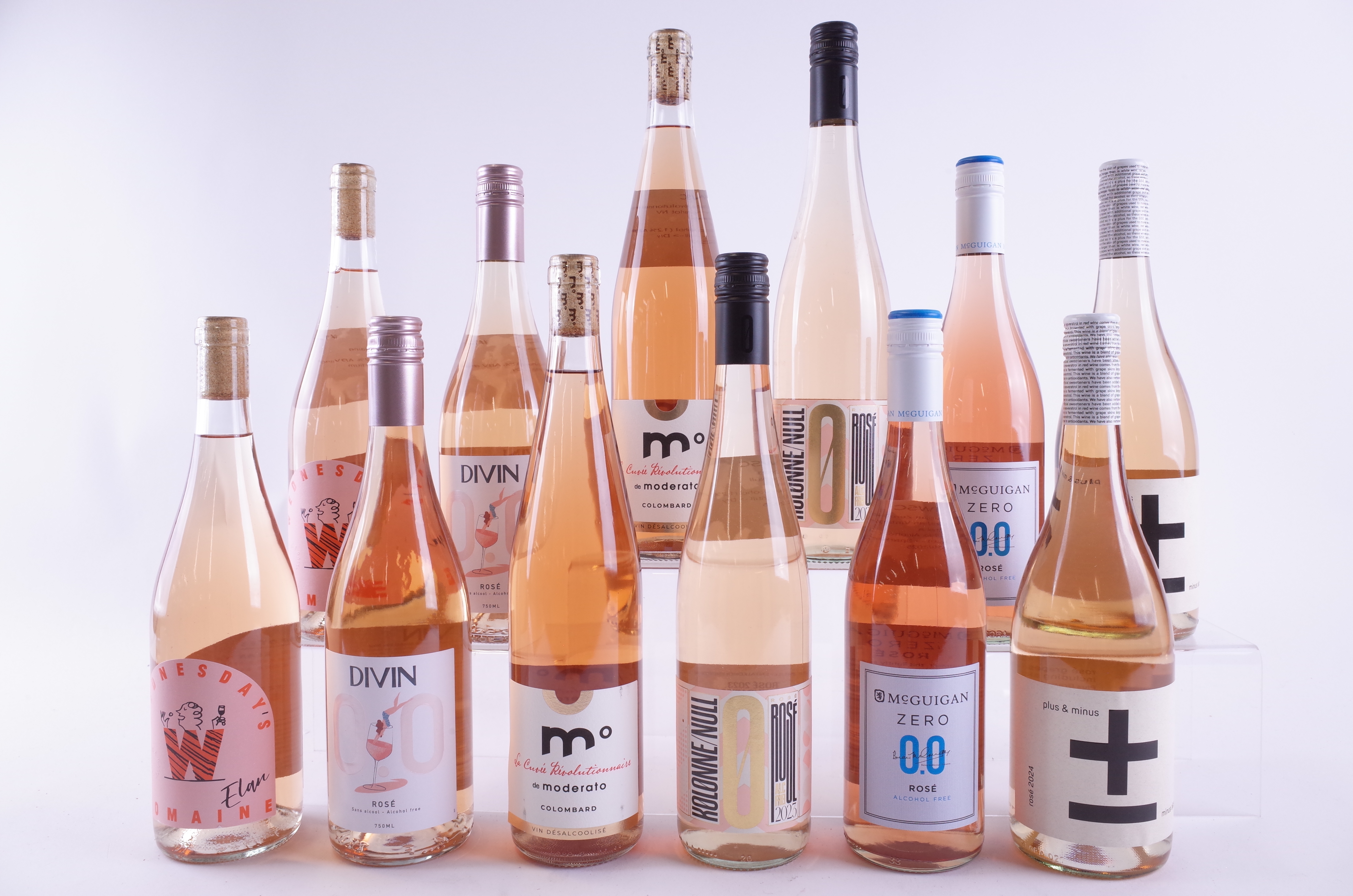 Wednesday's Domaine 2 x Elan NV: DIVIN 2 0.0% NV; Moderato 2 x La Cuvée Révolutionnaire Gros Manseng-Merlot NV; Kolonne Null 2 x 2023; McGuigan 2 x Zero Spritz NV; Fourth Wave Wines 2 x plus + minus 2024
