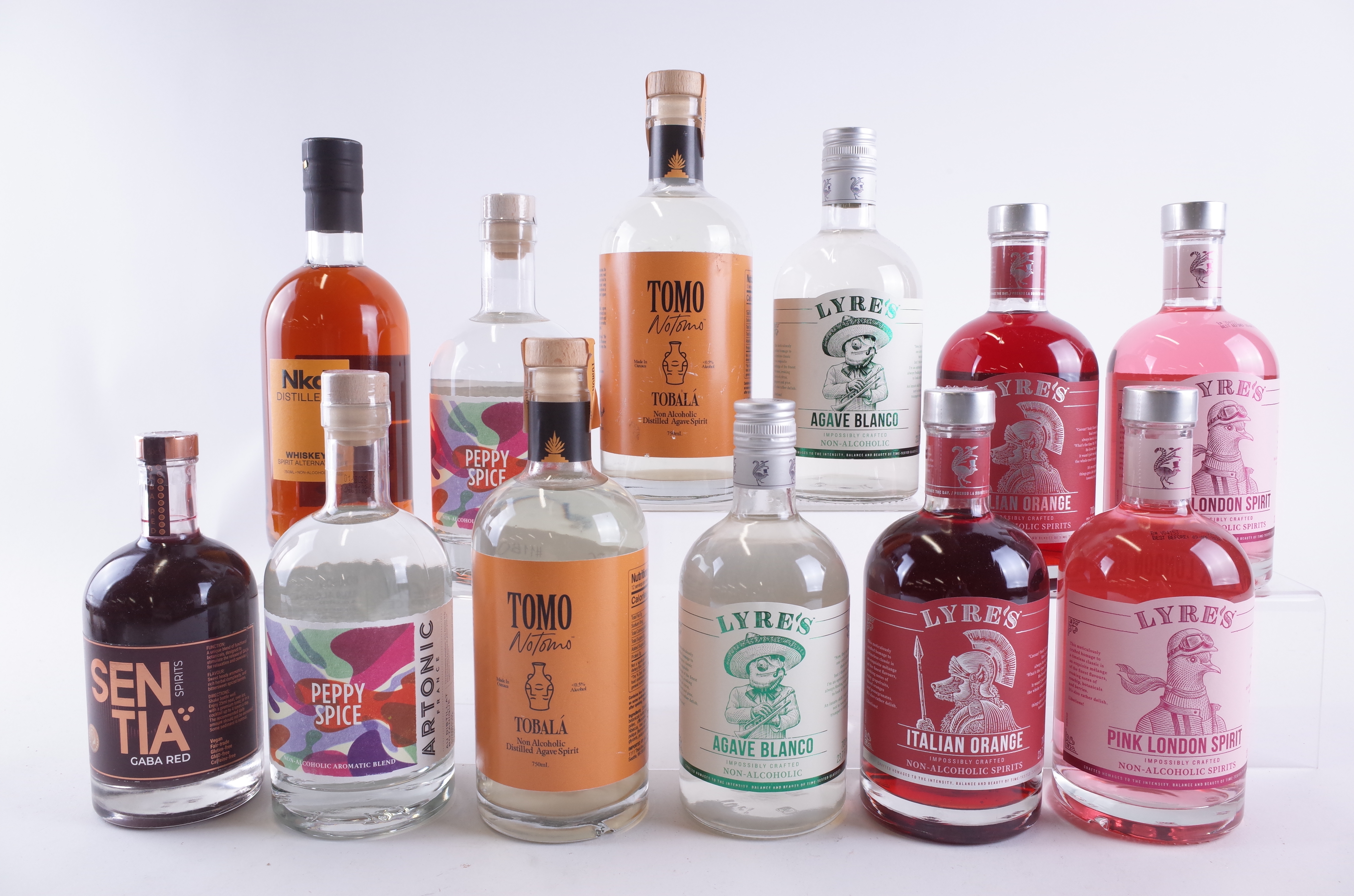 The Social Drinks Company Sentia Spirits Gaba Red; Nkd Distillery Whiskey Spirit Alternative; Routin 2 x Artonic Peppy Spice; Tomonotomo 2 x Tobala Non-Alcoholic Distilled Agave Spirit; Lyre's NA 2 x Agave Blanco, 2 x Italian Orange and 2 x Pink London Spirit