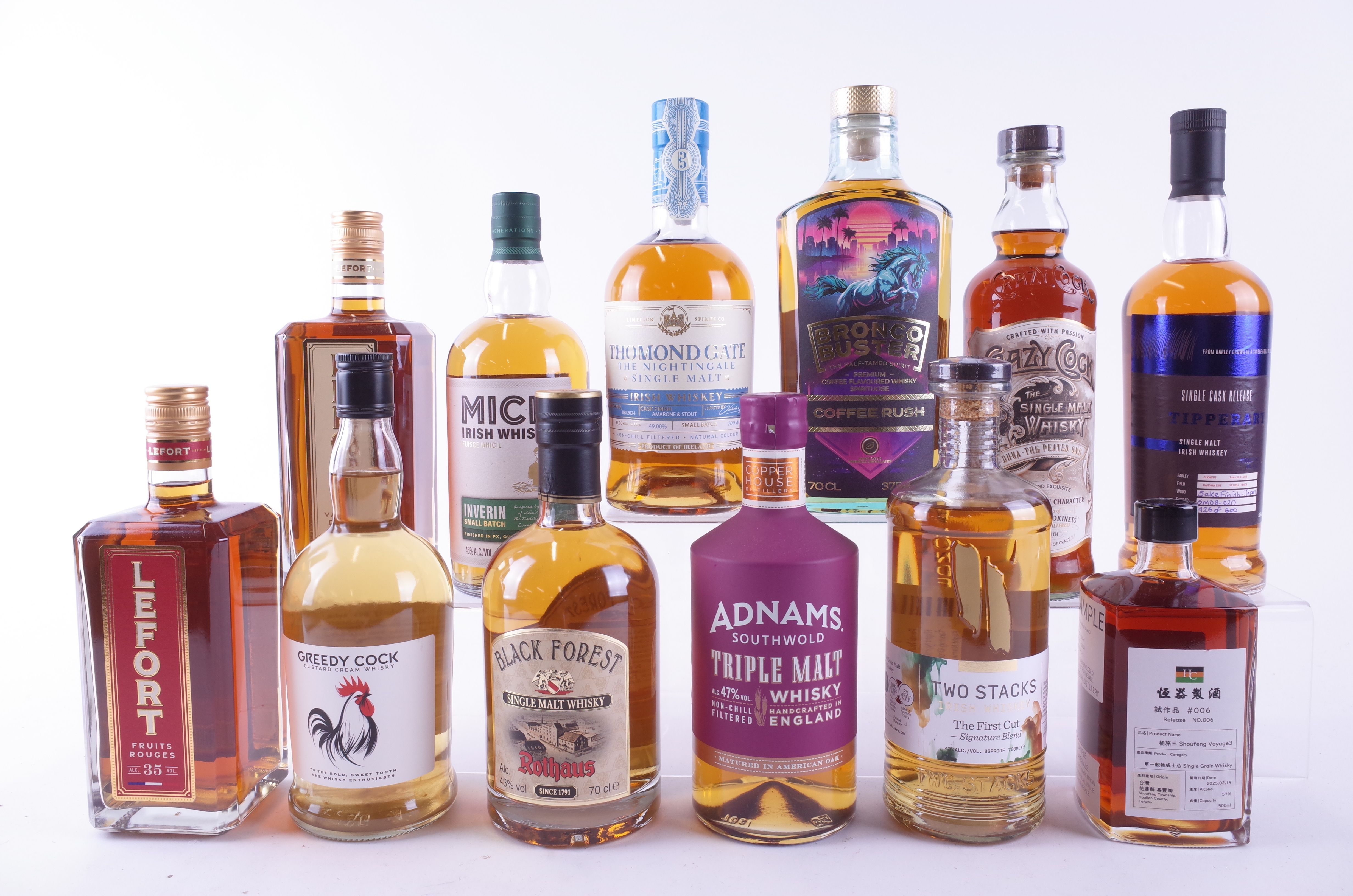 Lefort Fruits Rouges and Vanille Douce; Greedy Cock Custard Cream; Rothaus Black Forest Single Malt; Adnams Triple Malt; Two Stacks The First Cut Signature Blend; Shoufeng Voyage3 Single Grain (50cl); Tipperary Distillery Single Malt Sake Finish; Crazy Cock The Single Malt The Peated One; Bronco Buster Coffee Rush; Thomond Gate The Nightingale Single Malt; Micil Inverin Small Batch