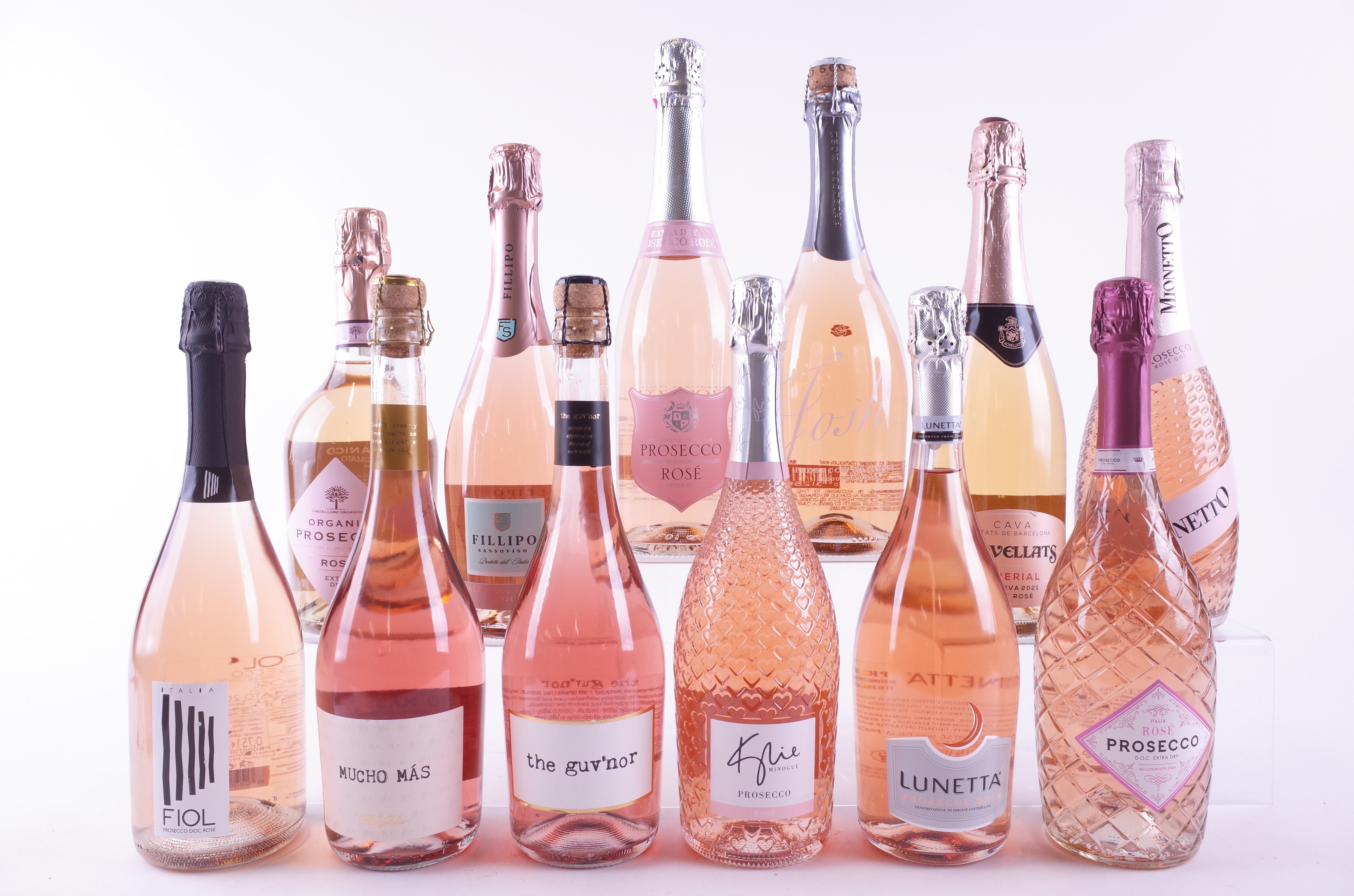Fiol Prosecco 2024; Felix Solis Muco Más and the guv'nor; Kylie Minogue Wines Prosecco Extra Dry 2024; Lunetta Prosecco Extra Dry 2024; Lidl Prosecco Extra Dry 2024; Mionetto Prosecco; Rovellats Imperial Cava Brut Reserva 2021; Josh Prosecco; Spar Prosecco Extra Dry 2024; Fillipo Sansovino Prosecco 2024; Aldi Organic Porsecco Extra Dry 2023