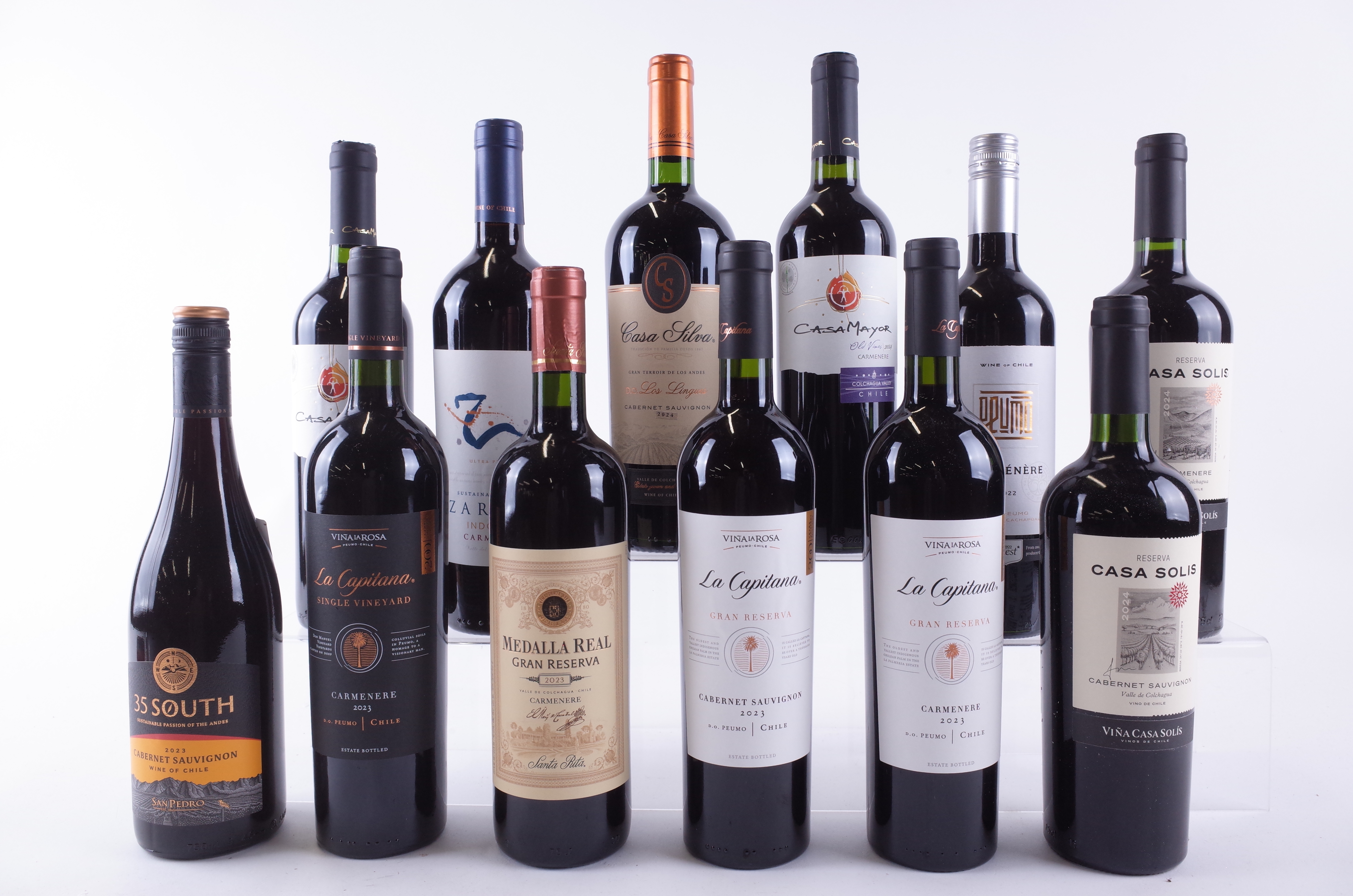 San Pedro 35 South Cabernet Sauvignon 2023; Viña La Rosa La Capitana Single Vineyard Carménère 2023 and 2 x La Capitana Gran Reserva Cabernet Sauvignon 2023; Santa Rita Medalla Real Gran Reserva Carménère 2023; Viña Casa Solís 2 x Casa Solis Cabernet Sauvignon Reserva 2024; Tesco Finest Peumo Carménère 2022; Casa Mayor 2 x Old Vine Carménère 2024; Casa Silva DO Los Lingues Cabernet Sauvignon 2024; Indomitable Zardoz Carménère