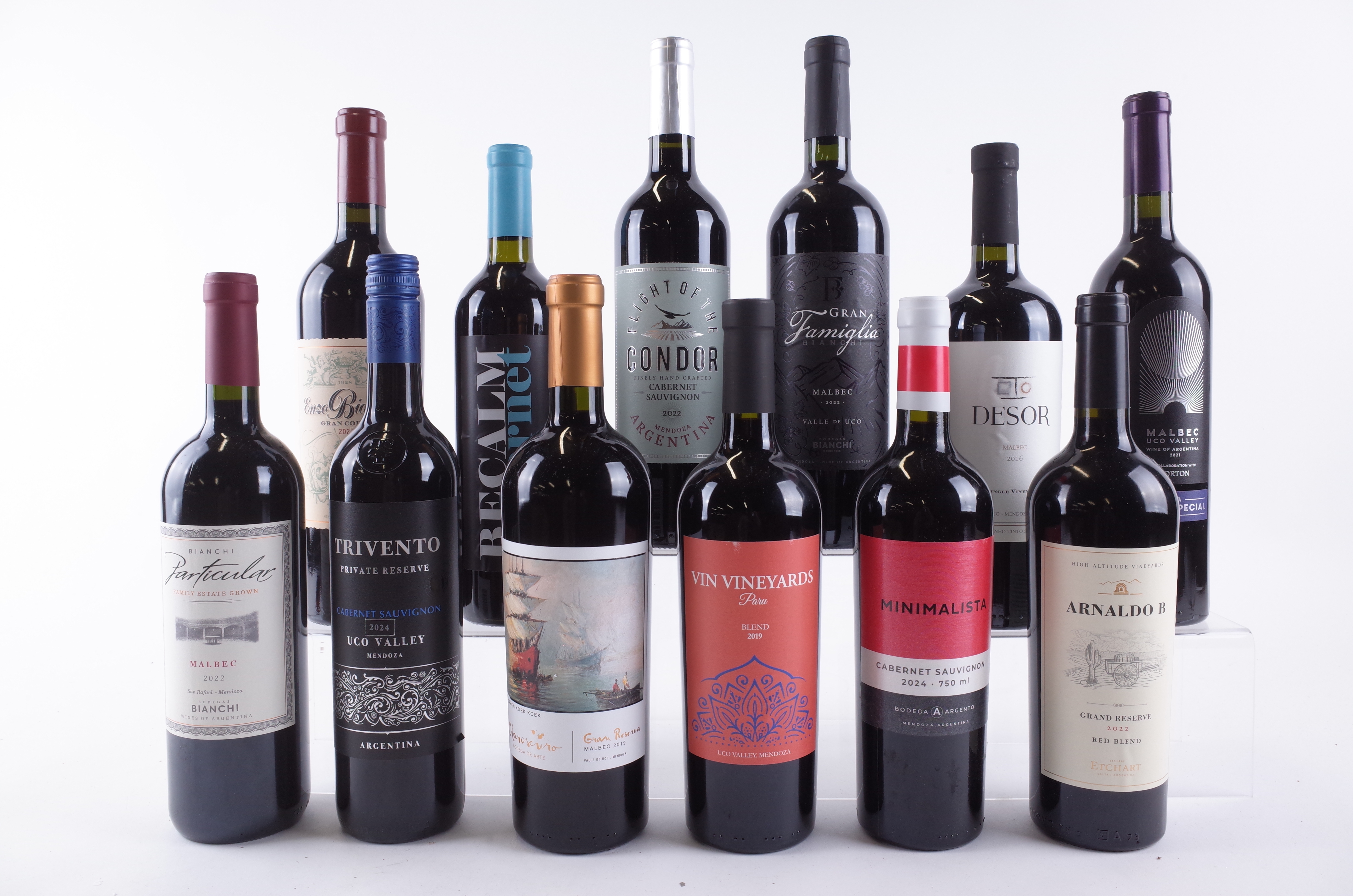 Bodega Bianchi Particular Malbec 2022, Enzo Bianchi Gran Corte 2021 and Gran Famiglia Malbec 2022; Trivento Private Reserve Cabernet Sauvignon 2024; Bodega Claroscura Gran Reserva Malbec 2019; Vin Vineyards Paru Blend 2019; Minimalista Cabernet Sauvignon 2024; Etchart Arnaldo B Gran Reserve Red Blend 2022; Asda Extra Special Malbec 2021; Desor Single Vineyard Malbec 2016; Flight of the Condor Cabernet Sauvignon 2022; La Rural Viñedos Y Bodegas Be Calm Cabernet Sauvignon NV