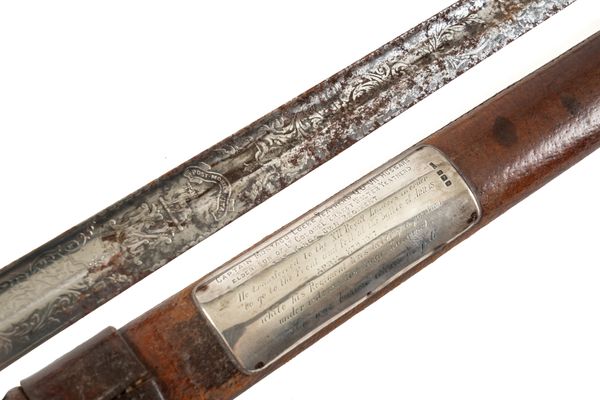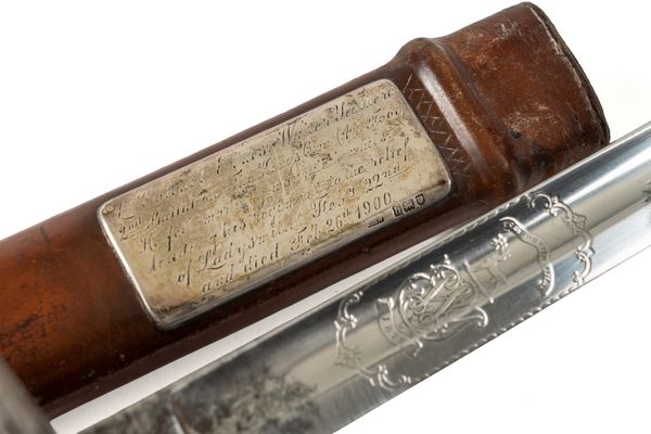 the scabbard with a silver presentation plaque, hallmarked for London 1900.
