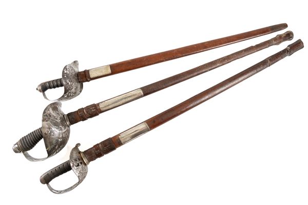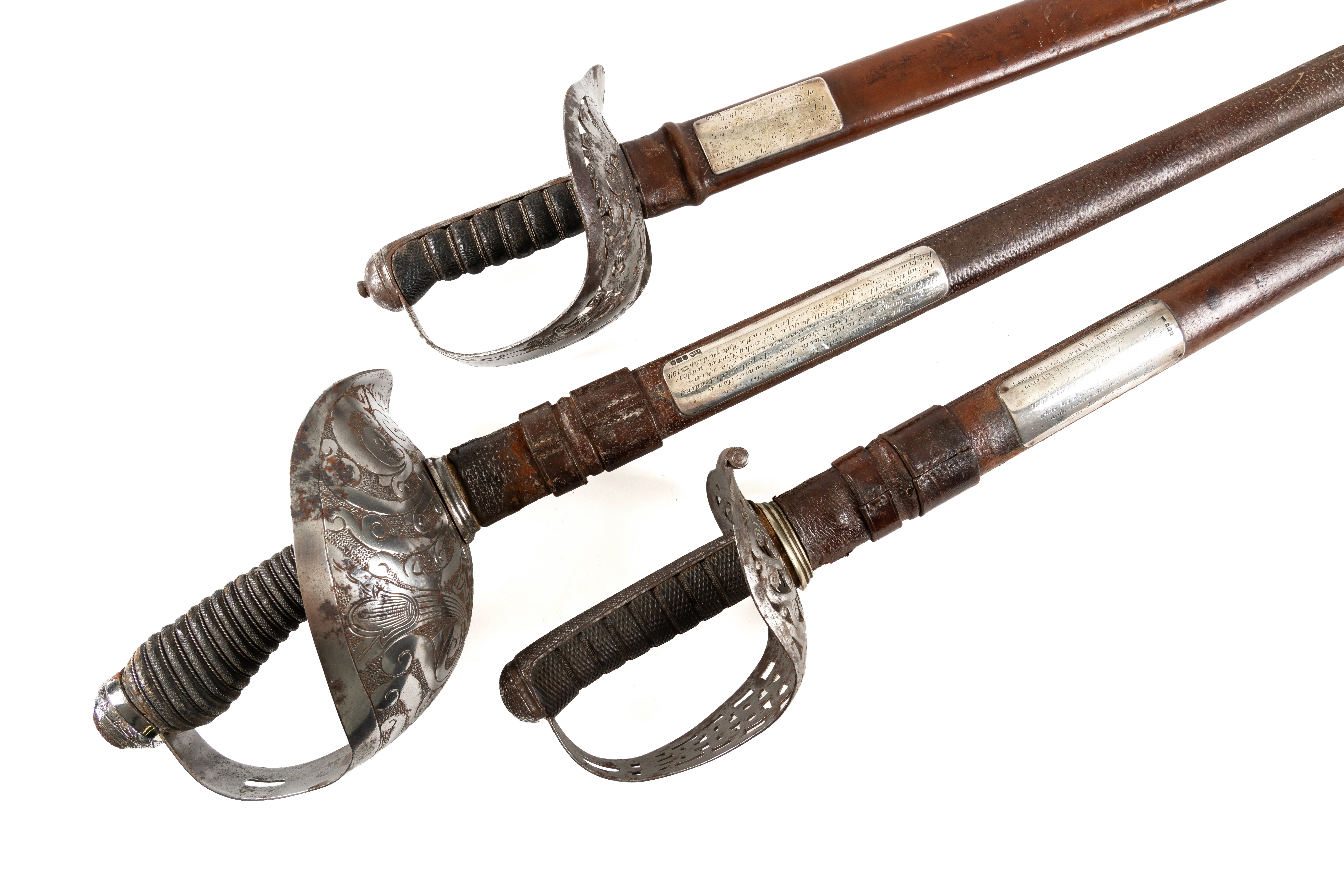 A trio of swords belonging to three members of the same family, spanning service from the Second Boer War through to the Great War, all bearing detailed inscriptions chronicling acts of bravery and sacrifice.