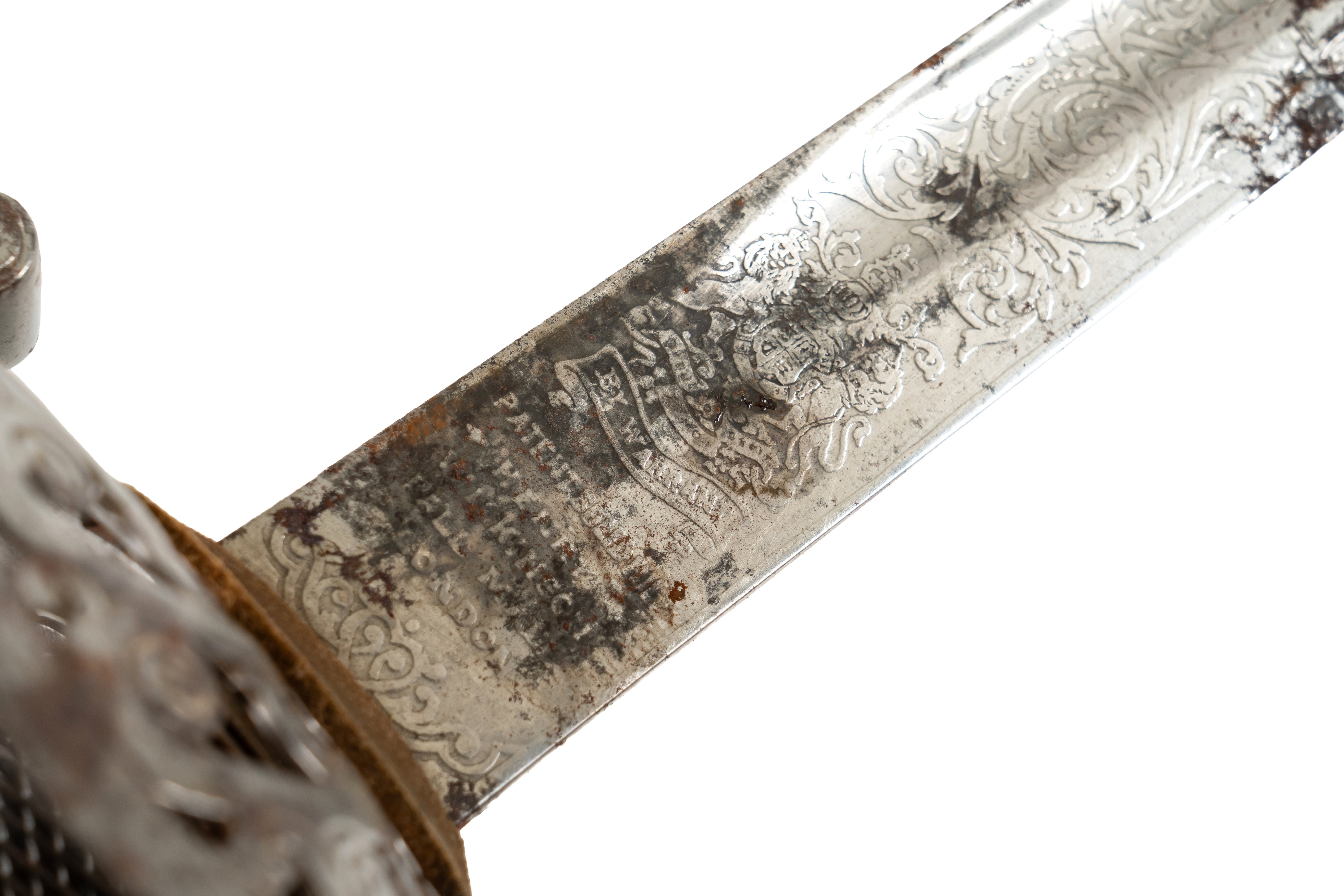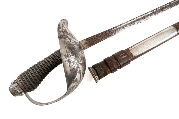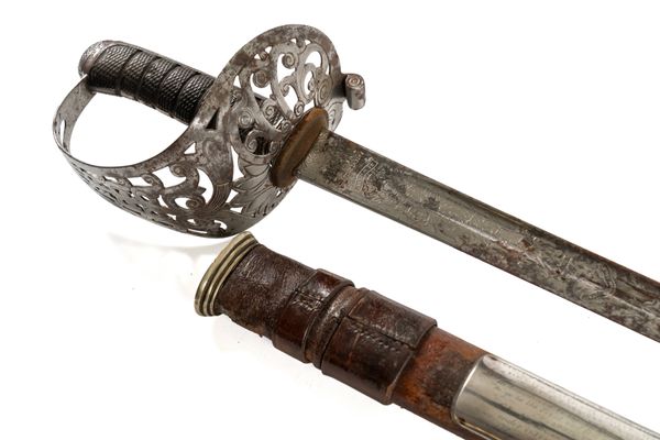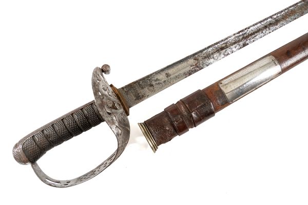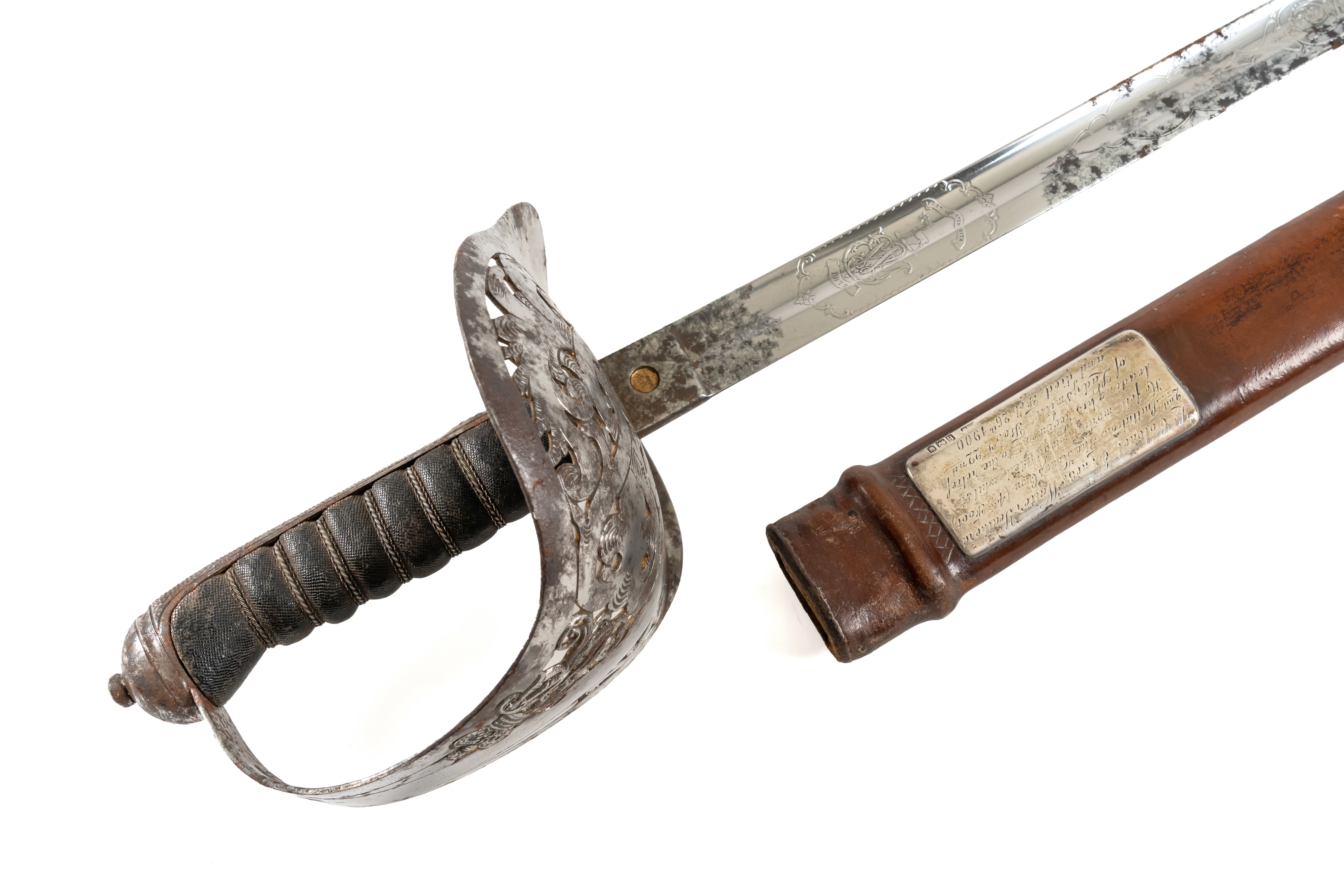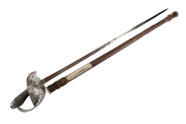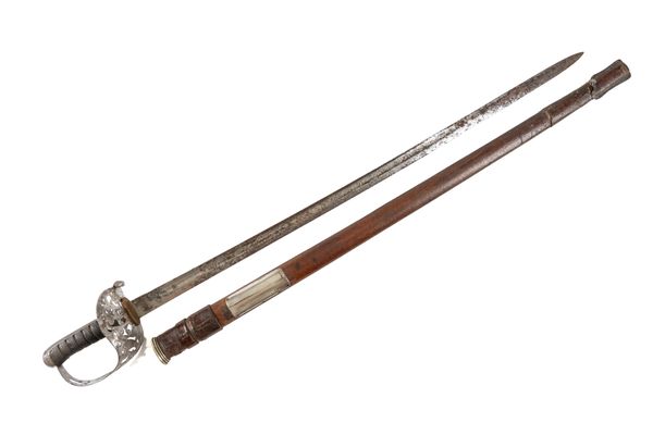 3. A George V 1897 pattern infantry officer’s sword, with pierced and etched bowl guard of scrolling design, shagreen grip with twisted wire binding, housed in its brown leather field service scabbard, the blade etched with foliate decoration and regimental motifs, the scabbard with silver presentation plaque inscribed: