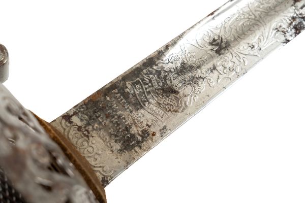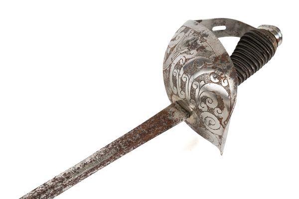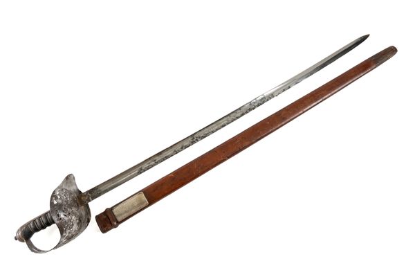 1. A Victorian 1821 pattern Infantry officer’s sword, the regulation pierced steel hilt with VR cypher beneath a crown, wired sharkskin grip, together with its full dress steel scabbard, the single fullered blade finely etched with scrollwork, crown, cypher, flaming grenade, and inscribed: