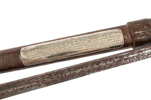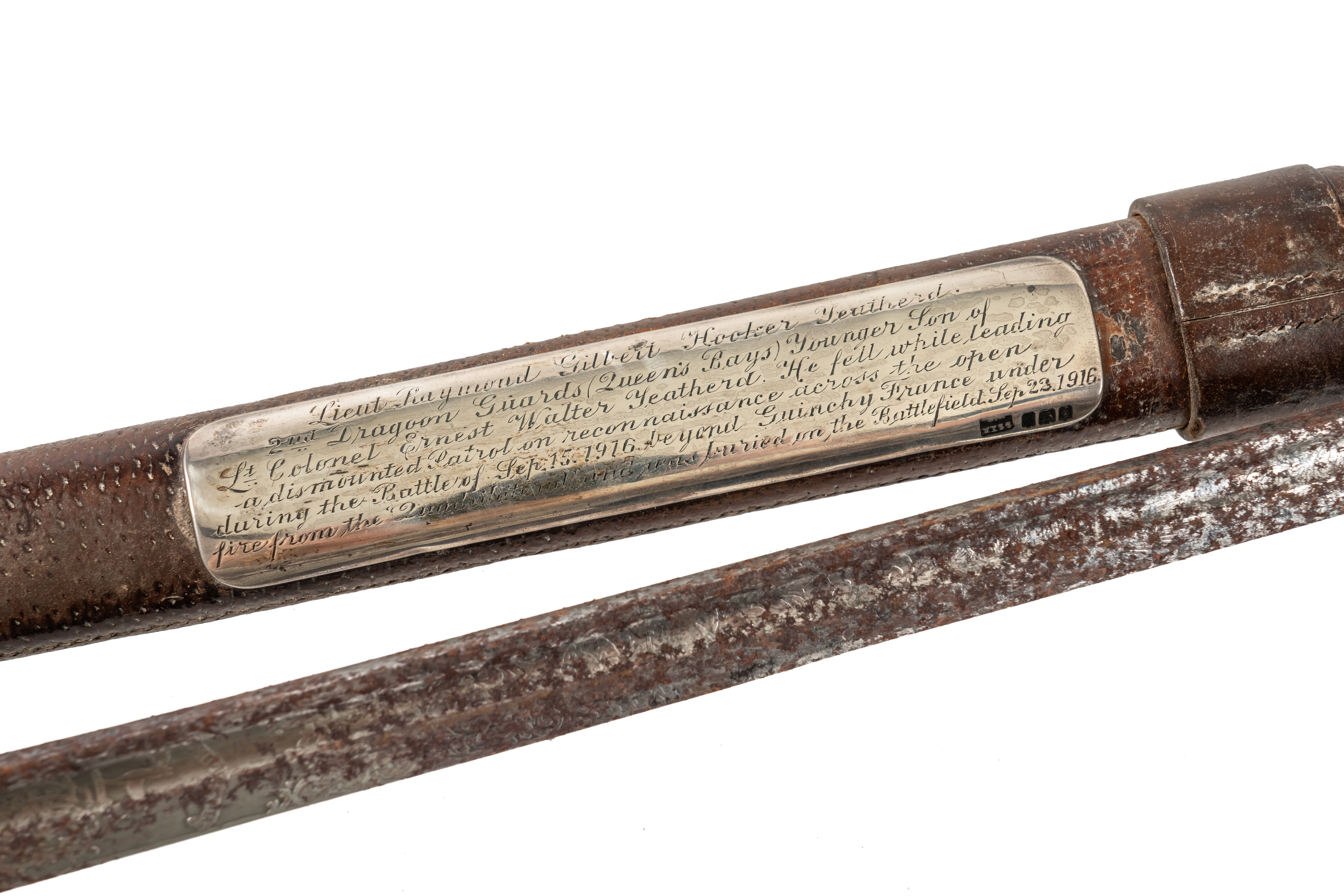 “2nd Lieut. Raymond Lathkel Yeatherd, Grenadier Guards, killed in action in France while leading his platoon during the Battle of September 15th 1916 at Ginchy, Somme. This sword, presented by his grandmother, was buried on the battlefield Sept. 23rd 1916”,
