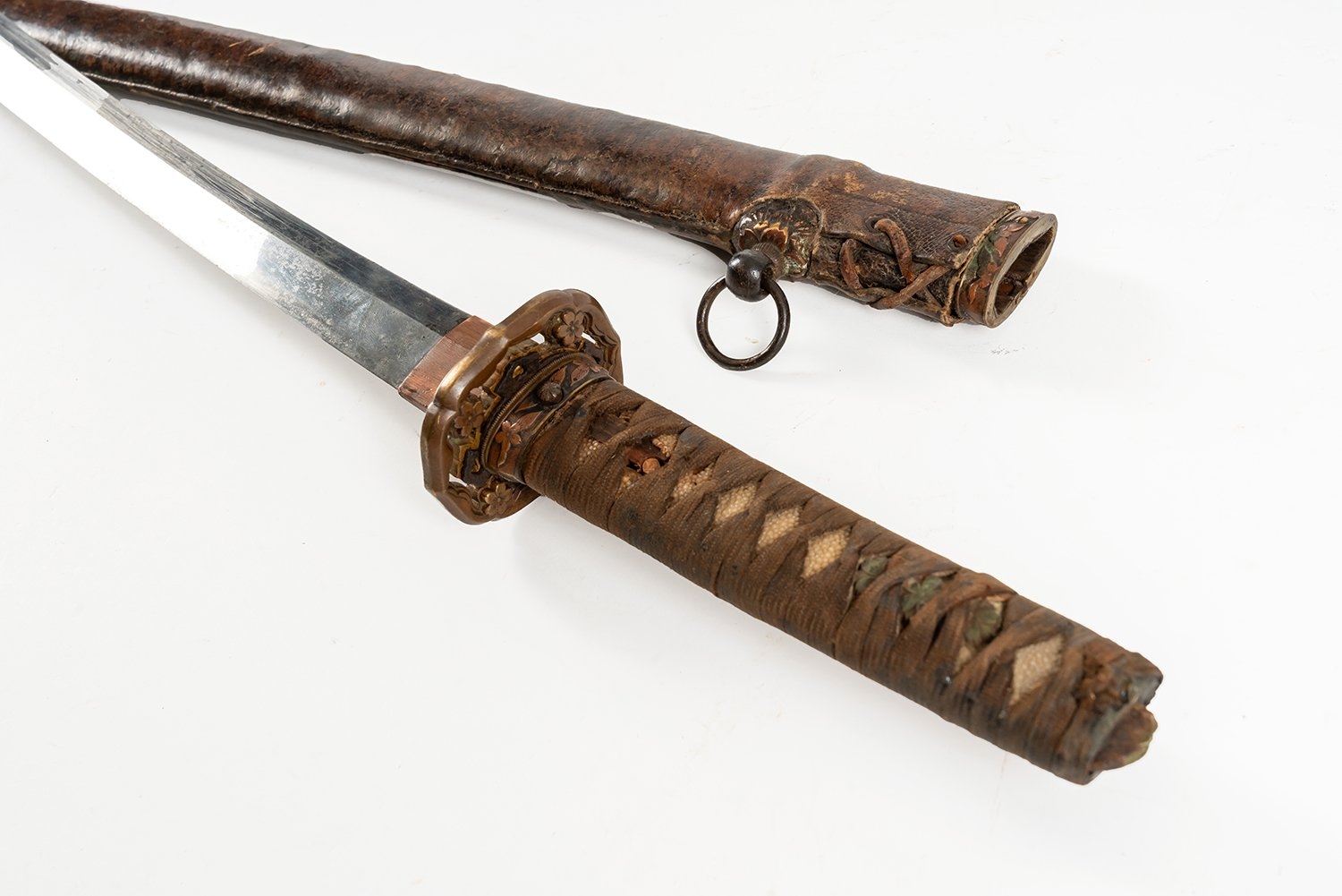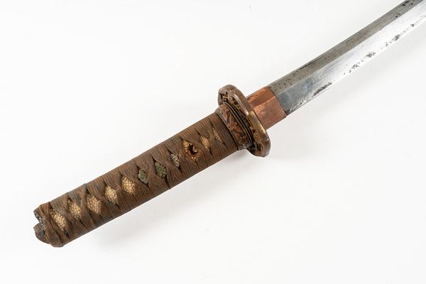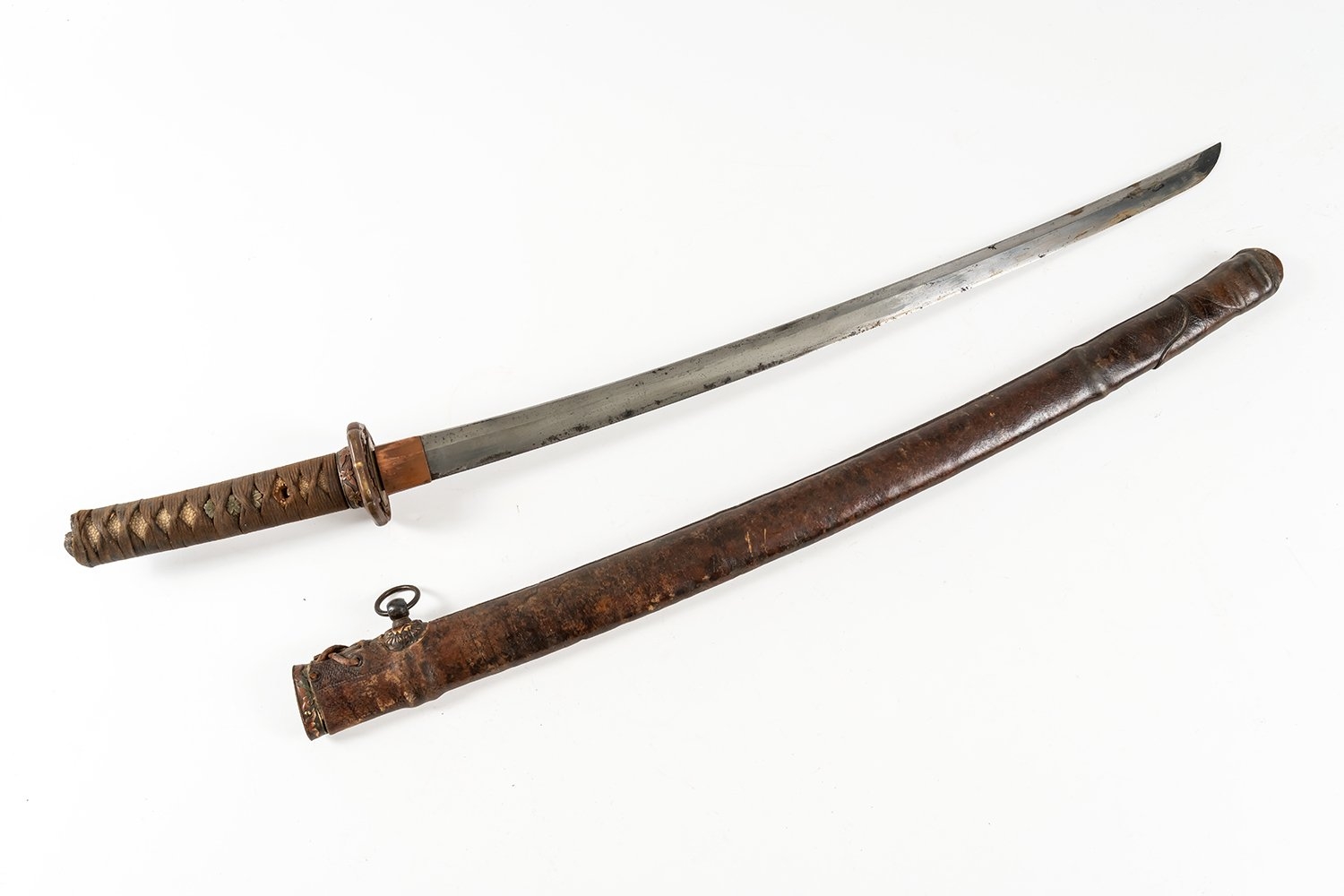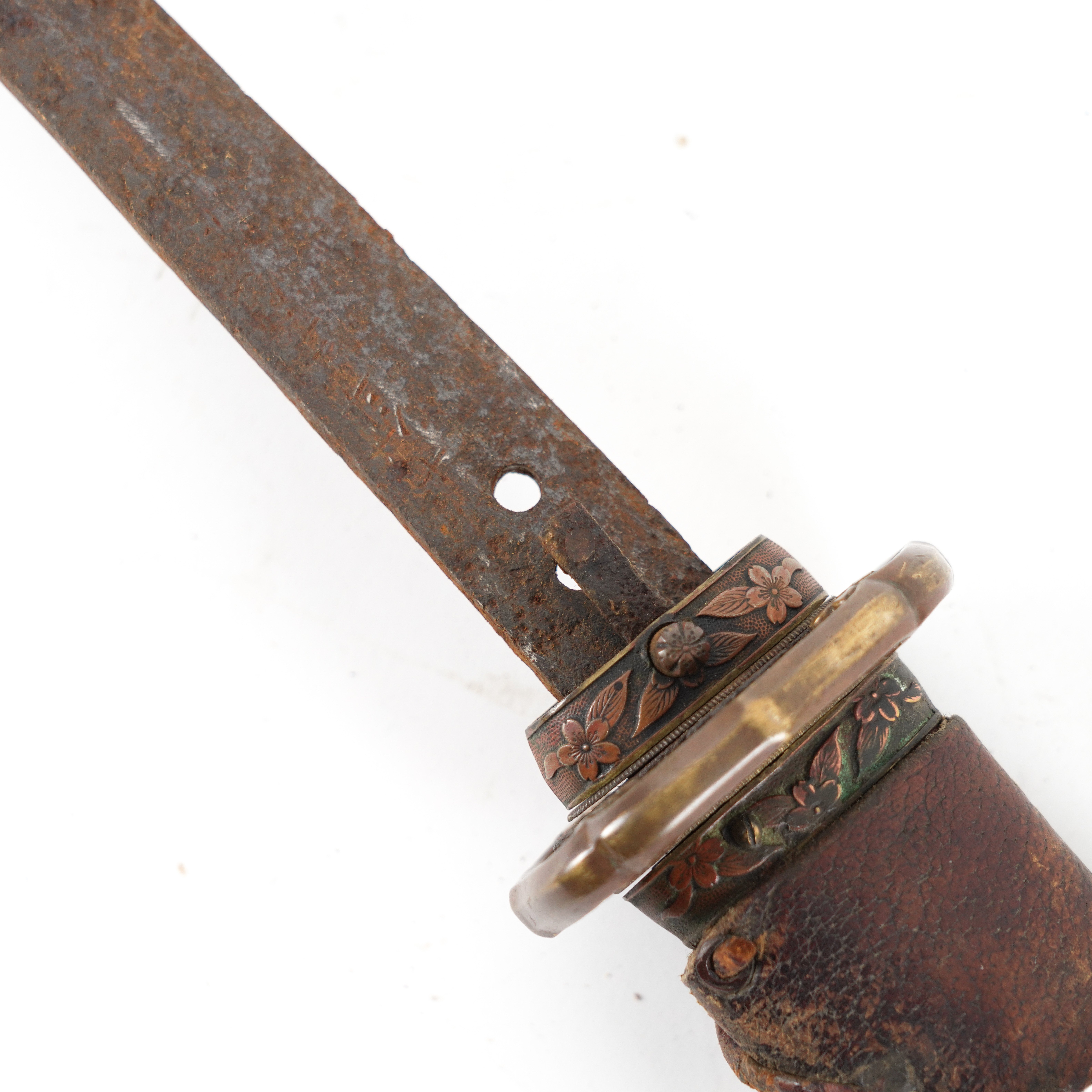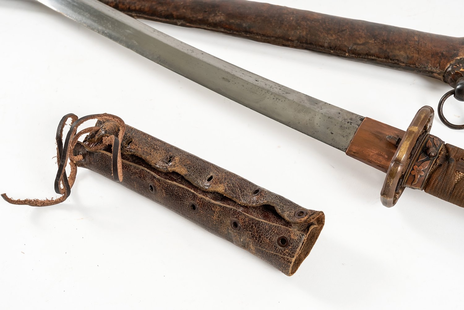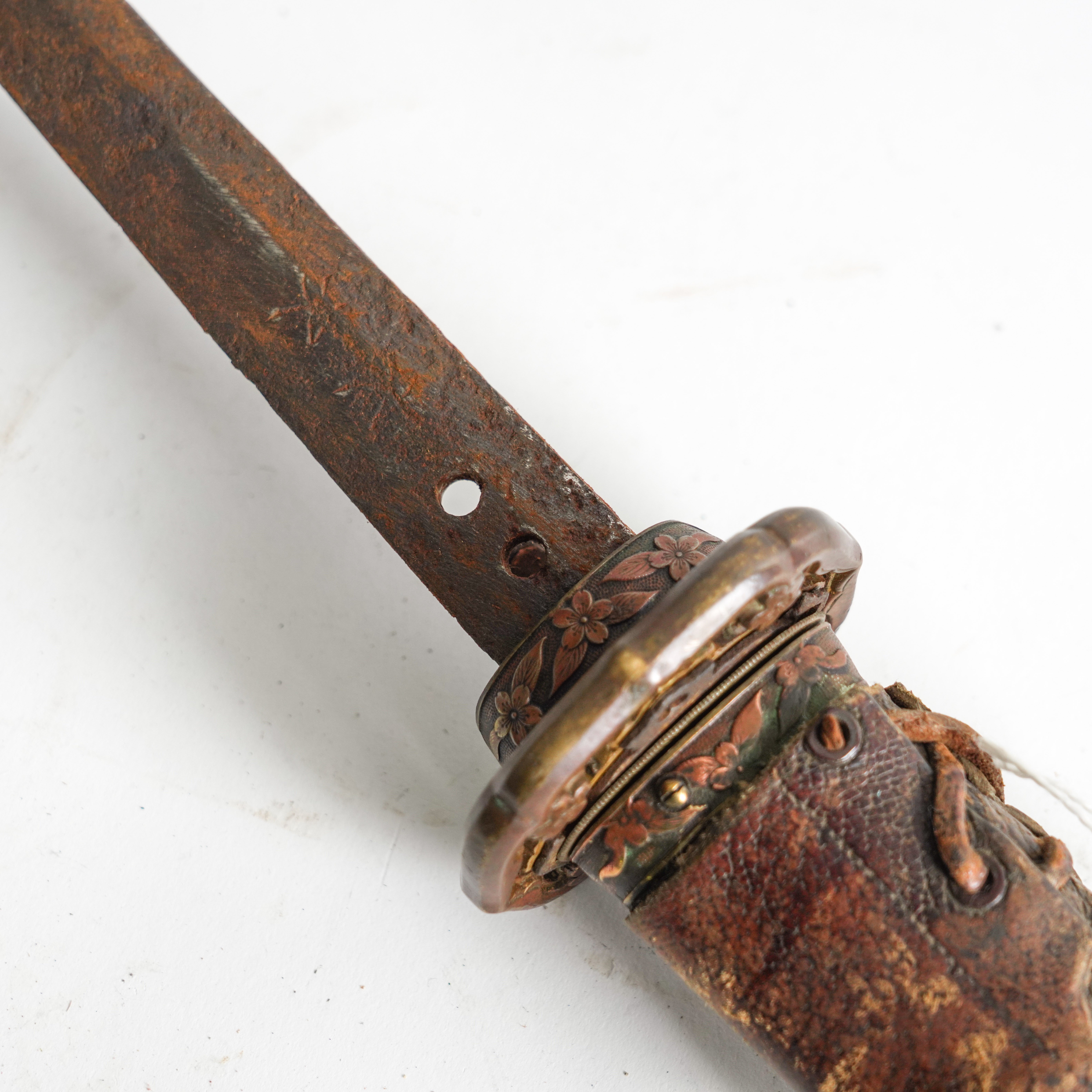 A World War II period shin-gunto katana with traditional tsuba, brass military mounts, and ray-skin grip bound with brown silk. The tang shows two holes, with signs of earlier blade remounting. Complete with leather-covered scabbard and original leather field combat cover. The tang bears a two-hole mounting (niju mekugi-ana), suggesting the blade may be older than its WWII-era shin-gunto mounts. The mei (signature) appears partially obscured, overall length 93cm
